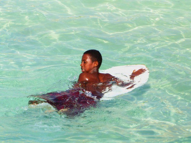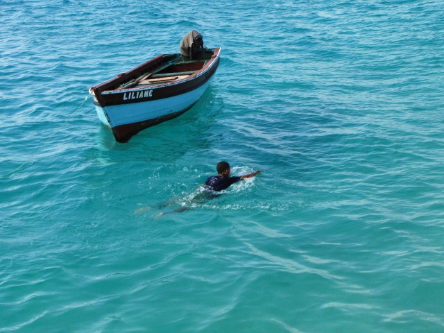 Místní kluci snad mají mezi prsty plovací blány a za ušima žábry, protože jinak nevím, jak bych si vysvětlila ty kousky, co ve vodě provádějí. Narozdíl od Latinské Ameriky, jejíž obyvatelé prostě neplavou, anžto to neumí, Kapverďané se cachtají pravděpodobně pořád a celý rok. Není divu, na Salu se každoročně pořádají mistrovství světa v kitingu, surfingu a windsurfingu.