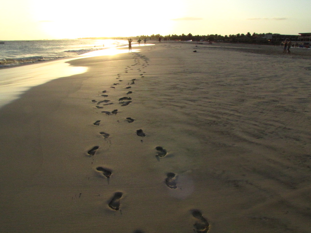 Jak mne znáte, víte, že se v moři nekoupu. Mám ze soli vyrážku, ale ráda se v něm procházím za předpokladu, že si co nejrychleji poté mohu umýt nohy ve sladké vodě;) Za dobu našeho pobytu jsme proto podnikli několik delších či kratších procházek po pláži, která se u vesnice Santa Maria táhne ve velkém půlměsíci, vesnice je uprostřed a na obě strany míří dvě dlouhé písečné kosy, za jednou z nich slunce zapadá, za druhou vychází.