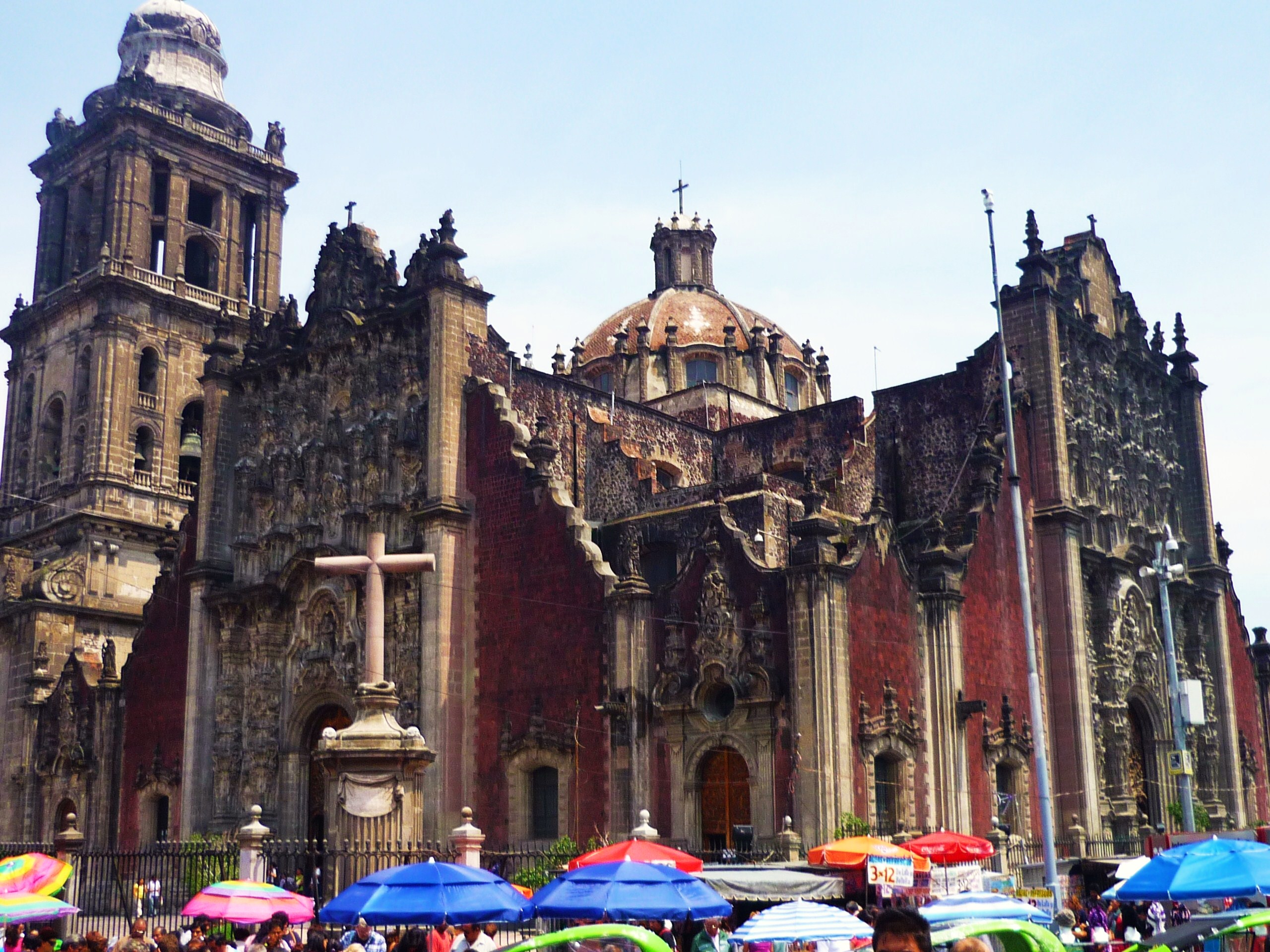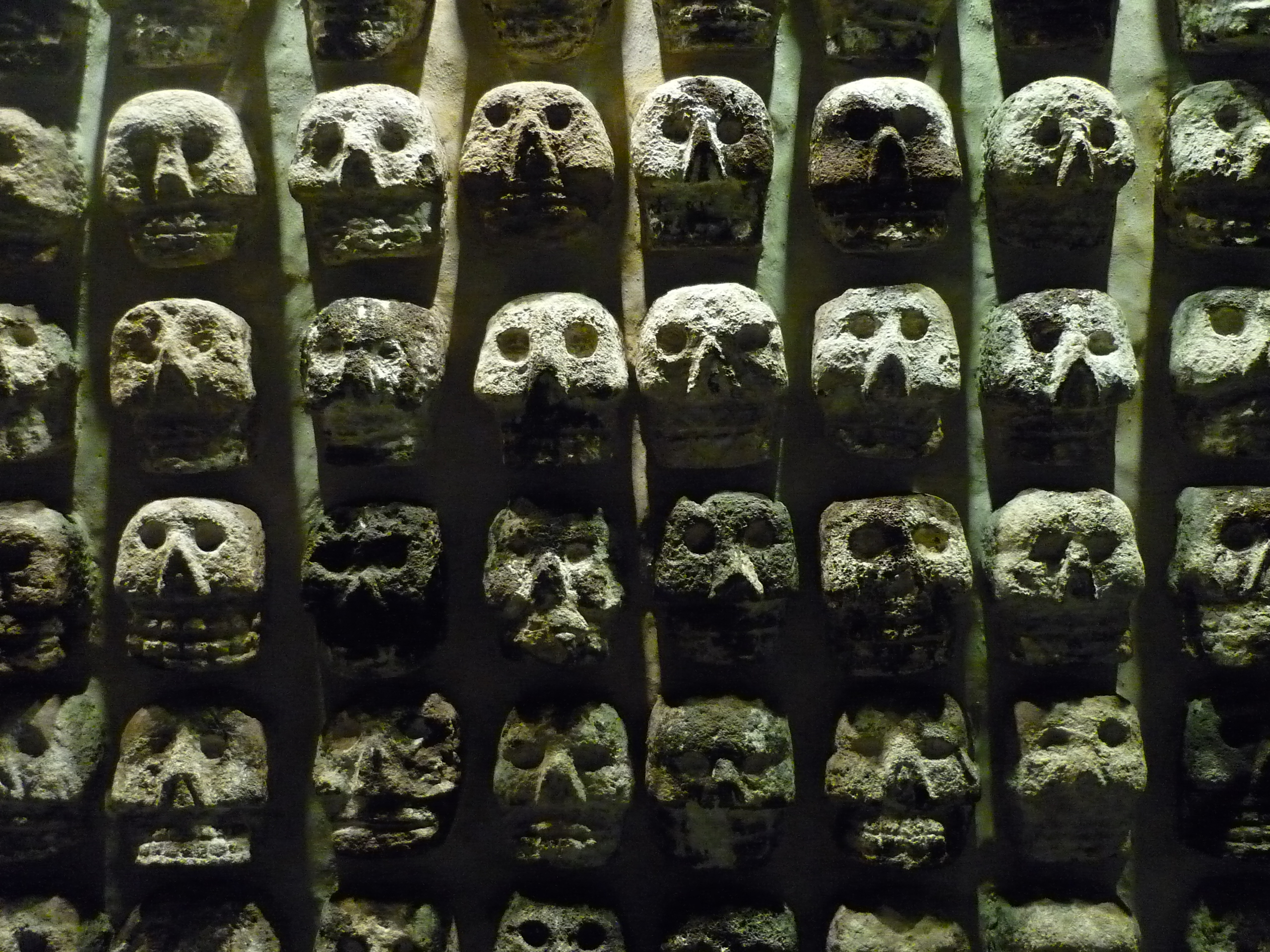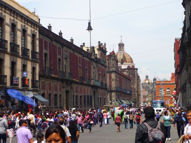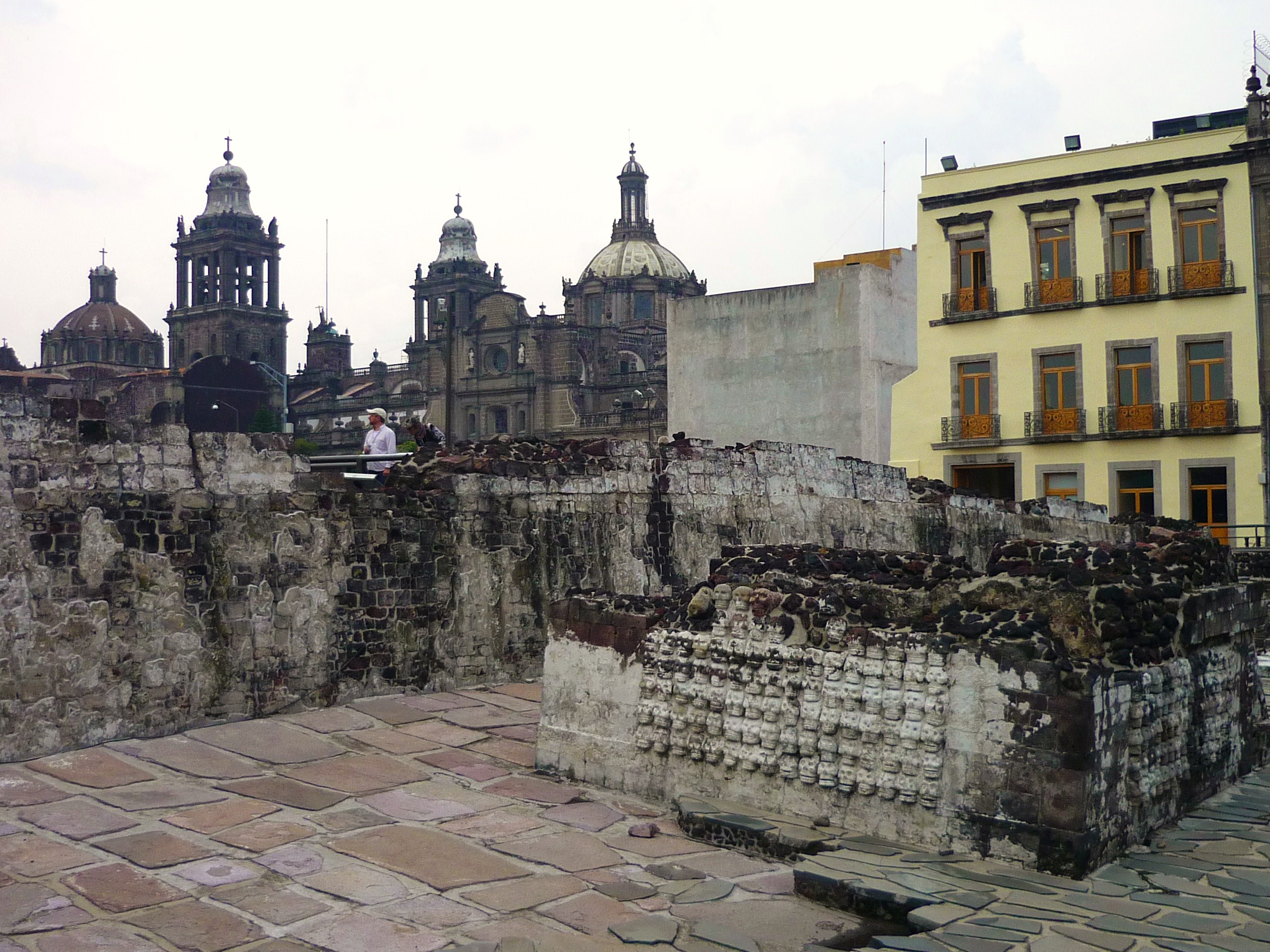 Prošli jsme Catedralu Metropolitana, největší katedrálu v Latinské Americe (dle mého rozhodně ne nejkrásnější), muzeum Templo Mayor i samotný Templo Mayor. Ten byl hlavním chrámem domorodých Mexiků (Aztéků), srdce celé mexické říše v době, kdy město dobyl Cortéz. Chrám byl každých 52 let přestavován, byl na něm navršen chrám nový, a to jak z důvodů religiózních, tak z důvodů ryze praktických – celé hlavní město Mexiků stálo na ostrově a budovy se pomalu potápěly. Je dost těžké se ve vykopávkách vyznat, ale po projití muzea máme trochu jasno. Hlavní bohyní byla Cozolxauhqui, bohyně Měsíce, jejíž slavnou čtyřmetrovou polychromovanou stélu našli archeologové u vchodu chrámu, a která je vystavena právě v tomto muzeu. Je třeba říct, že prolézat vykopávky přímo v centru města, je zážitkem zajímavým a vcelku jedinečným, protože si nevybavuji jiné místo, kde by se něco takového dalo vidět.