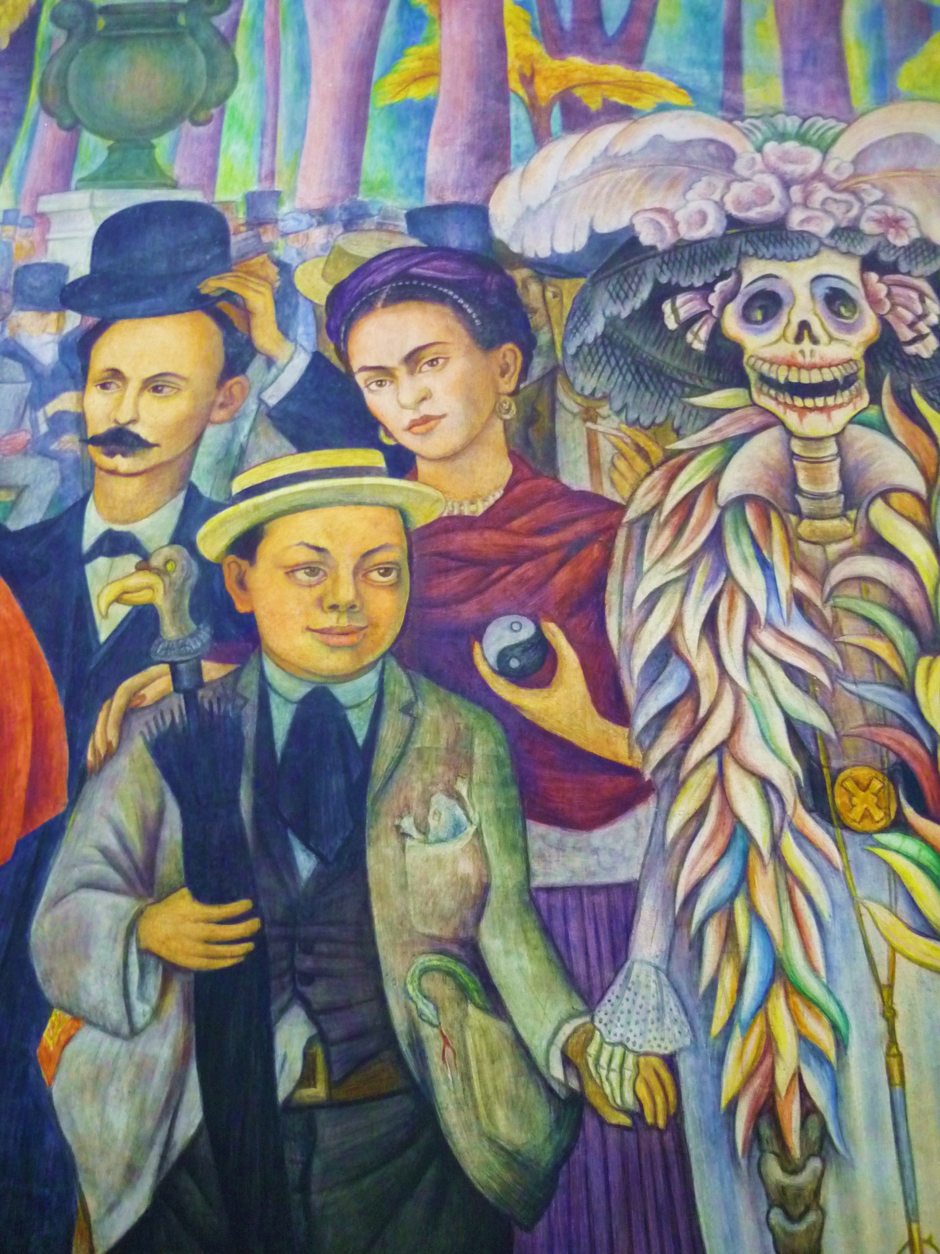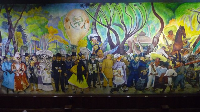 Náš hotel je blízko Alamedy, což je park v samém centru města, plný soch, fontánek a prodavačů všeho možného. Došli jsme na jeden jeho konec a hned na rozehřátí jsme si dali Muzeum murálů Diega Rivery, jednoho ze tří nejslavnějších mexických malířů. Je tam vystaven jeho slavný murál (obří obraz namalovaný na zdi) Sen o nedělním odpoledni v Alamedě, kde se autor sám vyobrazil jako malého chlapce, držícího za ruku Veselou Smrt. A za sebe namaloval svou ženu Fridu Kahlo.