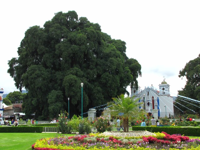 Sbalili jsme si ráno všechny věci na hotelu a vyrazili jsme autobusem plným Mexičanů s mexickým průvodcem. Napřed jsme měli krátkou zastávku v Tule, kde roste jeden z nejstarších a největších stromů na světě. Z plynulé španělštiny průvodce jsem pochopila, že strom váží jako 12 naložených autobusů a denně vypije 2.000 litrů vody. Kostel na níže uvedené fotce je normální a běžné velikosti, žádné trpasličí vydání: