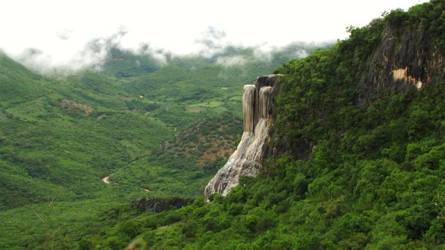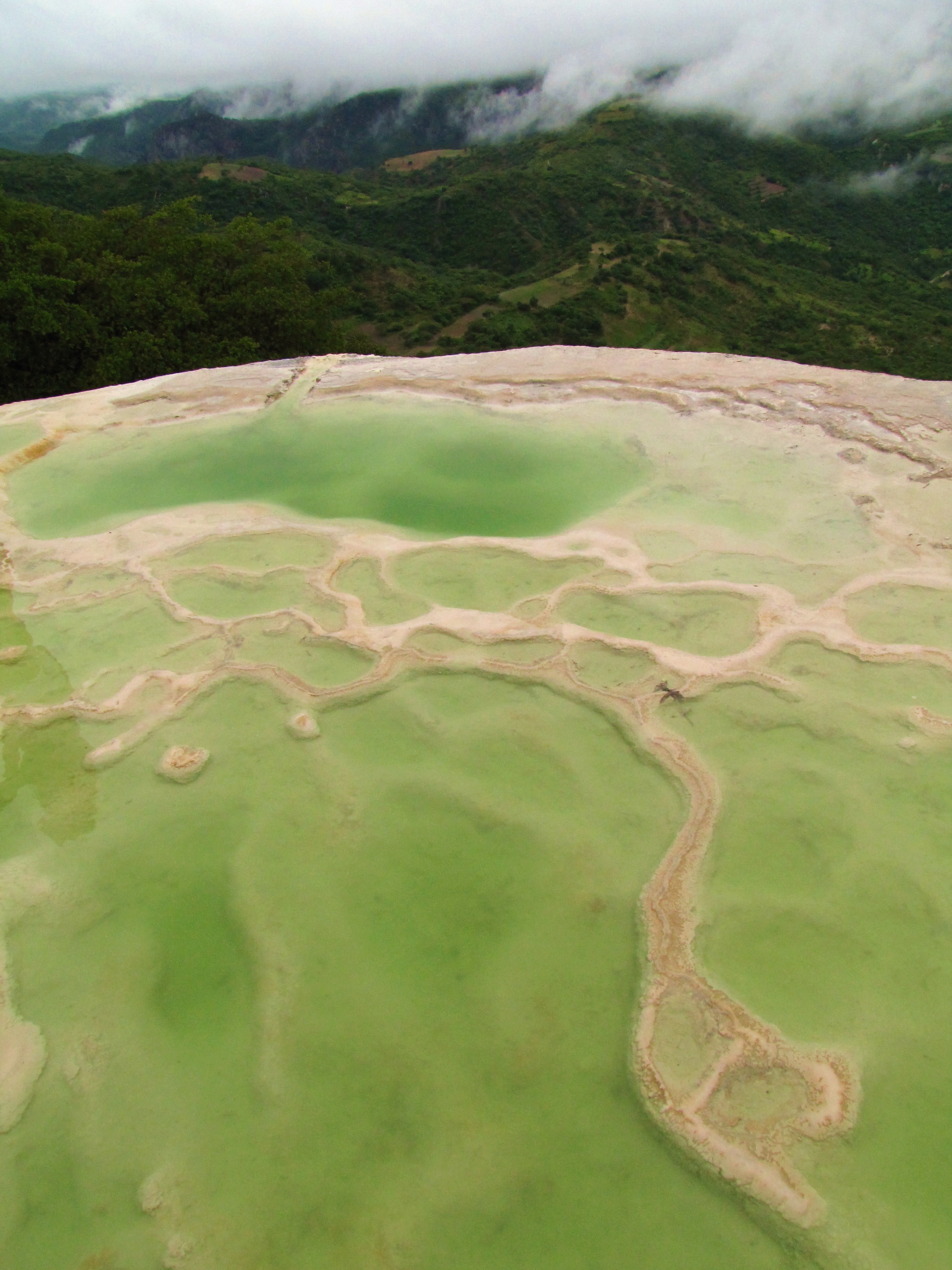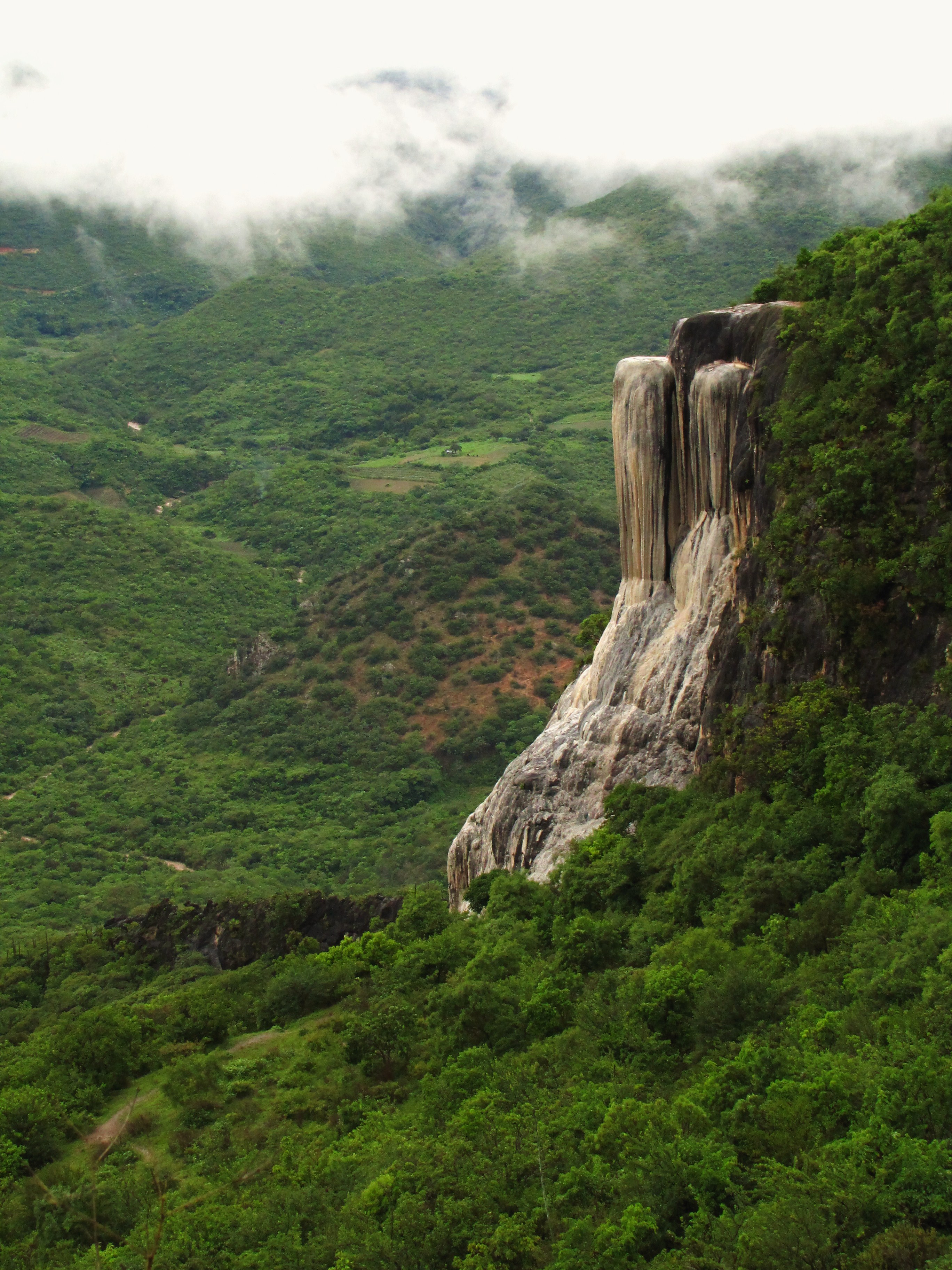 Odtud jsme vyrazili na hlavní hřeb programu, a to nádherné travertinové kaskády Hierve de Agua. Jeli jsme na místo asi hodinu a vůbec nic jsme neviděli, protože se cesta kroutila napůl kaktusovým a napůl borovicovým lesem, který ovšem nebyl vidět, protože všude byla mlha, že by se dala krájet a lilo. Lilo tak mocně, že jsme jeli v proudech žlutého bahna sahajících autobusu do půlky kol. Za tohoto obřího deště jsme vystoupili a v proudech vody a bahna jsme se hnali dolů z kopce pralesem, abychom spatřili kaskády. Když jsme se k nim celí mokří dostali, déšť jakoby kouzlem přestal, mraky se rozplynuly a na místě se objevily bílé kaskády vodopádu padající po stupních na pozadí vysokých hor, šedých mraků a zeleného pralesa. Neuvěřitelný pohled, který asi v životě nezapomenu. Před námi se otevřel výhled, který připomínal divadelní jeviště: z ničeho nic vidíte pralesní údolí a v něm jakoby zmrzlou vodu padající ze stometrové skály. Sami přitom na podobné skále stojíte, okolo vás v malých tůňkách probublává ostře zelená a čpící voda a vytváří podobné kaskádky, aby sama zmizela pod dalším stometrovým útesem.