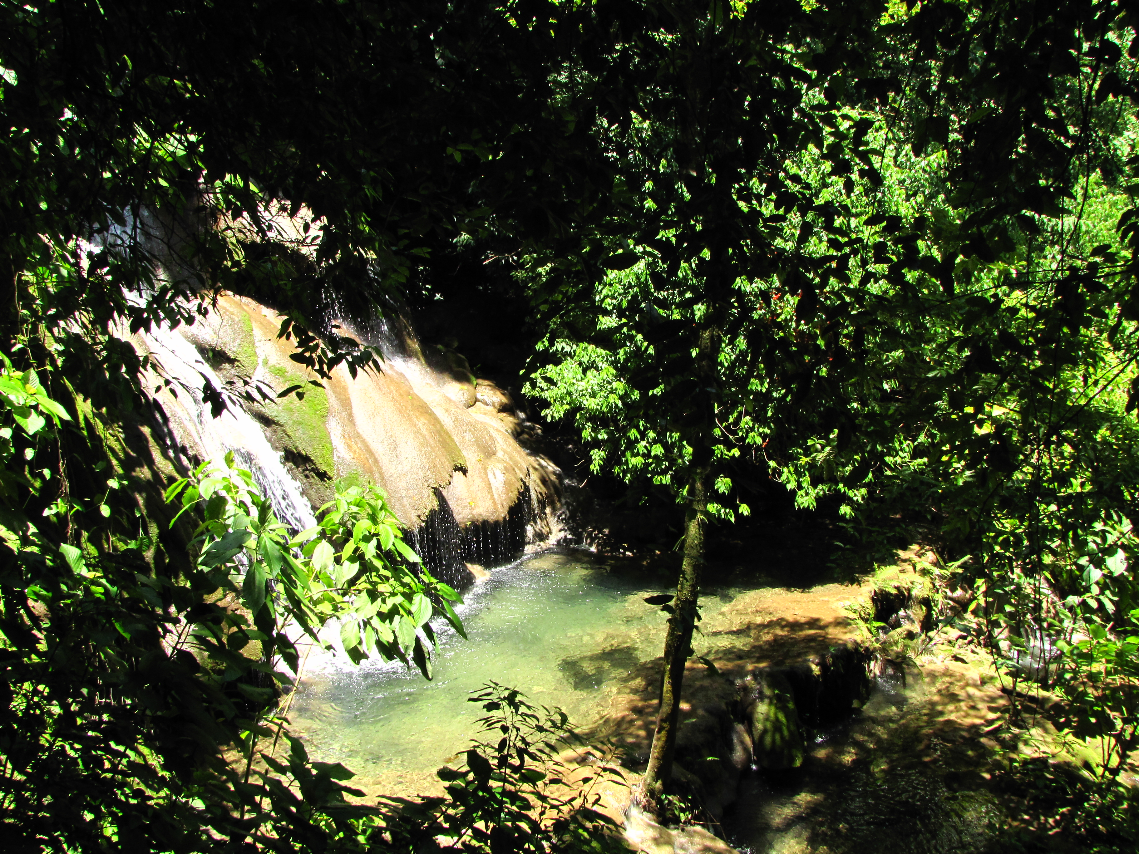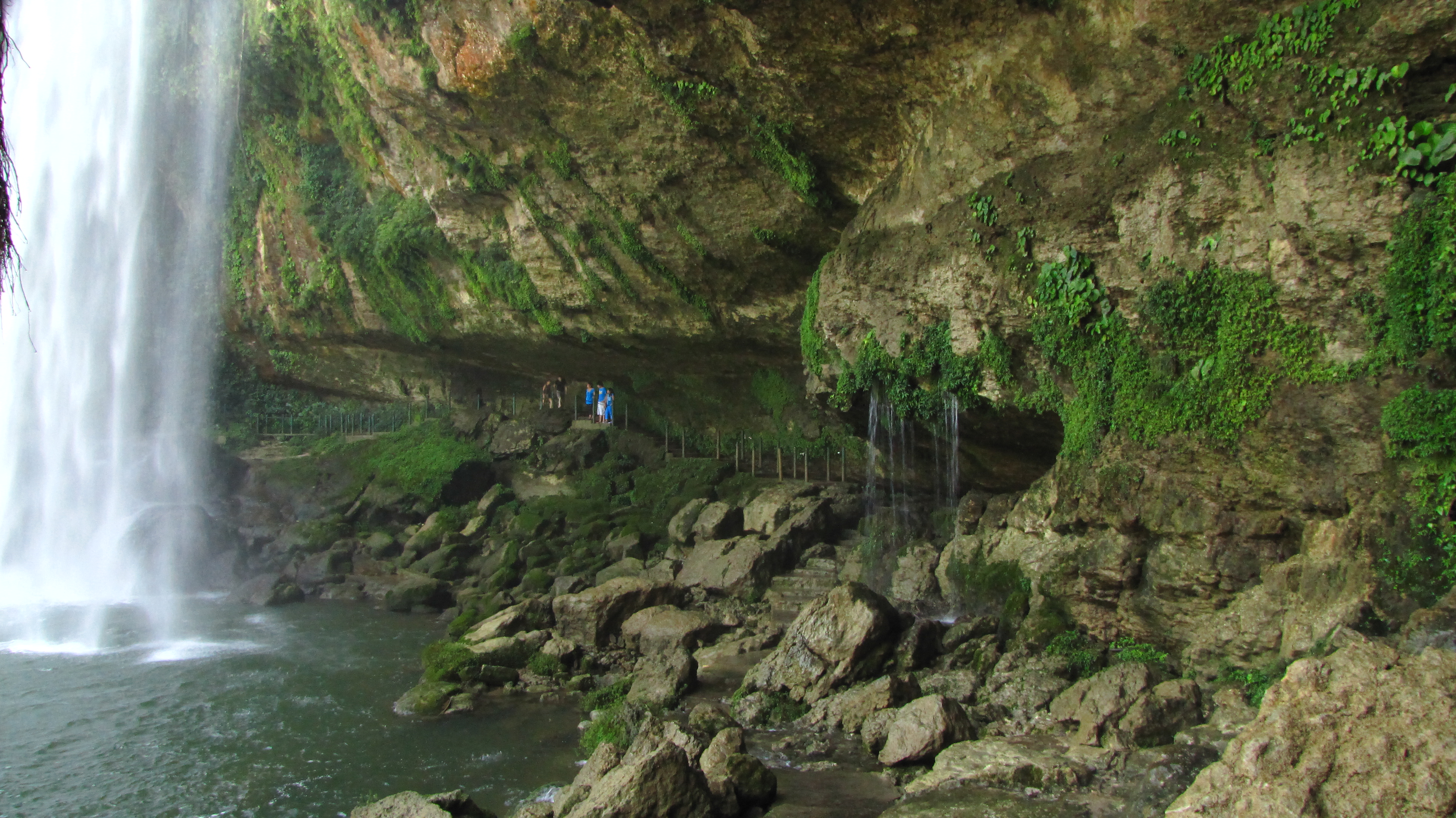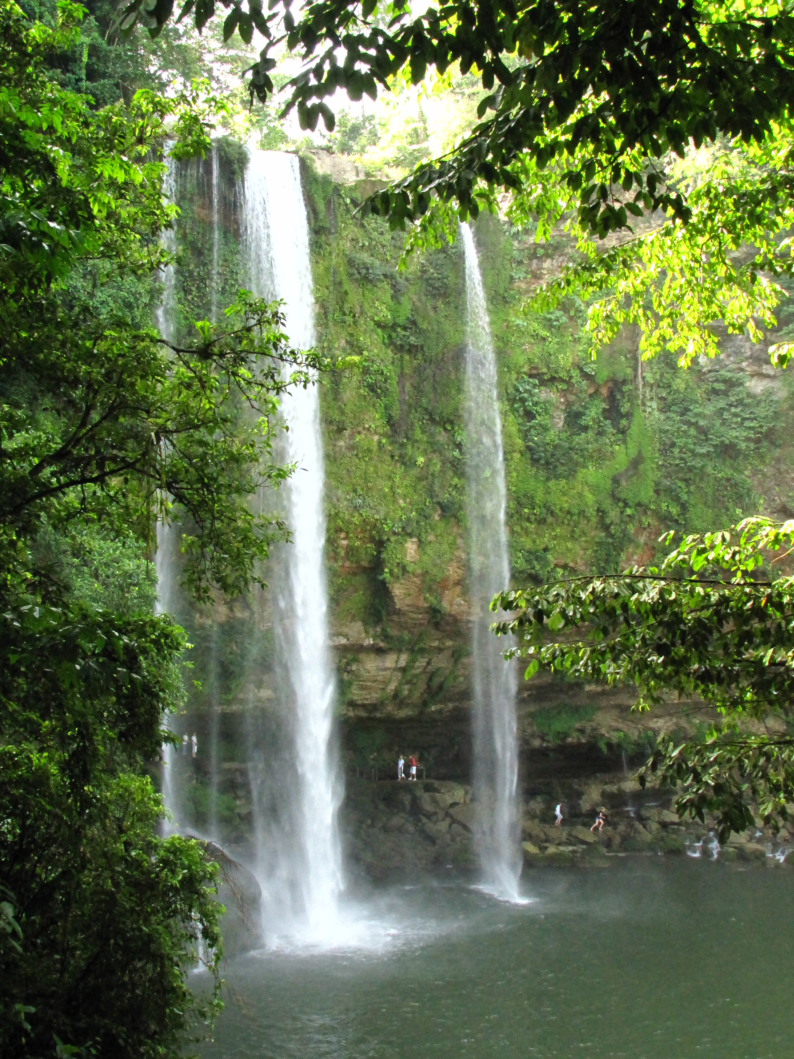 Dneska ráno jsme vyjeli k prvním vodopádům, nazývaným maysky Misol-ha. Je to vlastně jeden vysoký vodopád přepadávající do jezírka přes kolmou skálu, která jej rozděluje na několik proudů vody. Hlavní zajímavost a úžasnost celého vodopádu spočívá v tom, že ona skála je ve skutečnosti převis, takže můžete sejít po pěšince k jezírku a jít ZA vodopád. Za zády tedy máte skálu, kolem vás se pnou vzdušné kořeny rostlin ze shora, část vody před vámi padá z útesu dolů a část z ní se provrtala skrz skálu. Vypadá to jako obří sprcha;)