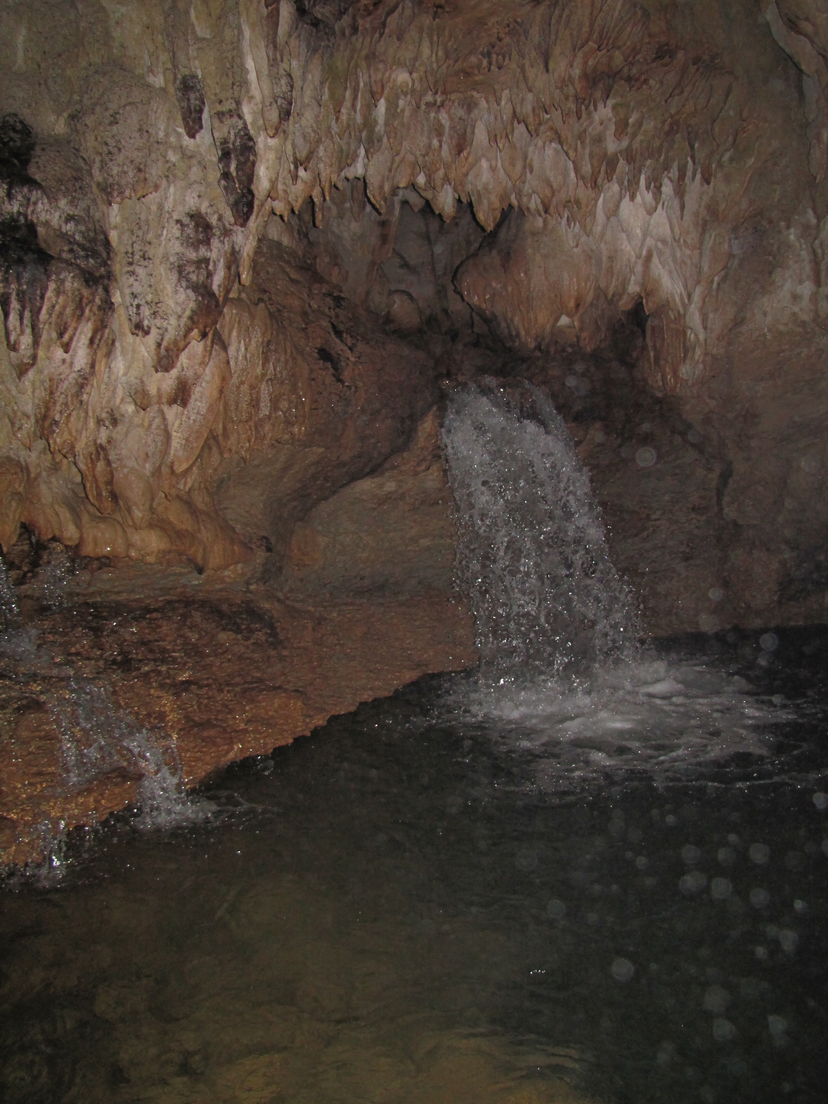 Nejlepší na tom ovšem byla jeskyně. Část vody se ve skále prohlodala a udělala jeskyni, u vchodu jsme si za v přepočtu patnáct korun každý půjčili jednu baterku a v naprosté tmě jsme se přes kameny brodili vodou do nitra útesu. Po asi pěti minutách jsme došli do větší jeskyně, vyhloubené vodopádem. Ten ve tmě zabíral celou jednu stěnu jeskyně. Dosvítili jsme na něj baterkou a byl to opravdu zvláštní pocit, z té tmy vyloupnout řvoucí vodopád, stejně jako stalaktity visící všude kolem něj. Pak jsem si všimla, že tam všude lítají i netopýři, viseli v trsech nad vodou a pištěli na nás. Chvíli jsme se kochali a pak jsme se vrátili zpátky, abychom zjistili, že ve vodě, kterou se brodíme, plavou i malé rybičky. Nevím, jak je to možné, že je to nespláchlo z vodopádu, ale žijí si celkem spokojeně v jeskyni a asi pojídají netopýří tentononc…trus.
