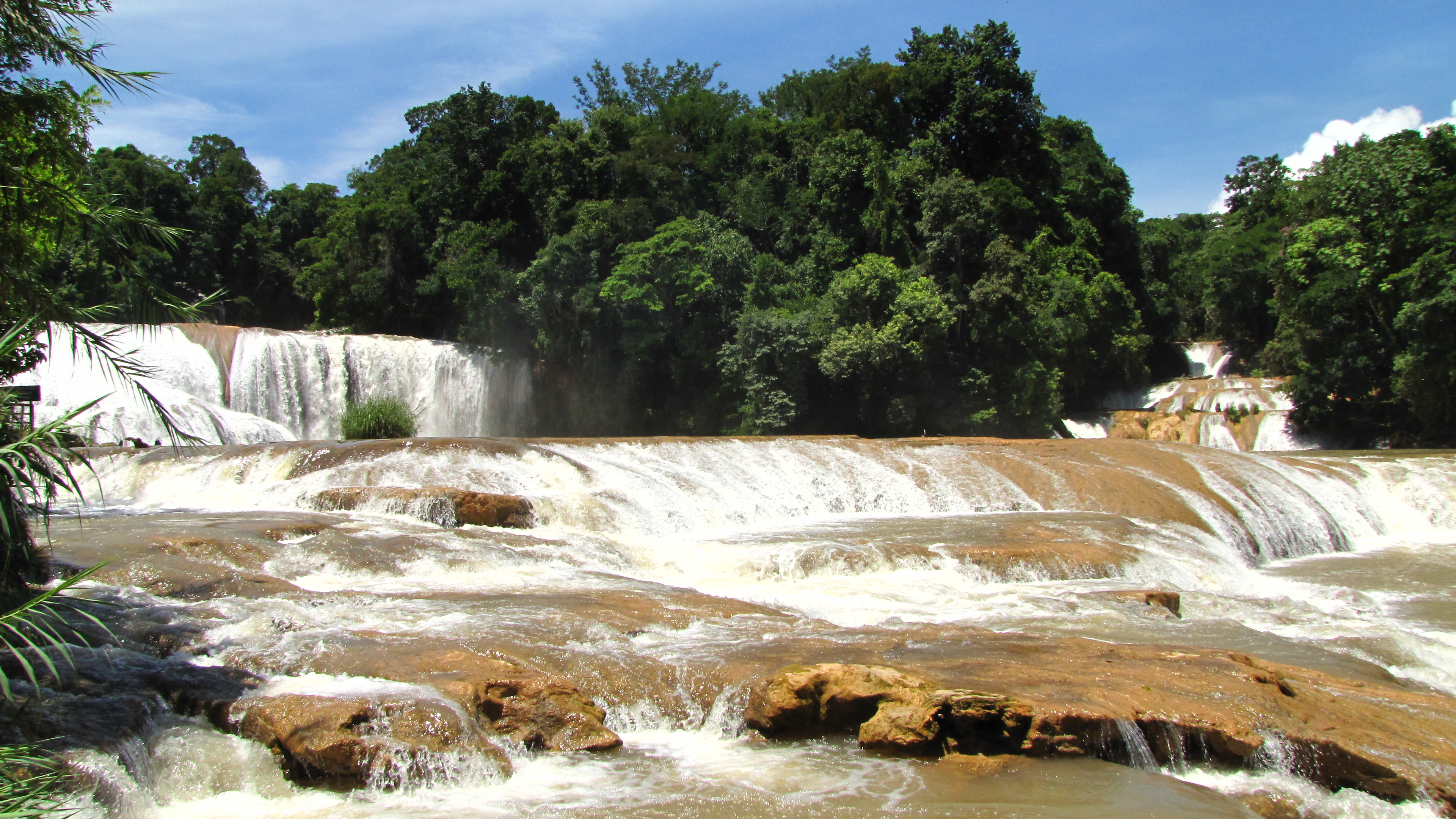 Potom jsme jeli asi hodinu autobusem na další vodopády, kaskády Agua Azul. Tyto vodopády jsou dle všech nejlepší, nejkrásnější a vůbec. A mají být úžasné tyrkysově modré (odtud taky jejich název). Bohužel, jsme tu v období dešťů, takže vodopády bych mohla nazvat Agua Marron, neboli hnědá voda, protože kaskády měly opravdu velmi bahnitou barvu. Byly mohutné, široké, a kdybych neviděla El Chiflon, a nebyla plná speleologického nadšení od Misol-ha, asi bych byla nadšená. Takže jsem jen spokojená….. Prošli jsme celé kaskády až úplně nahoru, kde jsme si zaplavali v jednom z jezírek a chvíli se vyhřívali na slunci. Pak se mi udělalo špatně z kukuřice, co jsem snědla, tak jsme jeli domů.