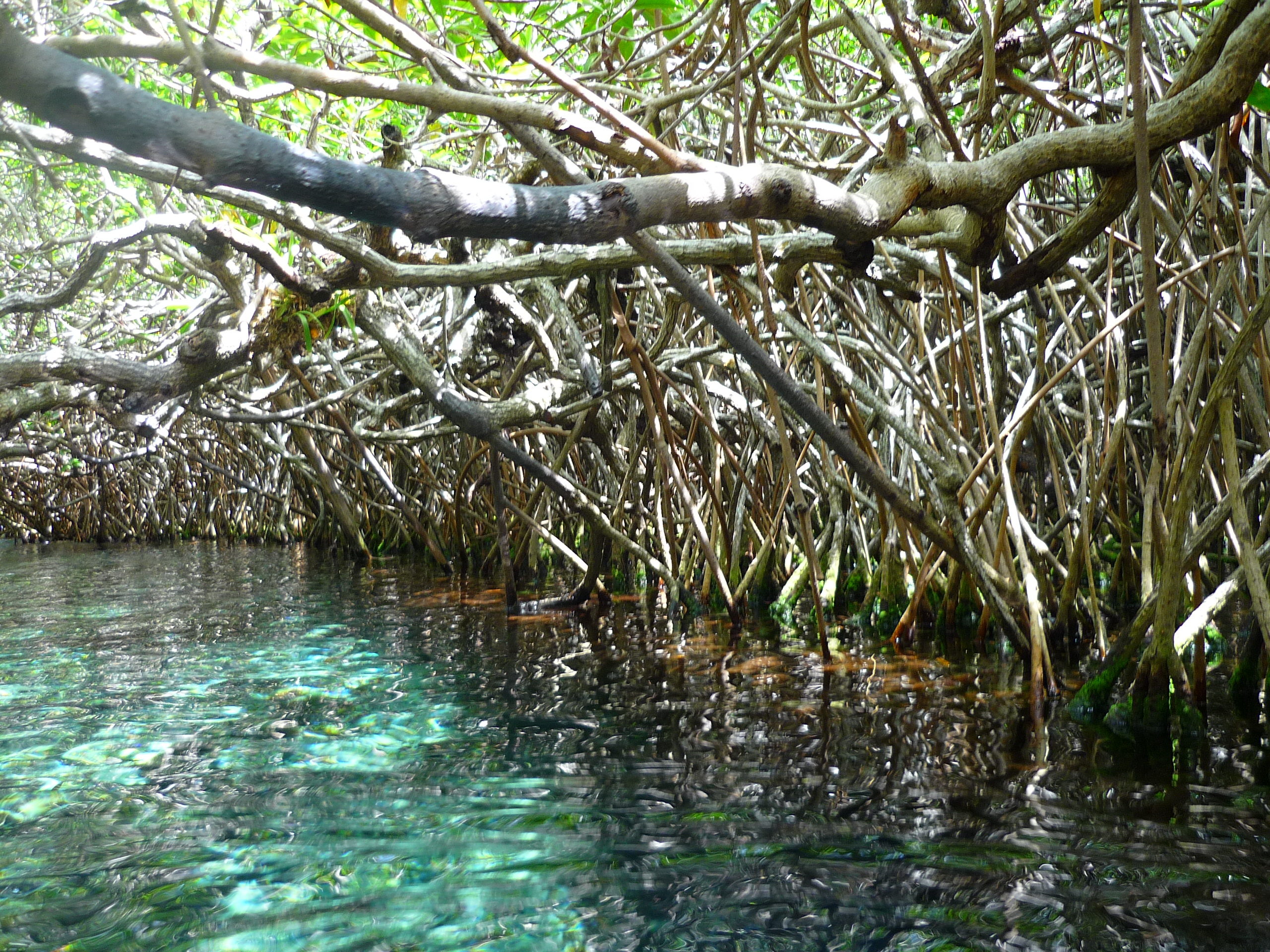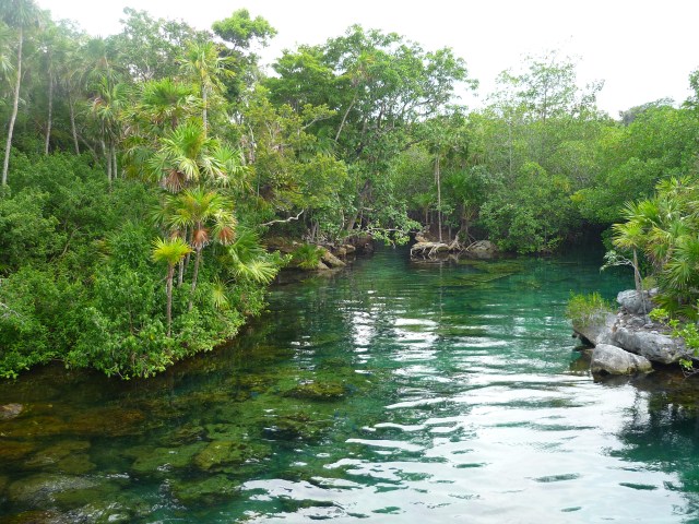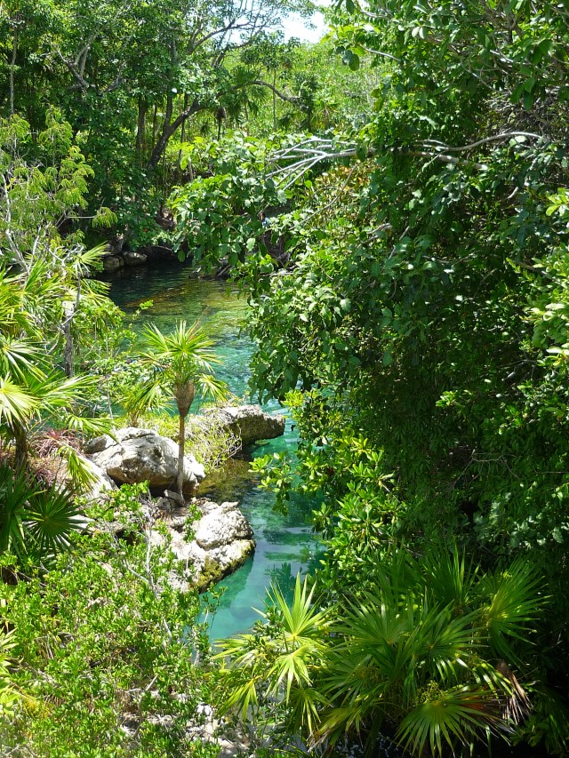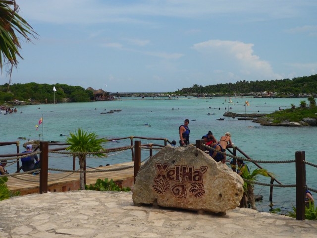 Taaaaaaaaaaaaakže, jsem tu, celá unesená, musím vám to převyprávět. Park Xel-Ha si mne zcela získal a rehabilitoval tak v mých očích postavení Yucatánu v našem cestovatelském plánu. Jedná se v podstatě o velkou klikatou mořskou zátoku, která je spojena s krátkou sladkovodní říčkou vyvěrající z místního skalnatého podloží kousíček od pláže, a zároveň napájí několik cenotů v těsné blízkosti moře. Celé je to ohraničené jenom plovoucím mostem, ryby mohou tam a zpátky, až na delfíny a kapustňáky, které drží zvlášť v nádržích, a kterých mi bylo líto….