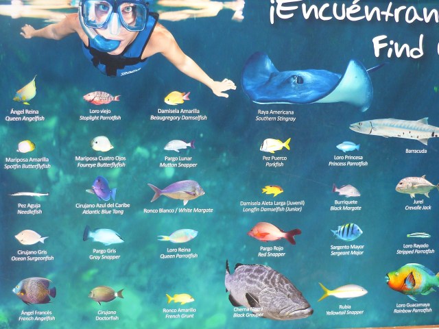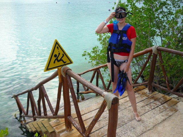 Jinak je to obrovitánský ekosystém pralesa, pobřežního moře, brakické vody, jeskyní, cenotů, vyvěrající podzemní říčky, kde se dá pozorovat spousta druhů ryb (prý až 150). U vstupu dostanete šnorchl, brýle, ploutve, plovací vestu, ručníky, zámek na úschovnu, a můžete si celý den dělat v parku cokoliv. Od pozorování ryb, přes věšení se na provazové houpačky, skákání z útesu do naprosto tyrkysově modré vody, neomezeného jídla v několika restauracích, popíjení alkoholu, houpání se v hamakách a podobně. Naopak, pokud chcete plavat s delfíni či kapustňáky, či si půjčit jakýsi skafandr a procházet se po dně, musíte si zatraceně mastně připlatit (třeba 150 dolarů za delfíny, hahaha). Na to jsme se vykašlali, stačilo nám to ostatní, a ani jsme to do zavíračky všechno téměř nestihli. Normálně do moře vůbec nelezu, protože mi na kůži hrozně vadí slaná voda, ale kvůli těm rybkám (a hlavně kvůli tomu, že se zde dá hned po výlezu z moře prakticky kdekoliv hned osprchovat sladkou vodou), jsem se odhodlala.