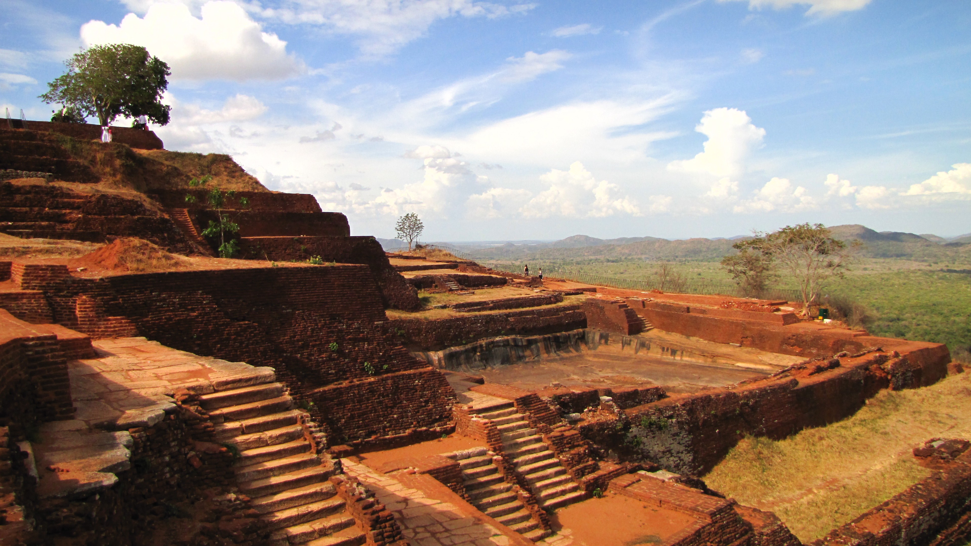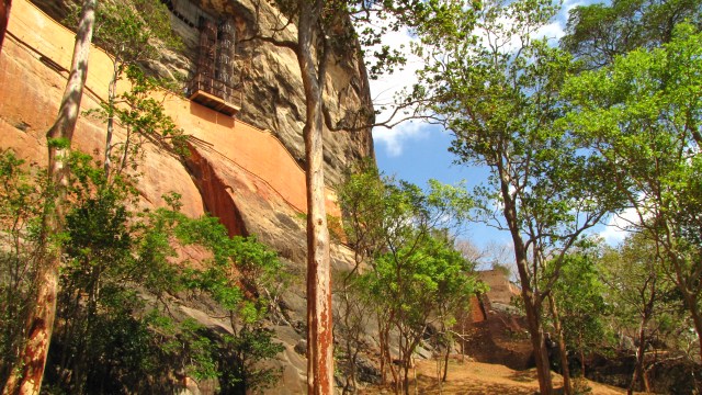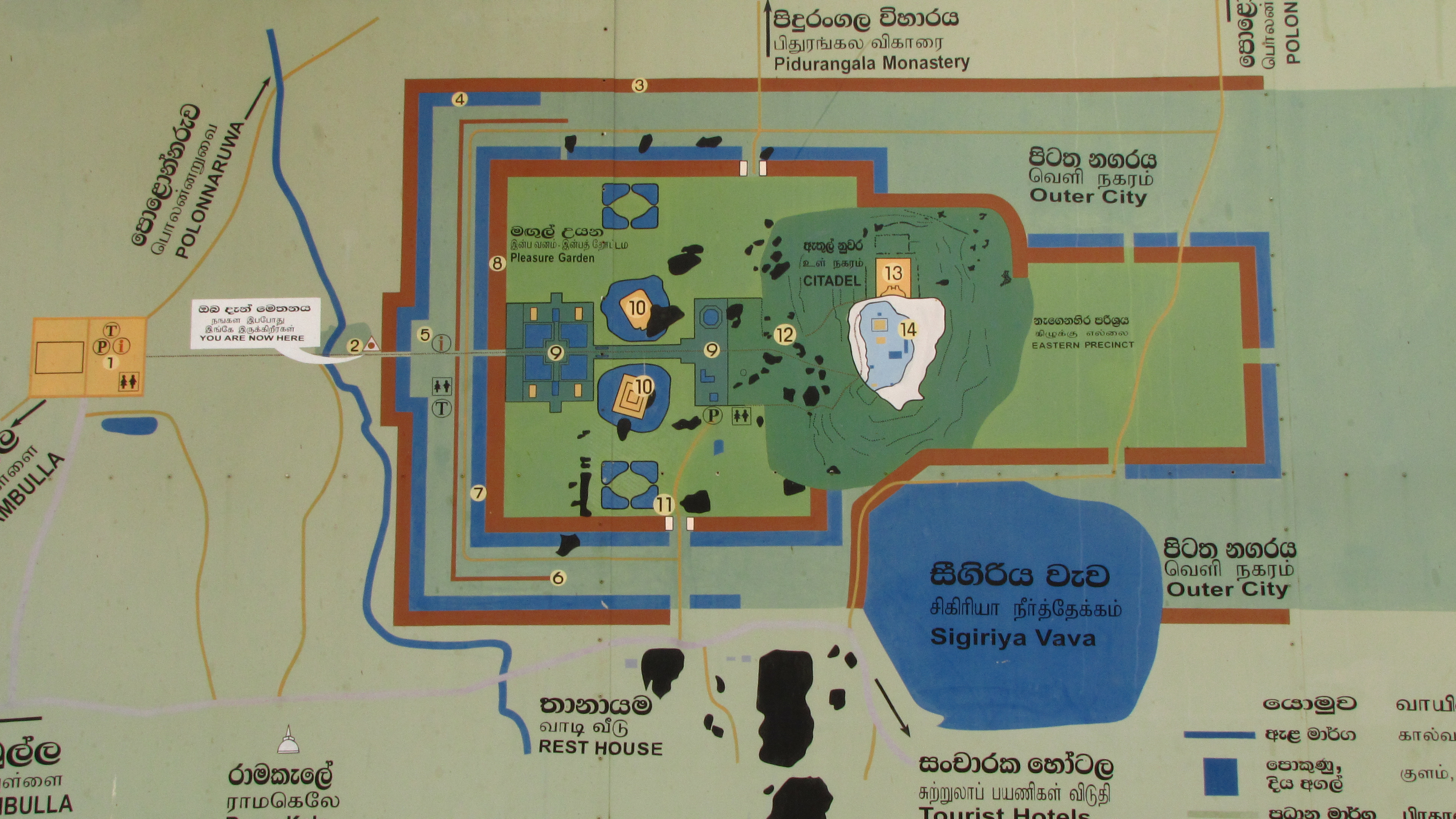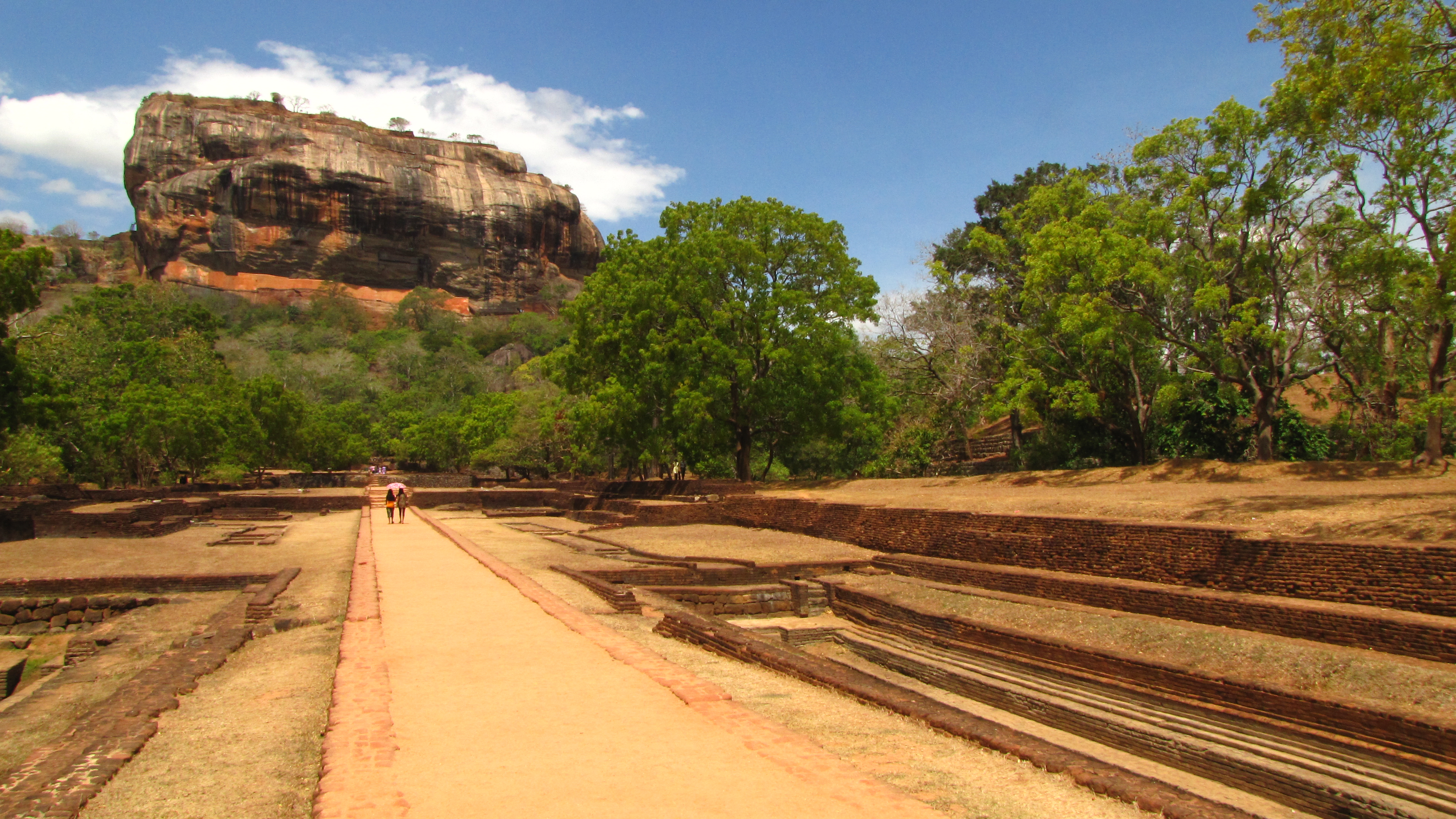 Jedna se o nejslavnejsi pamatku Sri Lanky, nadhernou starovekou pevnost vybudovanou na obrovske skale tycici se do vysky pres sto metru nad okolni pralesem zarostlou krajinu. Po ceste se k pevnosti se prochazi tzv. vodnimi zahradami z vodnich prikopu a zavlahoveho systemu, jehoz fontany a vodotrysky jsou pri monzunech dodnes funkcni (!), zahradou viklanovych kamenu, az k pate skaly. Tam se postupne splha po kamennych schodech kolem ruznych jeskyni se zbytky polychromu na stenach a stropech, kolem obrovskych trunu z jednoho kusu kamene, i kolem ceduli s napisy POZOR, HLUK MUZE VYPROVOKOVAT UTOK SRSNU!