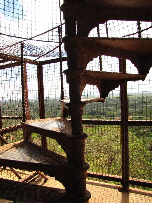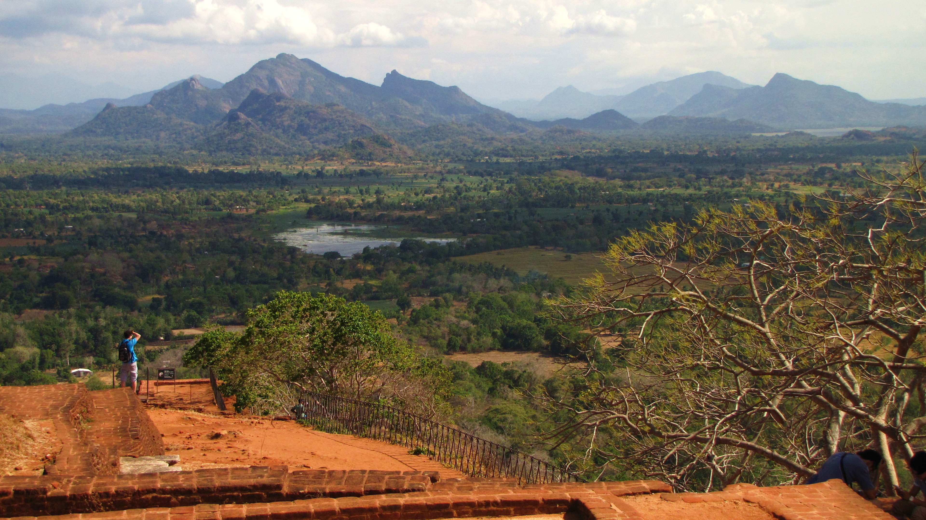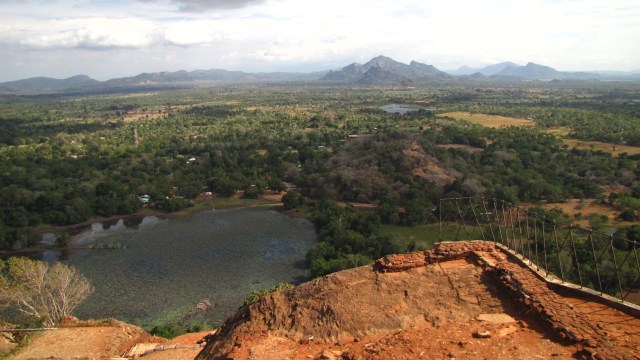 Tam to byla krasa. Vyhled do sirokeho a placateho kraje, pokryteho pralesem a umelymi obrovskymi starovekymi zavlahovymi nadrzemi, na obzoru ostre mlade hory stredni Sri Lanky, zbytky kralovskeho palace a skvele svetlo. Moc prima, ale celou dobu jsem premyslela,  jak se dostat dolu, aniz bych musela skocit. Nakonec jsem sla pozpatku, Marian pode mnou, a nebylo to tak desne.
