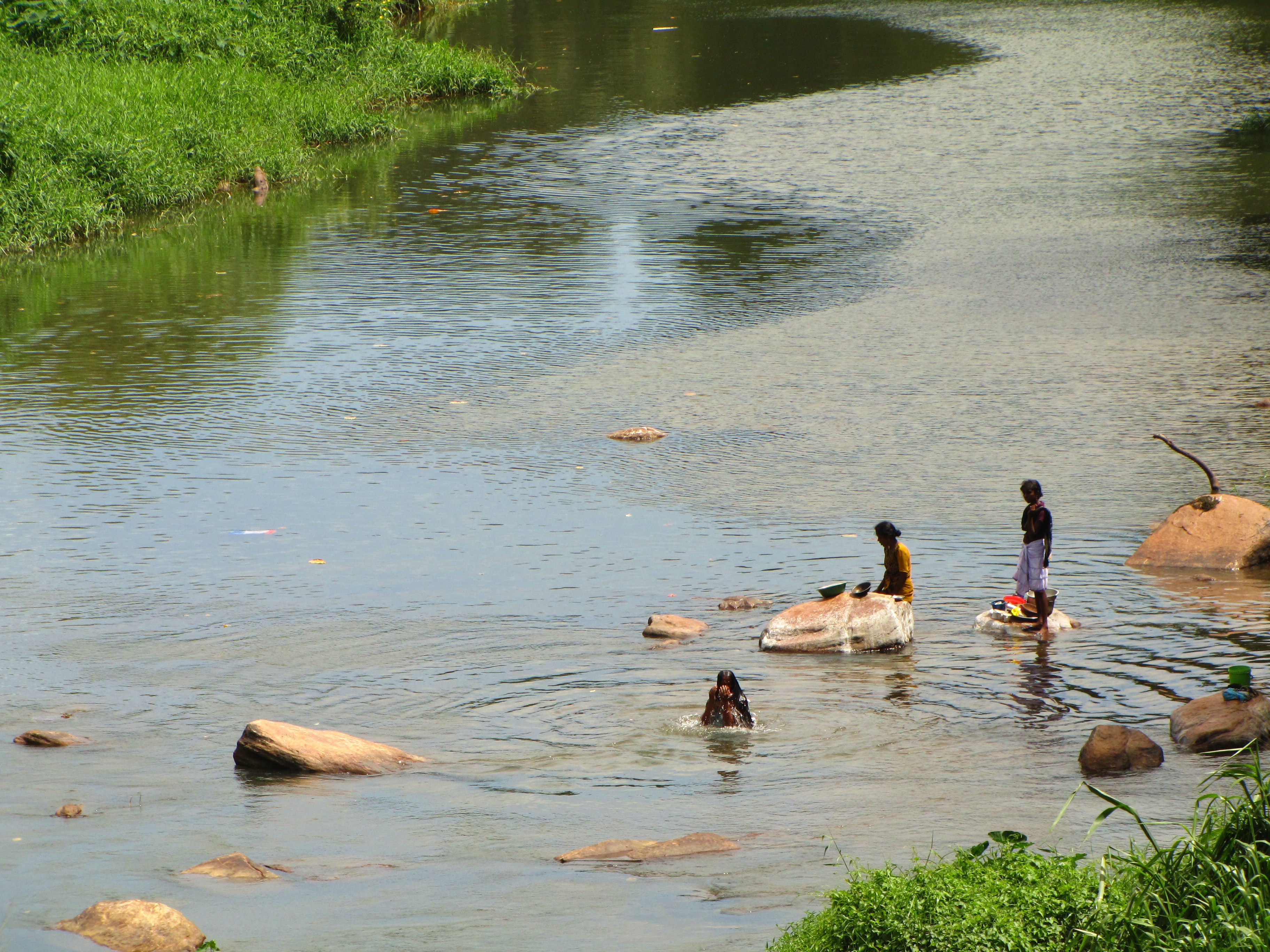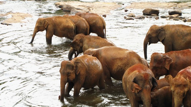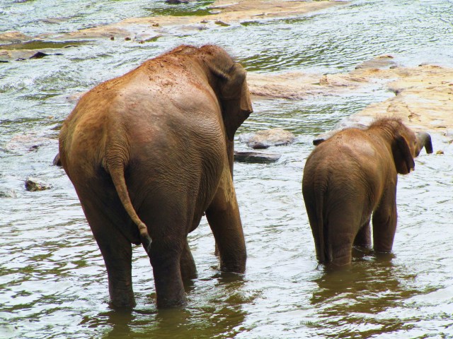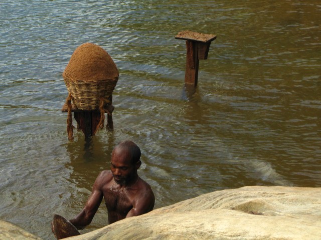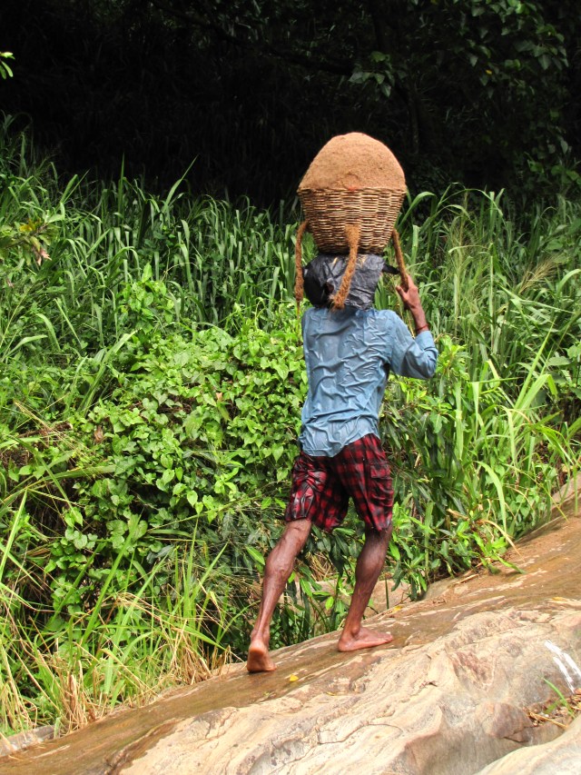 Rano nas opet Namal vyzvedl v pul devate i se snidanovym balickem od jeho maminky a pojedli jsme u reky na kameni. Dnes s nami jeli i mladi manzele z Izraele, a protoze Pinnewala je od Kandy celkem daleko, nejeli jsme tuk-tukem, ale vanem. Oproti vcerejsku byla snidane o to zajimavejsi, ze ze dna reky delnici dolovali pisek na stavbu domu. Rucne. Pekne se potopili, v dlanich vytahli pisek a dali ho do kose, cely kos s piskem o vaze minimalne 40 kilo si hodili na hlavu, vysplhali po mokre strani plne bahna apokryte mokrou travou a vynosili az nahoru k silnici. A znova…. Ja bych se a) utopila, b) zlomila by se mi hlava, c) prerazila bych se pri vystupu nahoru i bez kose….