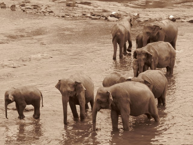 Nakonec, kdyz uz na brehu stala hlava na hlave, prosel kolem majestatni sloni pruvod, velke a divoke slonice na zacatku, pak klidne a brezi s mladaty. Vsichni sloni vesli do siroke melke reky plne oblych skal, a tam se koupali. Pili vodu, prochazeli se…a asi dva nebo tri se rozhodli zadovadet si a s cakanim prchali pohanecum na druhy breh. Ti je honili s tycemi, ale sloni byli rychlejsi. Vypadalo to, ze se dost bavi. Mne se libilo jedno slune, ktere postavalo uprostred tunky, chobot ponoreny ve vode, a ocividne premyslelo, kam si tu vodu z chobotu naleje. Nemohlo se rozhodnout, tak stalo a koukalo. A vydrzelo mu to skoro celou dobu.