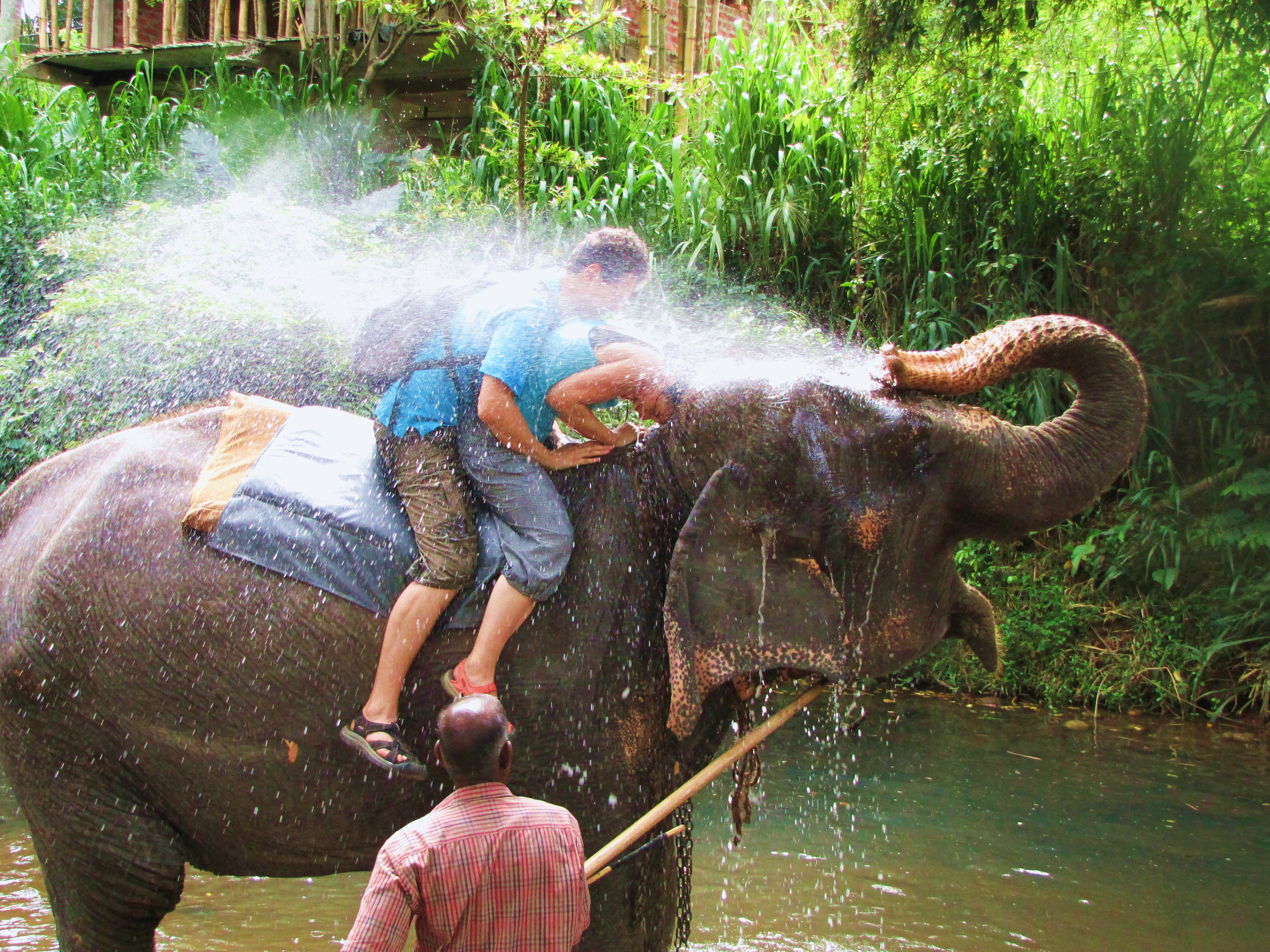 Pak nas jeji pohanec zavedl do reky a zeptal se, jestli chceme sprchu. Izraelci se zesrabili a nechteli. My jsme rekli, ze rozhodne. Slon se sklonil, nasal vodu a pres hlavu ji na nas celou vyfrknul. Dvakrat. Byli jsme mokri skrz naskrz, vodu z reky vyfouknutou slonim nosem jsme meli nejen v usich, vlastnim nose, ale i v puse. Tolik k dodrzovani mistni hygieny, kdy si i zuby cistime kupovanou balenou vodou, ze:))) Pak jsme jeste jeli na slonovi asi pul hodiny, pak se s nim fotili a krmili ho dalsimi banany. Musim rict, ze tenhle zazitek asi z hlavy nedostanu, protoze to bylo neco neuveritelneho.