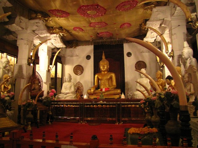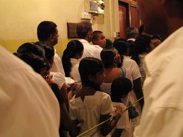 Vcera v pet rano nas Namal vyzvedl a sli jsme se podivat na ranni obrad do chramu Buddhova zubu v Kandy. Namal uvaril pro kazdeho z nas misku ryze s hrozinkami pro Buddhu a jeho mnichy a protahl nas dovnitr jen na jeden listek misto na dva – cizinci musi platit 1000 rupii. I kdyz prselo a byla tma jak v pytli, tak jsme se museli zout a projit k chramu, kde vyhravali na bubny a takovou tu pistalu krotitele kober a zpivali mantry. Vystali jsme frontu mezi poutniky a zboznymi buddhisty, abychom nasi ryzi mohli odevzdat mnichovi do okynka a pri te prilezitosti se asi na pet vterin podivat na zahaleny Buddhuv zub. Ten je vystavovan odhaleny jenom jednou rocne v ramci svatku Zubu, ktery se kona na prelomu cervence a srpna. Ac zli jazykove tvrdi, ze se nejedna o zub lidsky, ale asi hrosi, protoze meri pres 30 centimetru, je to nejposvatnejsi buddhisticka relikvie na ostrove a jako takove se ji dostava poct nejvyssich. Vyjede slavnostni pruvod slonu ozdobenych vanocnimi svetylky a prehozy a kolem metaji kozelce plivaci ohne.