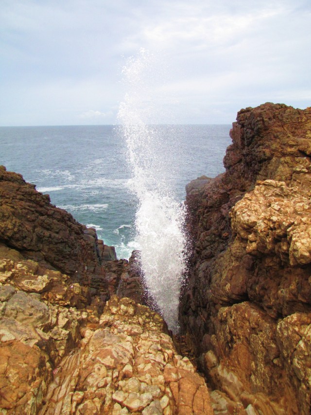Takze v mezidobi, zatimco vladl castecny lazaret, delali jsme kratsi vylety po okoli. V den prijezdu jsme jeste stihli nekolik kilometru vzdaleny gejzir Hoomanyia. To je zvukomalebne vyjadreni toho, jak morsky priboj stoupa takovym kanalem ve skale a najednou bez predchoziho upozorneni za vydatneho huceni vystrikne vysoko nad skaly, nekdy pet, nekdy deset metru. V zari pry vyfukuje az do tricetimetrove vysky, kdyz jsou monzuny a priboj je nejdivocejsi.