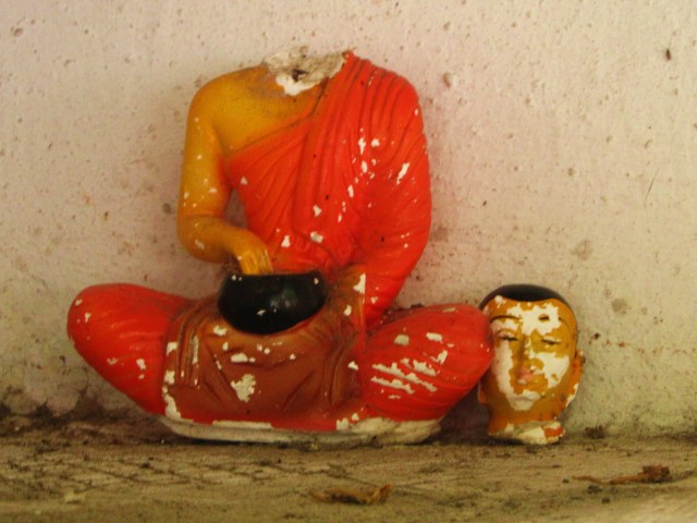Nastala hororova jizda smrti, kdy se silnice zmenily v proudy vody, jezera a vodopady, jejichz vody byly rozstrikovany na vsechny strany pocasi naprosto ignorujicimi ridici. Po ceste jsme videli nejmene dve dost osklive bouracky, ale divim se, ze jich nebylo vic. Nas pan ridic ridil dobre a svedomite, utiral si zamlzene predni okno tuk-tuku hadrikem a jediny sterac absolutne nestihal zvladat destovou zaplavu. Po nekolika minutach zbesile jizdy najednou tuk-tuk zastavil v arealu nejvyssi sochy Buddhy na ostrove a ridic na nas volal, at si vystoupime a jdeme si tuto pametihodnost prohlednout. Vzhledem k tomu, ze z nebe padaly provazy vody a my byli behem tri vterin prebehnuti od tuk-tuku k pokladne mokri naskrz, vzdali jsme to a panu ridici jsme nezne naznacili, ze pohled na sklolaminatoveho Buddhu ze sedesatych let nam plne dostacuje pres igelitove okenko tuk-tuku.