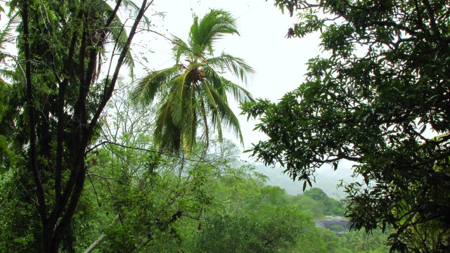 Po celou dobu, co jsme tak lezli po skale (a misty to bylo opravdu lezeni po schudcich vytesanych do kamene), bylo zatazeno a skalni pevnost se tycila v pralesni mlze. Mistu to dodavalo skvelou tajemnou atmosferu a navic nam slunce neparilo na hlavy. Jenze, kdyz jsme dosli na uplny vrchol skaly, spustil se dest, po ceste dolu jeste snesitelny, ale po nastupu do tuk-tuku se z nej stal naprosty monzunovy lijak.