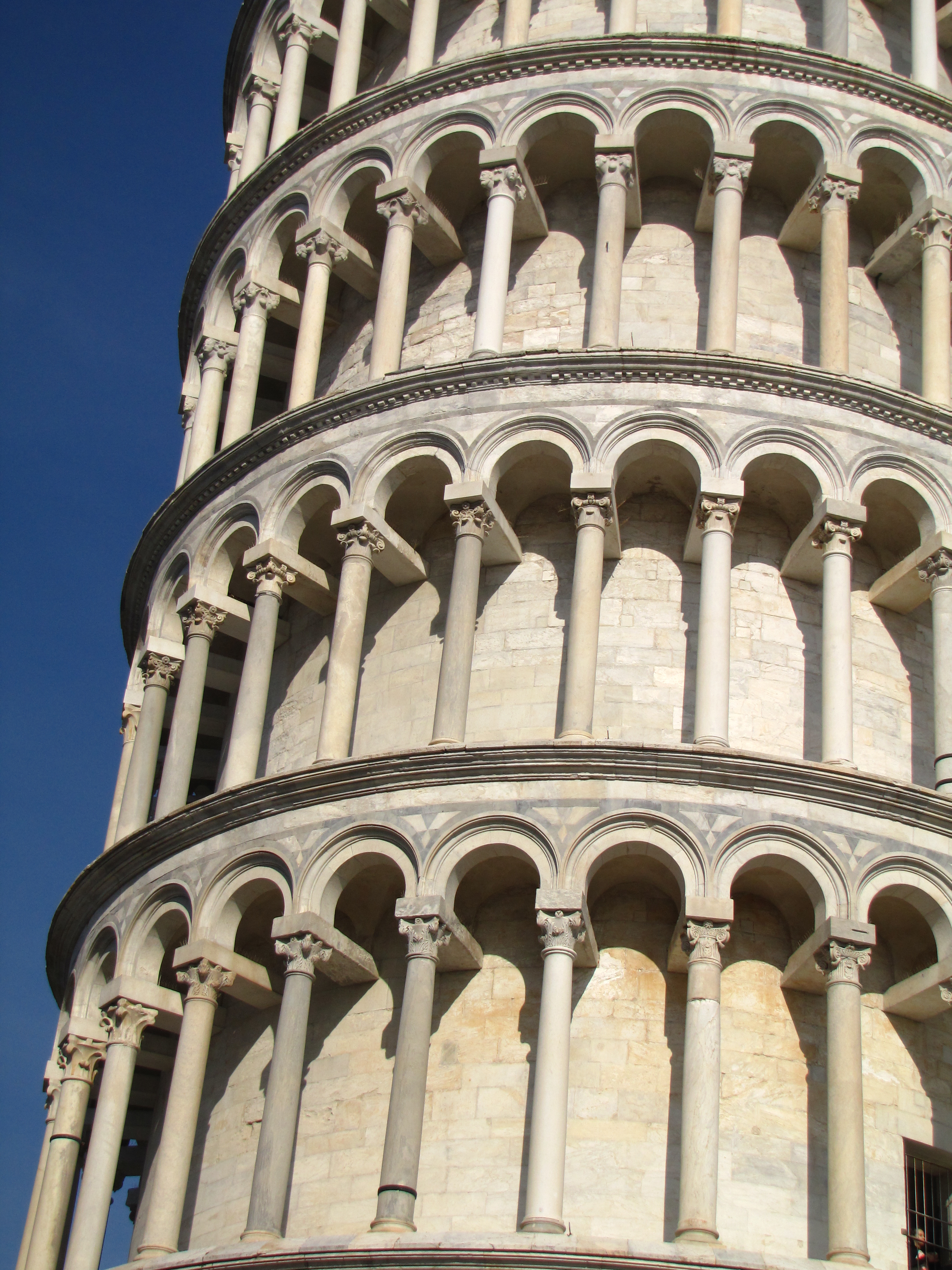 Ale tento pocit samozřejmě odezní v okamžiku, kdy obejdete davy turistů, snažících se před fotoaparáty naštelovat tak, aby vypadali, že Věž podpírají. Jakmile přijdete k samotné základně Věže, a zvednete oči, už vám tak malá nepřipadá. Rozhodly jsme se, že vylezeme až nahoru, ač se obě obáváme výšek. Lidi se vždycky hrozně diví, proč lezu na různé věže, skály, Machu Picchu, Lví skálu, a podobně, když se tam většinou hrůzou zaseknu a nemůžu ani tam ani zpátky. Na to odpovídám, že kdybych se o to ani nepokusila, navždycky bych si to vyčítala…A nevylézt na věž, která se začala naklánět brzy po začátku stavby, kterou se pokoušeli narovnat tak mocně, až se začala naklánět na druhou stranu, byla několikrát ohrožena pádem, kotvena, betonována a konečně zachráněna, aby se stala symbolem Itálie? Ani náhodou!