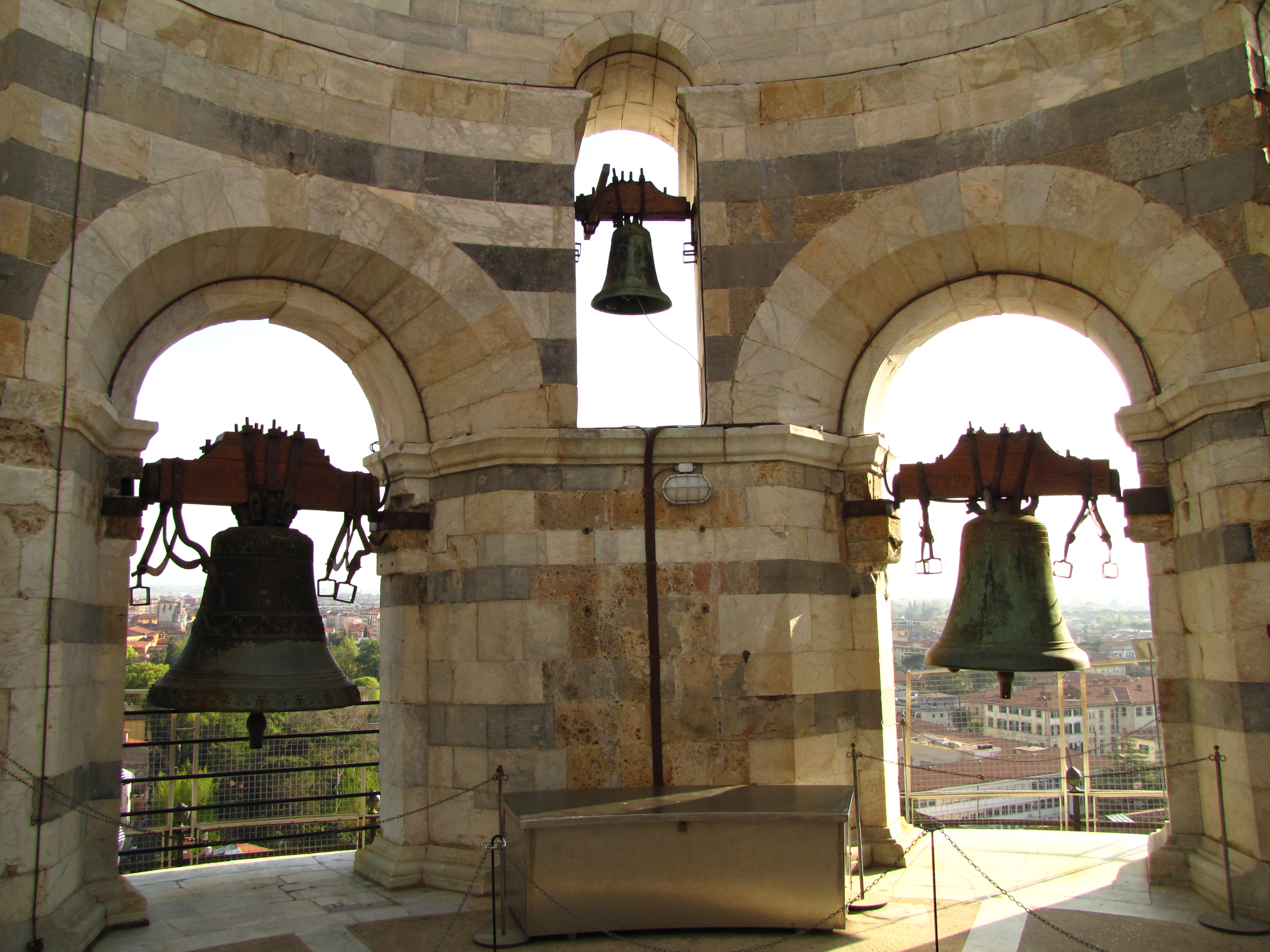 Takže jsme vlezly do věže – a nastalo Velké Zmatení Vnitřního ucha. Těch pět metrů, o které je věž vychýlena od své základny, totiž dělá hodně. Při chůzi máte pocit, že vám podlaha utíká pod nohama a vy připomínáte námořníka na souši po dlouhé plavbě. Tělo zvyklé na vodorovné podlahy a celkem předvídatelný sklon schodů prostě odmítá pochopit, že je něco jinak, než normálně. Těch tři sta schodů nahoru je tak trošku adrenalinových, ale jinak v podstatě přežitelných.