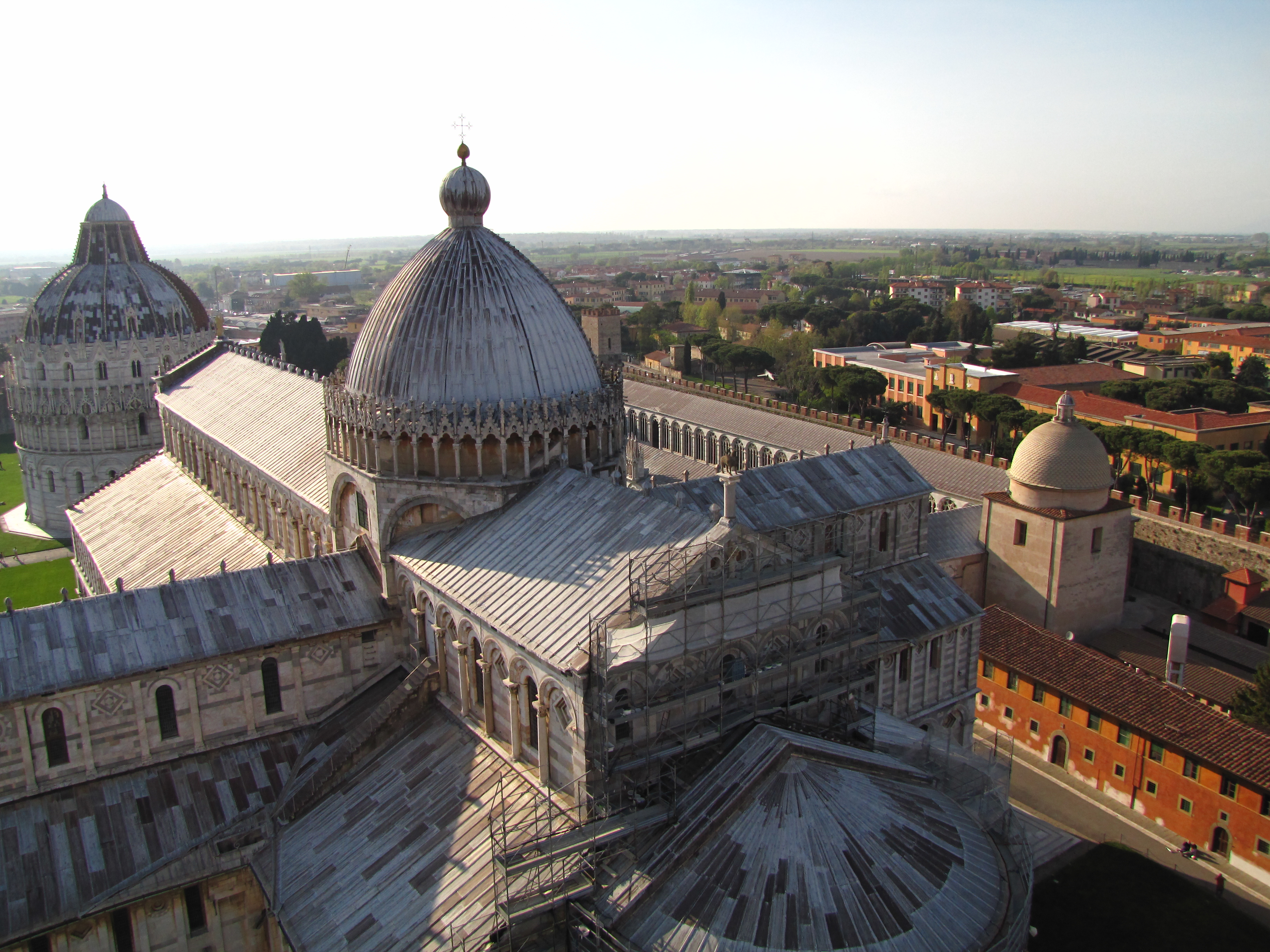 Shora vypadá Piazza dei Miracoli stejně úžasně. Jen ještě víc vynikne rozlehlost katedrály, ladný tvar baptisteria i mešitu připomínající tvar hřbitova. Vrcholek věže můžete obejít celý dokola (nebo jej lehce obplížit kolem zdí, pokud se, jako já, děsíte možnosti přistoupit k zábradlí na jeho okraji) a obdivovat výhled do nádherné toskánské krajiny.