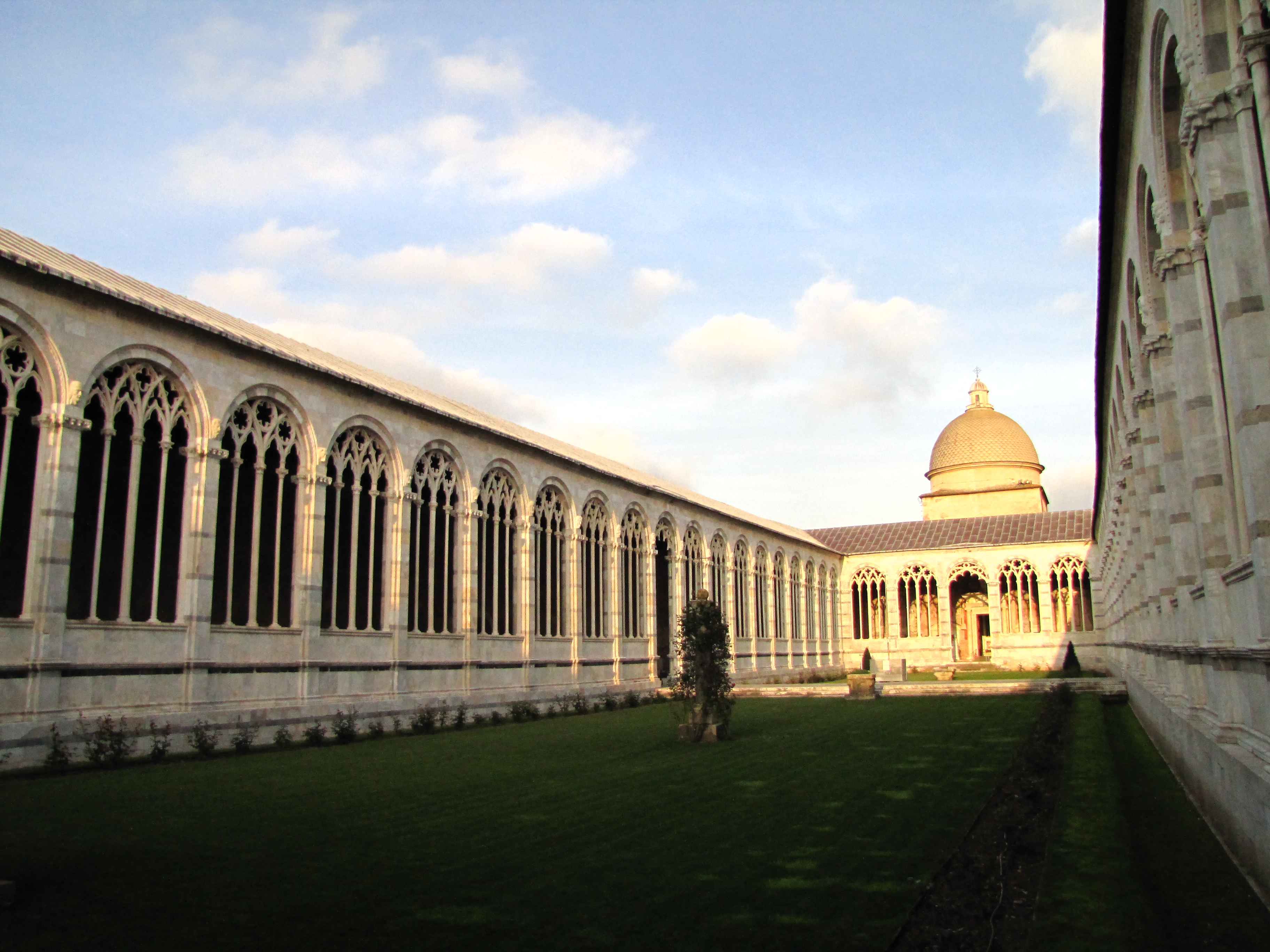 Už se začalo stmívat, když jsme si procházely historický hřbitov, který tvoří jednu stranu náměstí. Dočetla jsem se, že na jeho půdě se nechávali významní lidé z celé Itálie pohřbívat proto, že tam byla dovezena hlína z Jeruzaléma. Románská stavba vůbec nepřipomíná hřbitov tak, jak ho známe. Je tvořena sloupořadím obklopujícím dvě travnatá nádvoří, vyzdobeným freskami a sochami, a každý metr čtvereční té bílé mramorové kolonády je zaplněn náhrobky se jmény a podobiznami jednotlivých významných mrtváčků.