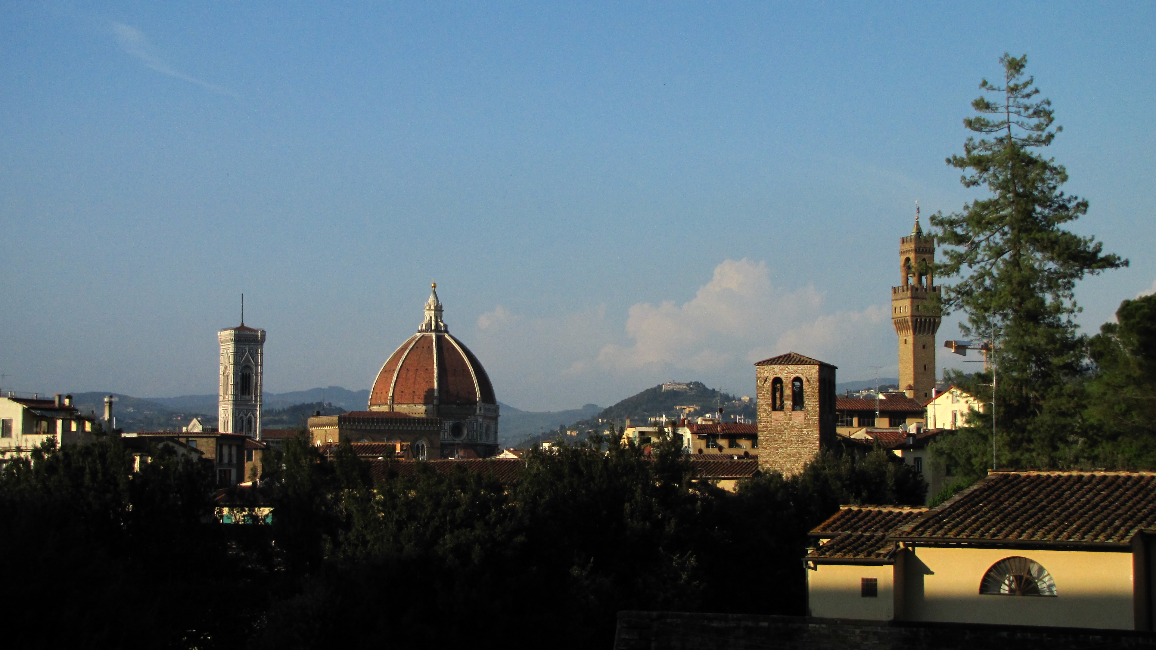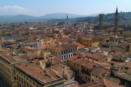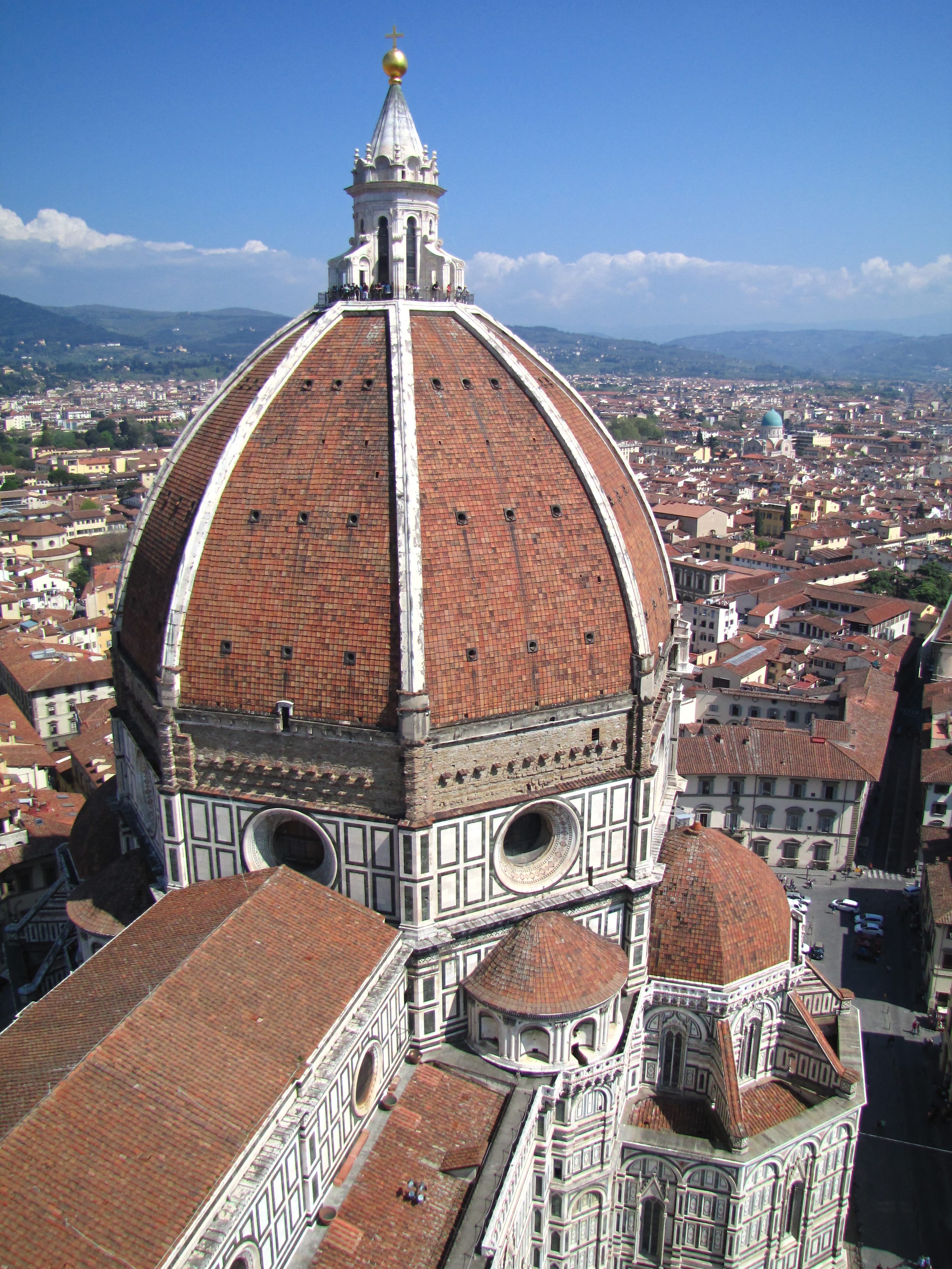 Hned za rohem od San Lorenza se nachází hlavní náměstí a na něm – přeslavné florentinské Duomo,  katedrála stavěná dvě století v kuse (na tom mne vždycky zaujme, že kolem chodilo několik generací lidí, kteří tu stavbu vždycky viděli jenom rozestavěnou).  Slavná kopule dómu byla první vztyčenou kopulí od doby antiky – a stala se vzorem například pro Sv. Petra ve Vatikánu.  Hned vedle Duoma stojí jeho campanila – věž postavená ve stejném slohu (a ozdobená stejnou úžasnou geometrickou fasádou z 19. století).  Plivly jsme si do dlaní a vyšplhaly jsme 463 schodů, abychom shlédly Duomo a celou Florencii z ptačí perspektivy. Jelikož v celém městě nemohlo nikdy být ze zákona postaveno nic vyššího, než samotné Duomo, rozhled byl skutečně velkolepý a nádhernou toskánskou krajinu zdobenou historickými domy jsme měly jak na dlani.