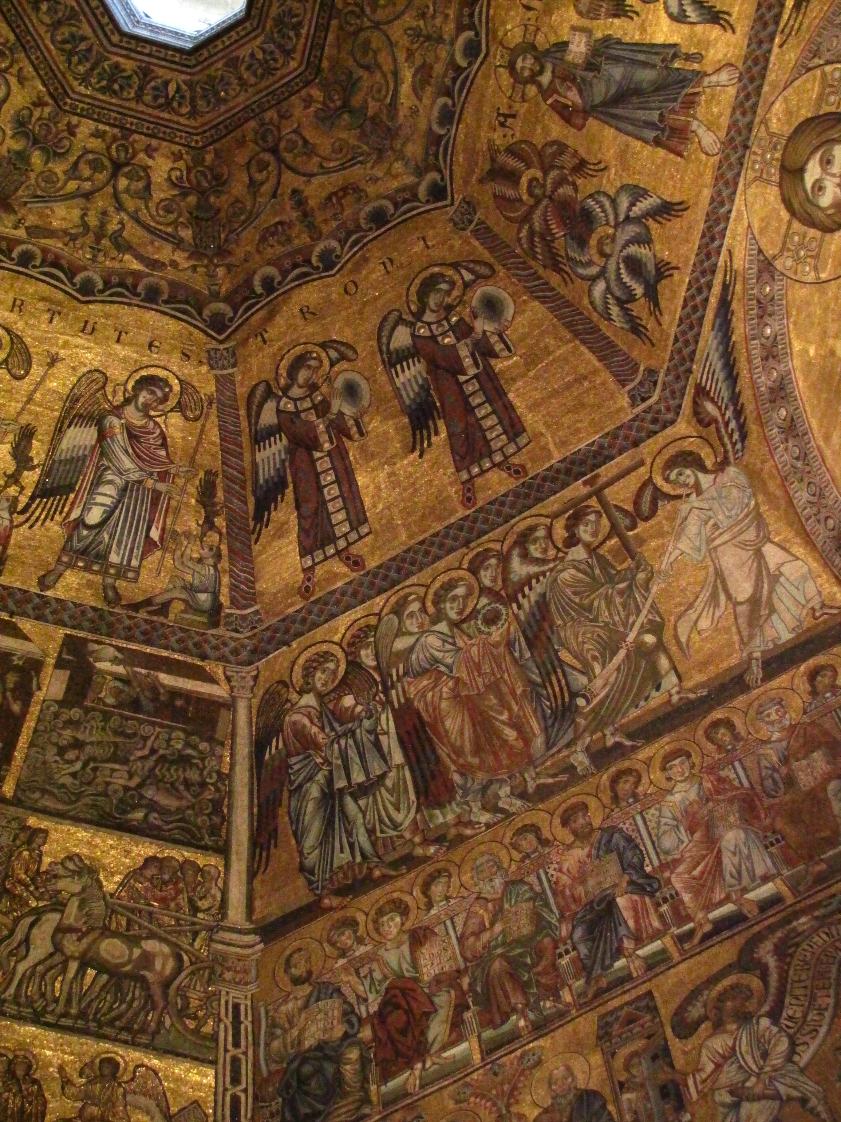 Před Duomem stojí nádherné babtisterium ve stejném slohu. Uvnitř je, narozdíl od toho pisánského, nádherné.  Osmiúhelníková stavba je prý nejstarší budovou v celé Florencii a zvenčí vypadá velmi impozantně. To ale nic nevypovídá o nádheře, kterou skrývá její tmavý interiér. Mozaiková výzdoba kopule ze 13. století vám převypráví Starý i Nový zákon v barvě a zlatě. Byla jsem úplně očarována – seděla jsem na lavičce pod kopulí a jenom fotila a zírala.