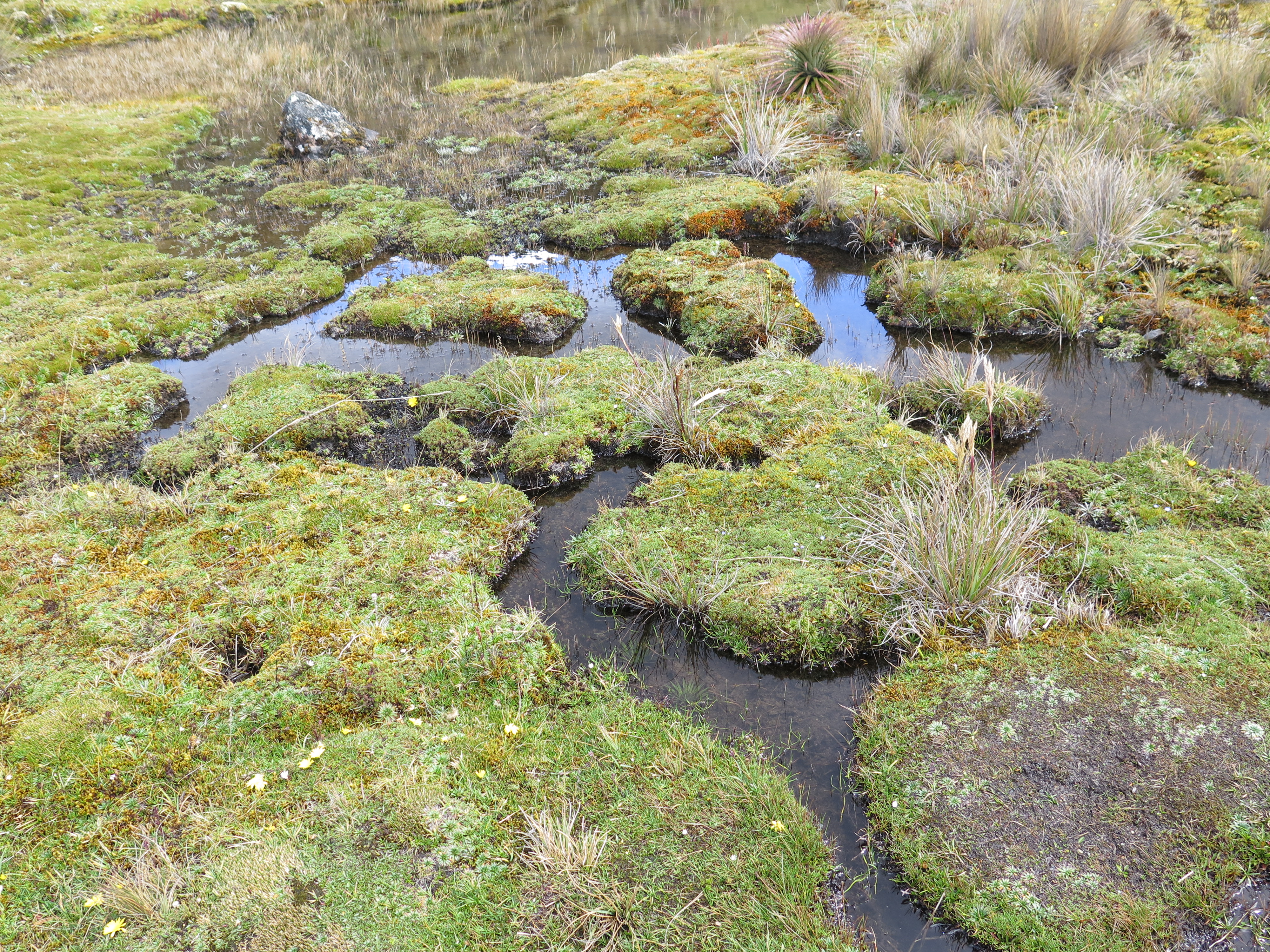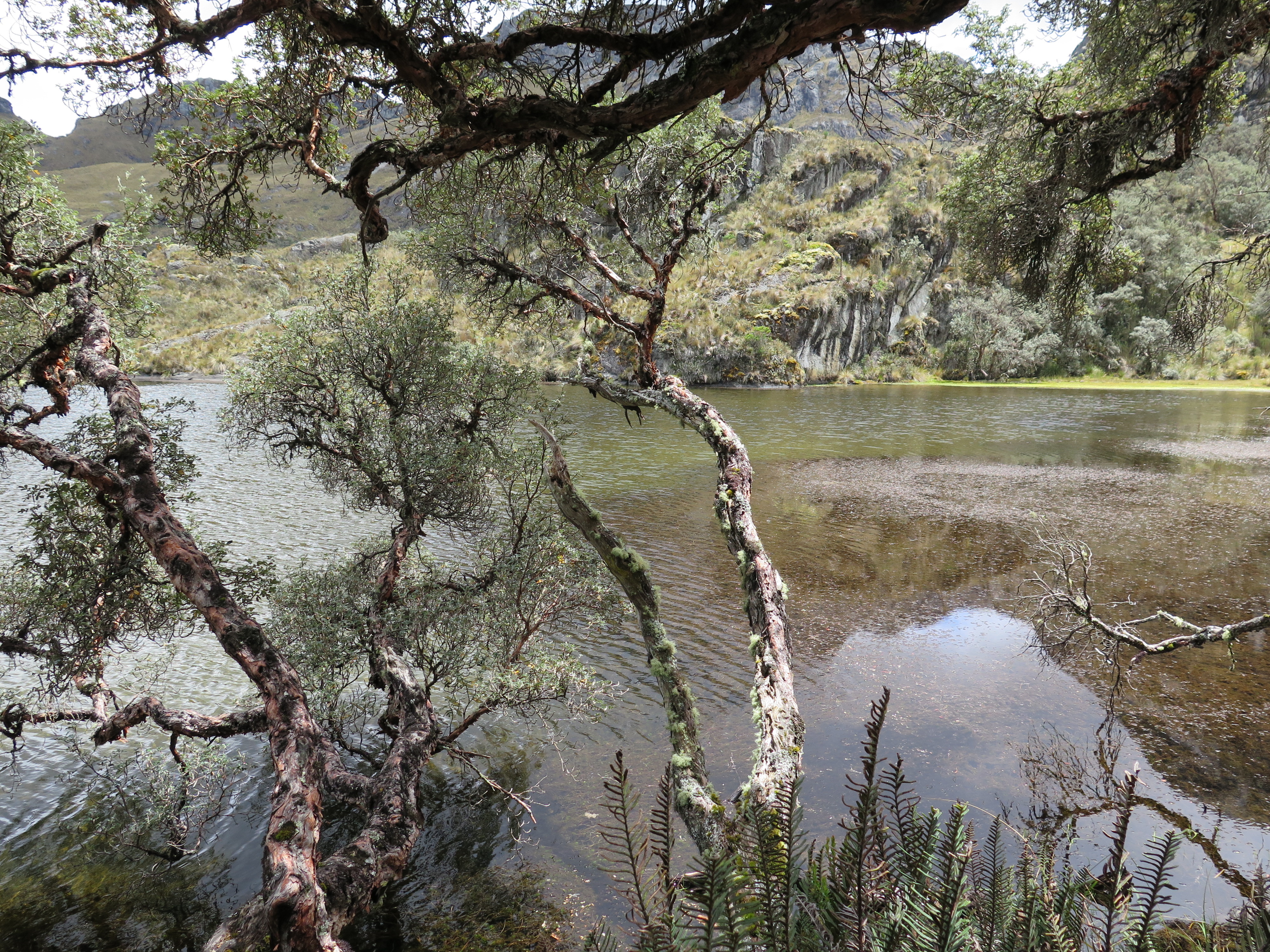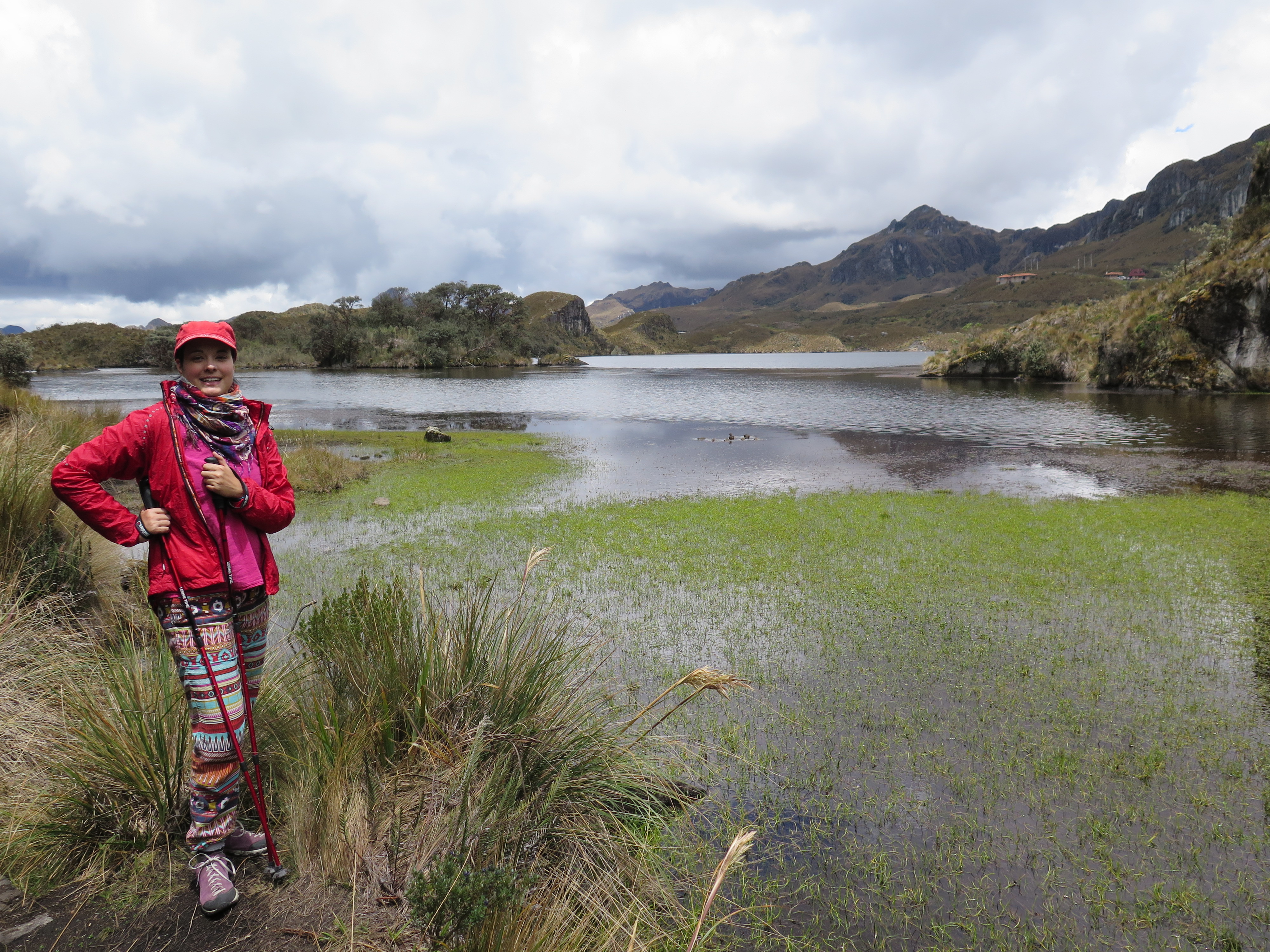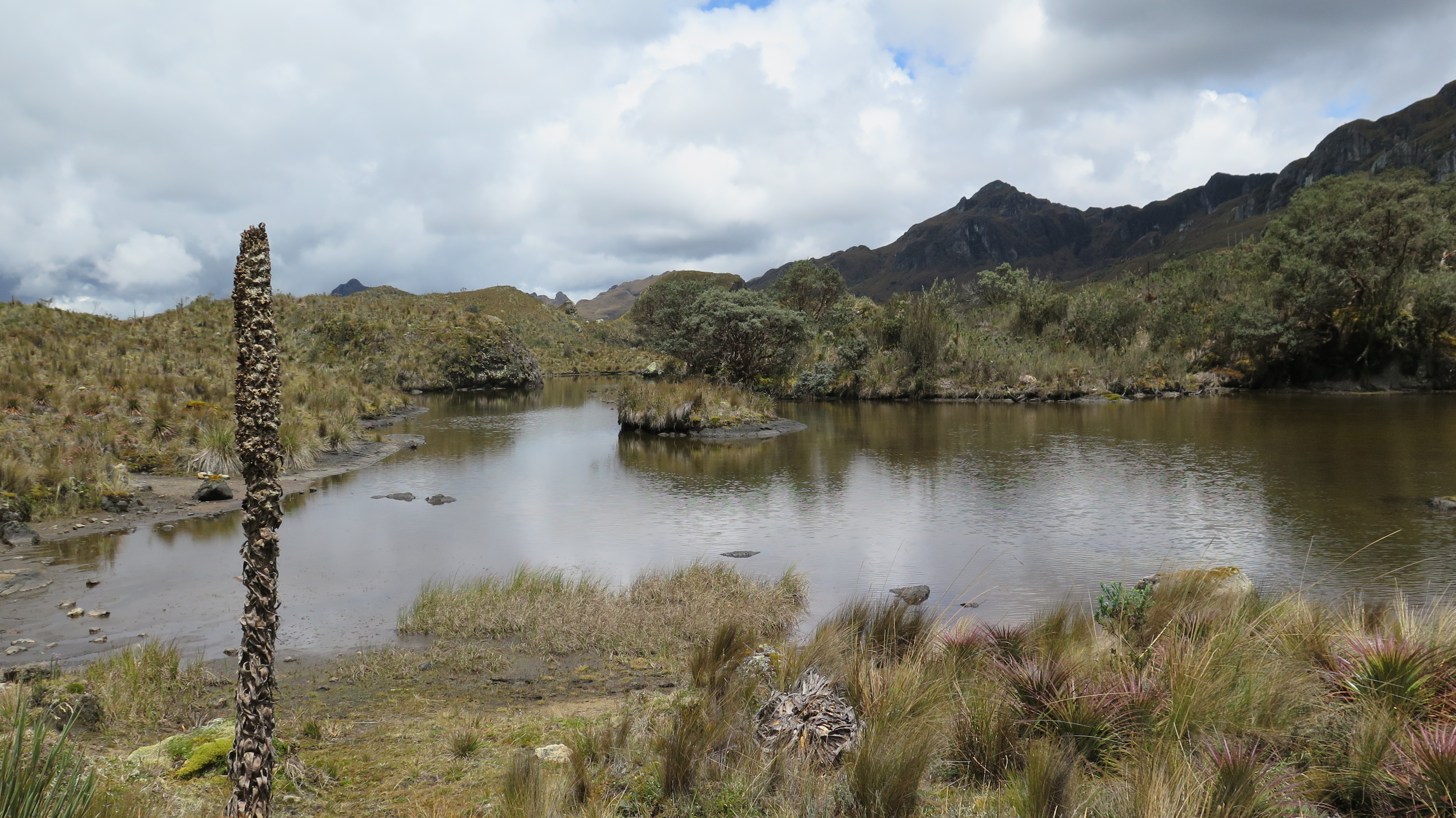 Pěšina kolem jezera procházela močály, mokřinami a zátočinami, stoupala a klesala podél jeho břehu, a já si to nesmírně užívala. Oproti Cotopaxi, kteréžto se nachází jen o trochu výš, a je to takový park – zabiják, je Las Cajas park přátelský. Všude zeleno, květiny, žáby, kačeny na vodě, ryby, něco jako racci….