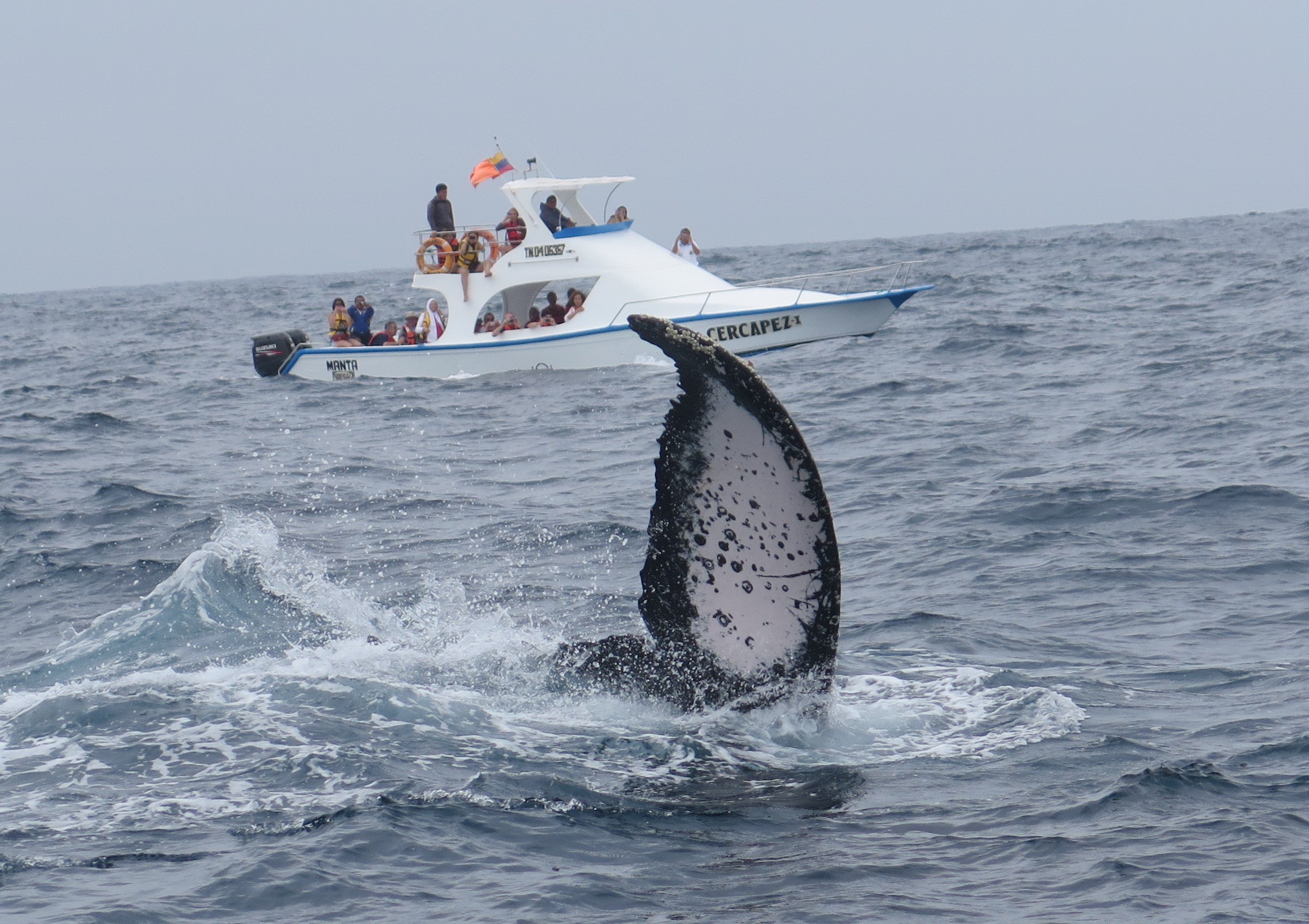 Kroužení a neskutečně ladný pohyb šestnáctitunových obrů ve mě vyvolává euforii. Nestíhám fotit, natáčet, jenom se slyším, jak vřískám stále dokola slovo VELRYBA. Protože končí sezóna, kdy u pobřeží Ekvádoru keporkaci rodí mladé, vůbec jsme nedoufali, že bychom nějakého mohli vidět. A najednou tohle!