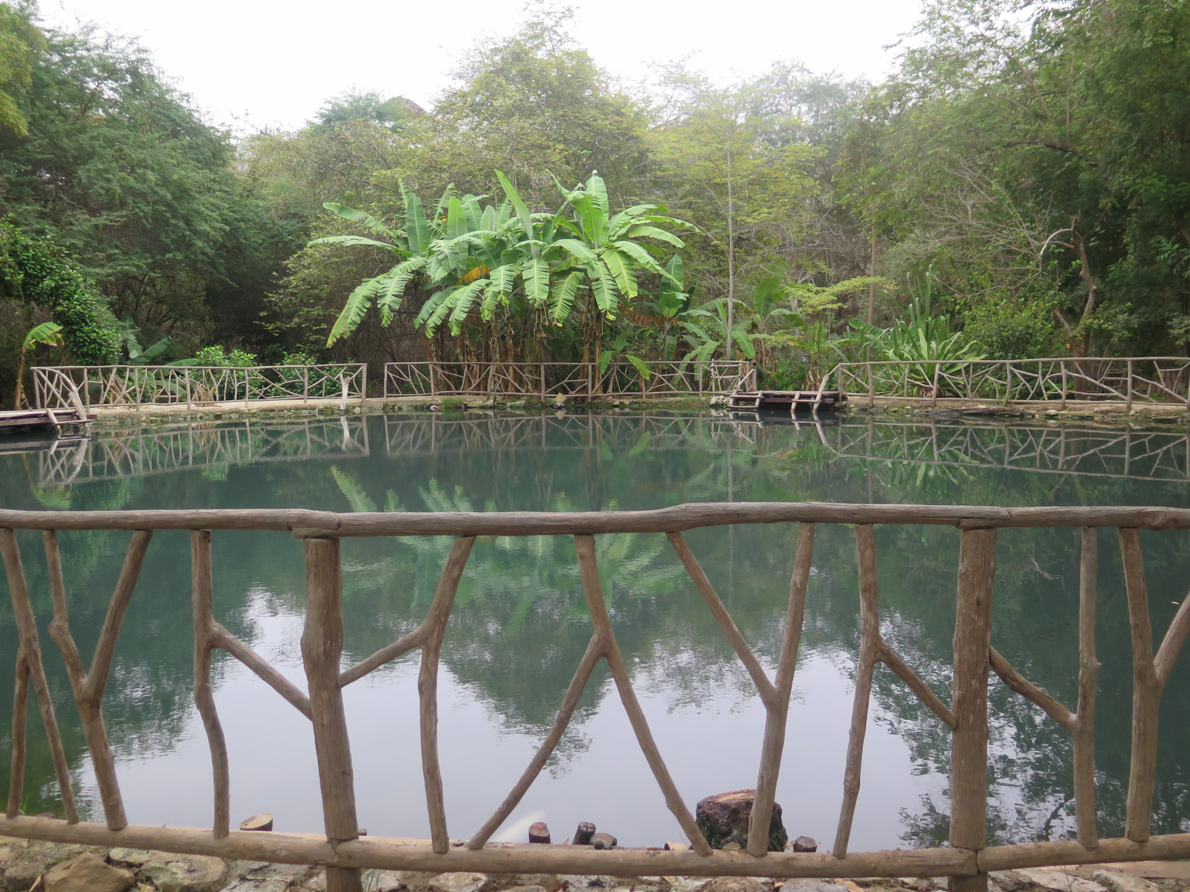 Pak jsme se podívali na naleziště. Průvodce nám po cestě ukazoval zajímavé rostliny (například mýdlový ořech – stačí si namočit ruce a chvíli ho mnout, on začne pěnit a krásně vás vydezinfikuje), ptáky a podobně. A nakonec jsme skončili u posvátné léčivé dvacetimetrové laguny tmavě zelenomodré barvy, vyživované sirným pramenem.