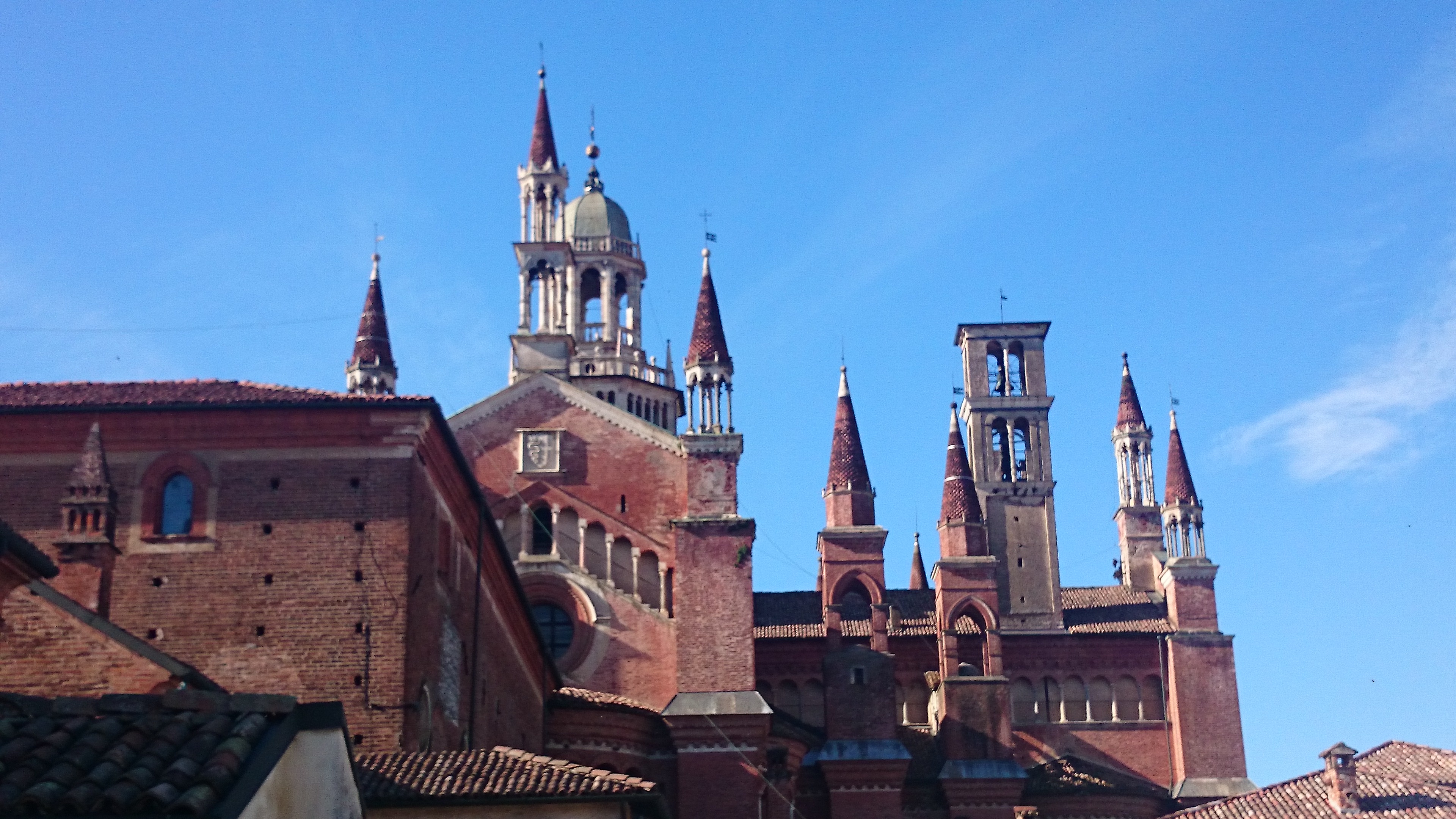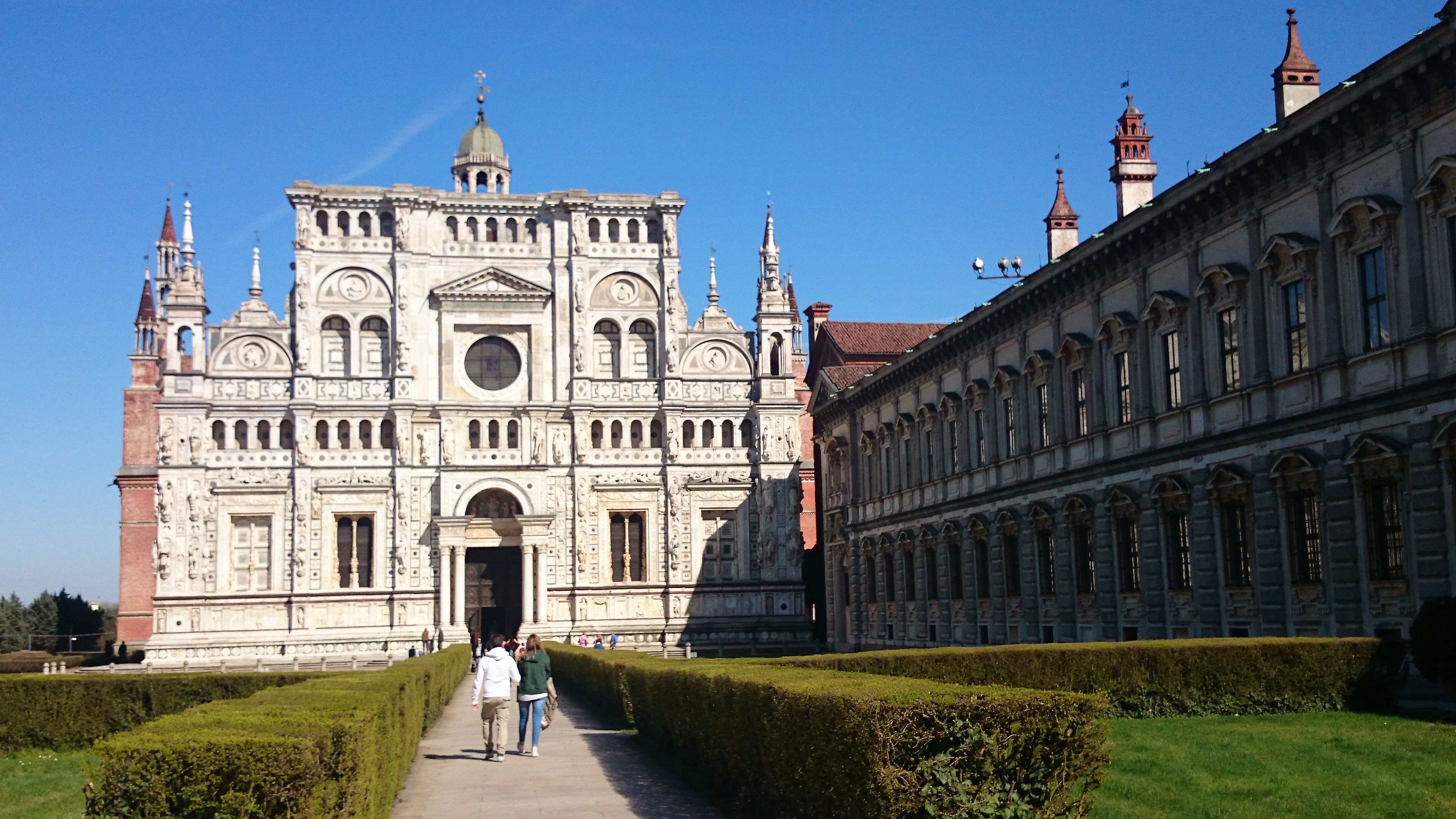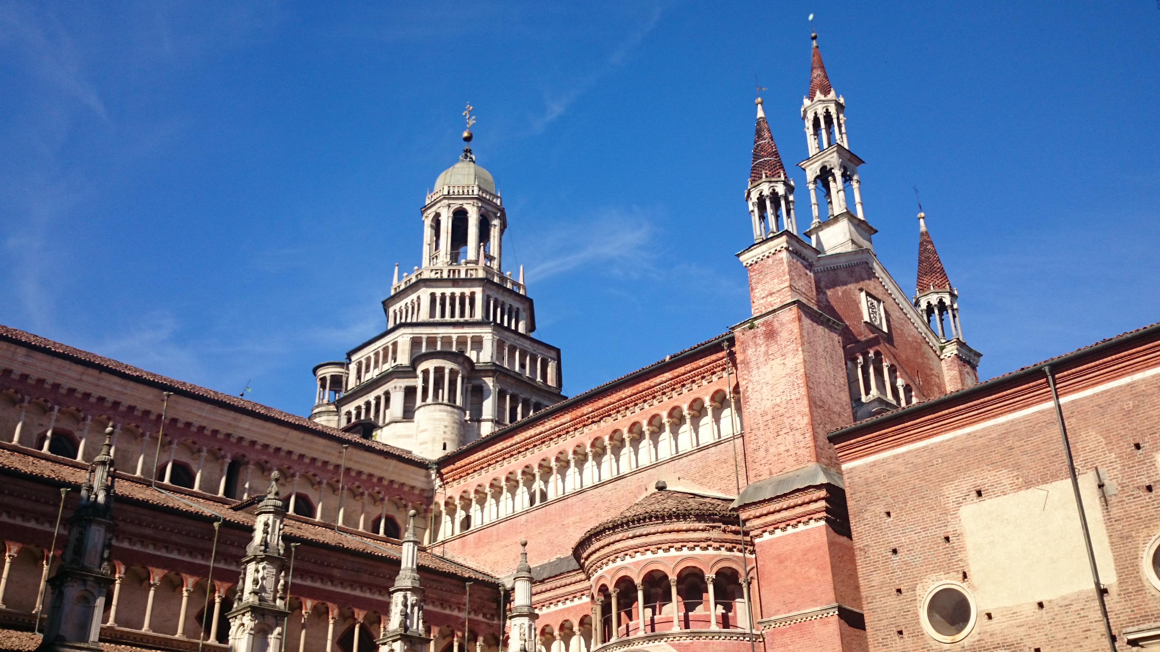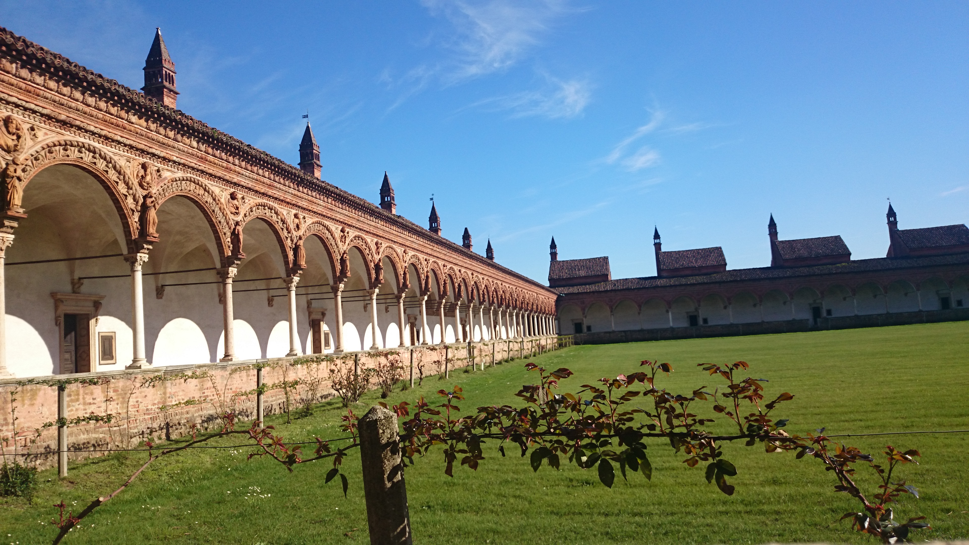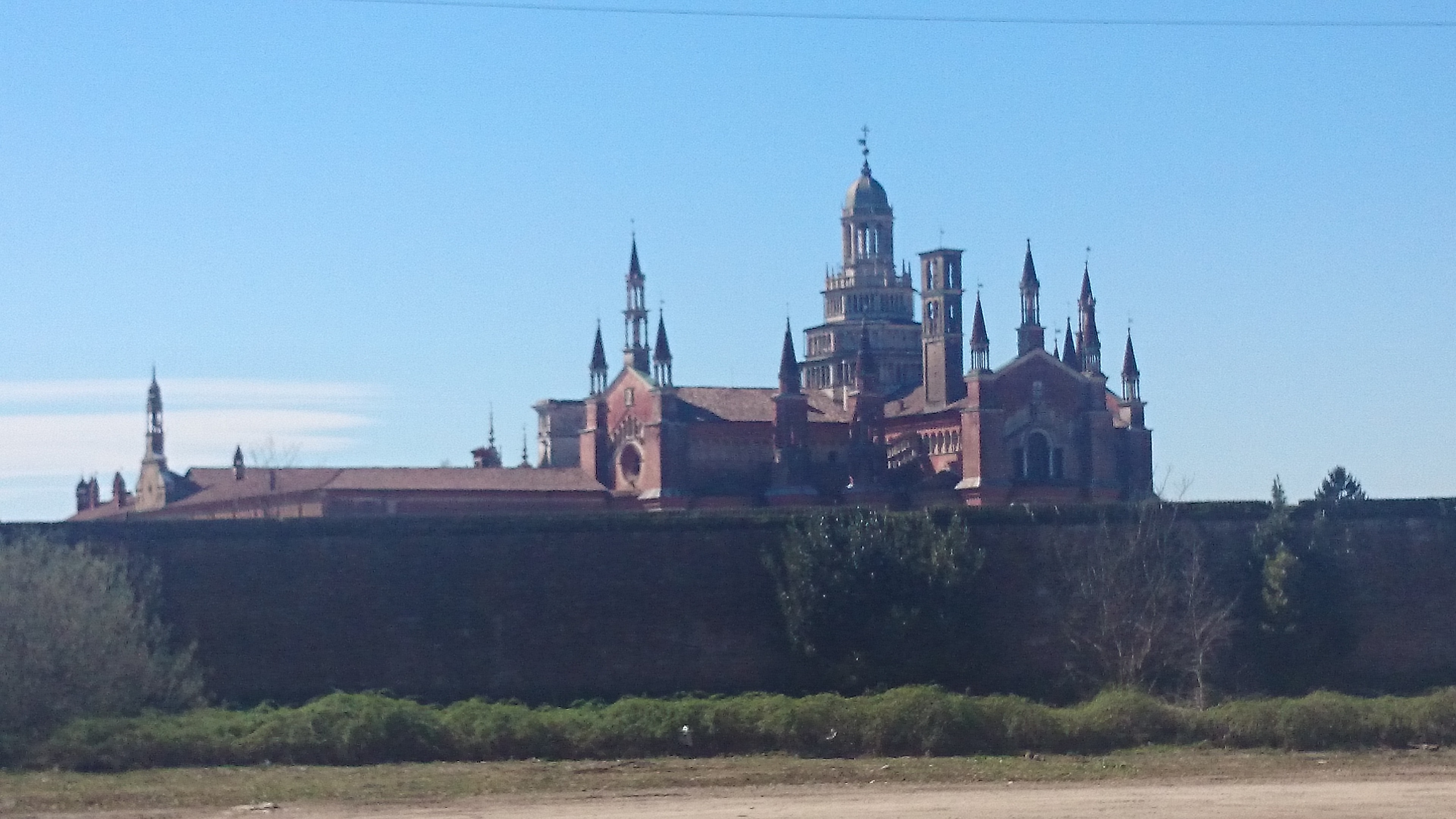 Minulý rok jsem psala o tom, jak jsme byly s Týnou na výletě ve městě Pavia, kousek od Milána. Po cestě vlakem jsme si všimly, že jednu zastávku před městem se dá vystoupit u krásného kláštera. A vypravily jsme se tam letos. Certosa di Pavia leží v rovinaté oblasti plné polí a zahrad, takže už z dálky můžete vidět rozmanité věže a věžičky kartuziánského klášterního komplexu vybudovaného na přelomu 14. a 15. století.