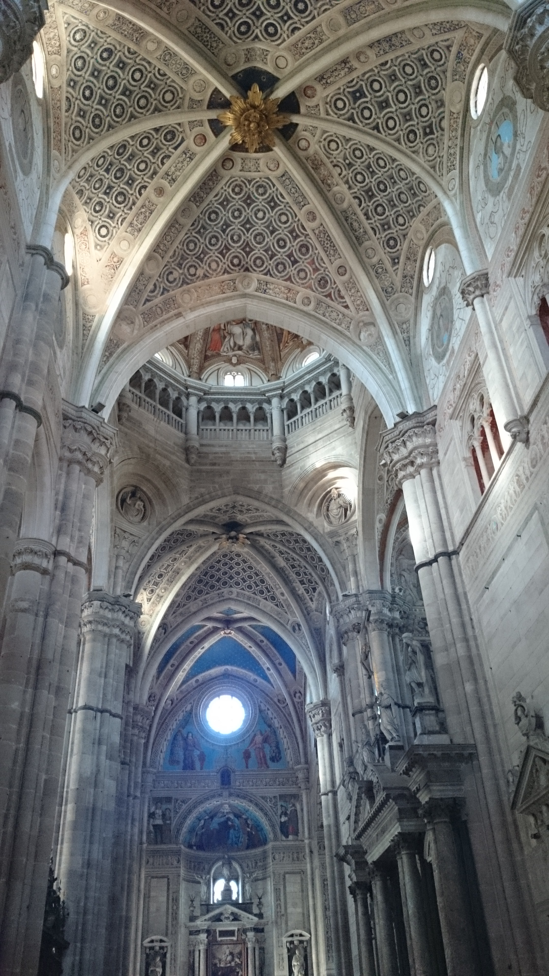 Katedrála je členěna do tří lodí, přičemž v přilehlých prostorách si můžete prohlédnout nejen oltář a malé kaple, renesanční oratorium s dřevěným obložením, ale i mramorový náhrobek s podobou vévody Visconti a jeho ženy, vyvedený do naprostých detailů, včetně záhybů vévodkynina pláště a třásní na polštářích. Nebo můžete obdivovat krásné kamenné intarzie. Já nechápu, jak něco takového mohli jen tak vyrobit. Taková práce, taková přesnost!