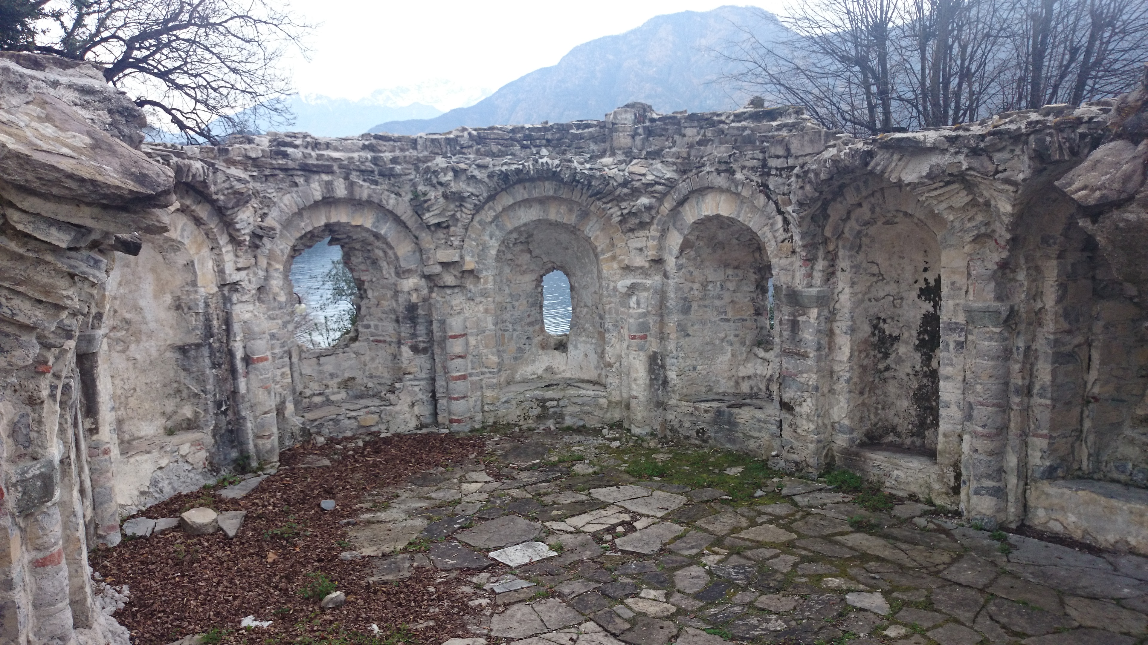 Asi po hodině plavby, kdy jsme obdivovaly krásné vily na březích jezera a Alpy v pozadí, jsme vystoupily na jediném ostrůvku na jezeře – miniaturním kopci vyrůstajícímu kousek od levého břehu v polovině jezera, těsně před jeho rozdvojením. Comacina, jak se ten kousek země jmenuje, byla osídlena již v římských dobách, pak na ní bylo několik kostelů a dnes jsou na ní dva malé kostelíky, restaurace a turistická trasa, po které se dá Comacina obejít kolem dokola za necelou hodinku.