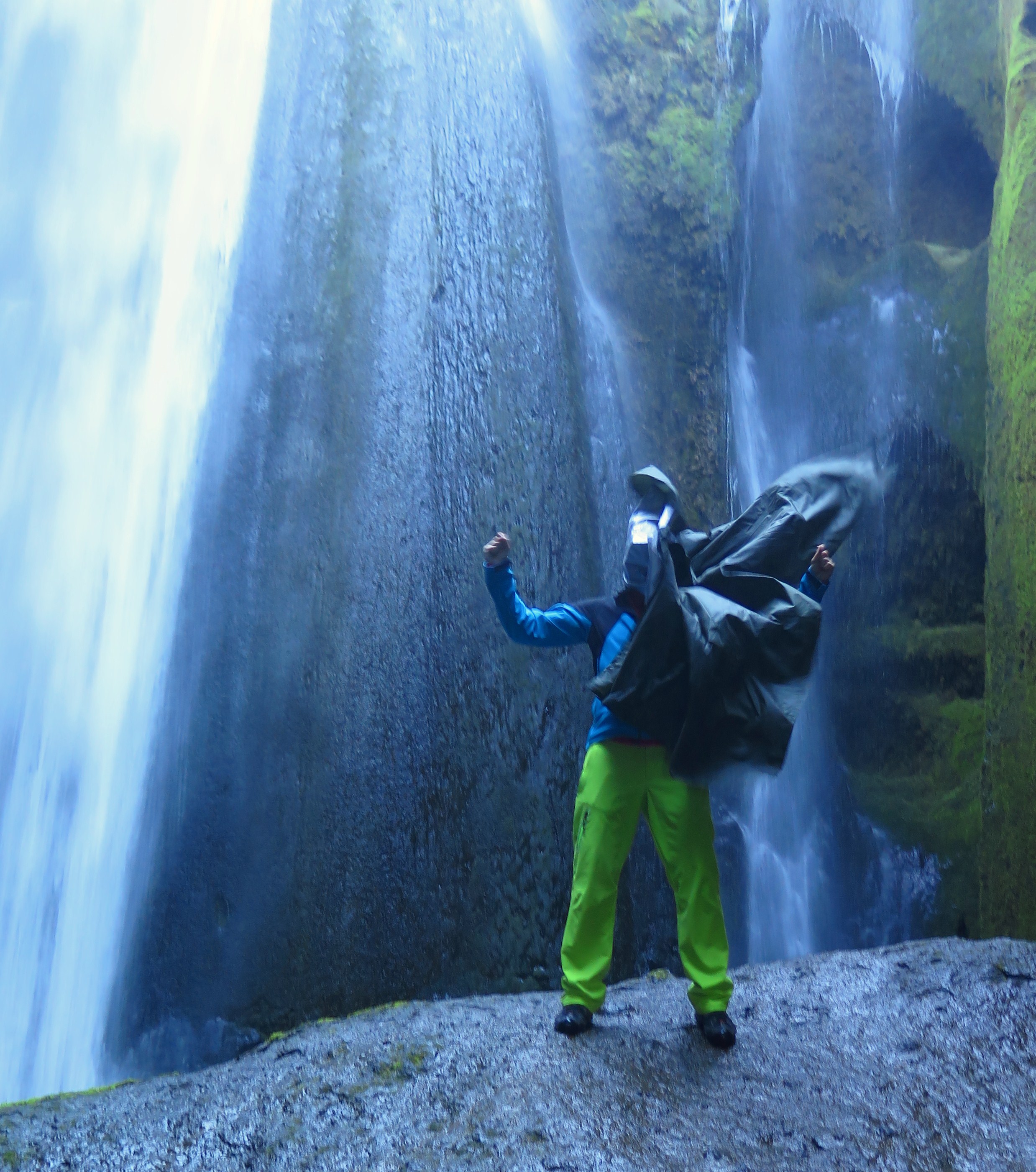 Poslušno přísloví o islandském počasí, ráno svítilo slunce jak o život a bylo dokonce třináct stupňů (!). Hned, jak jsme sbalili stan, šli jsme k vodopádu, pod kterým jsme spali. Čtyřicetimetrový Gljúfrabúi, to je něco neskutečného. Je z jedné strany skoro neviditelný a turisté, kteří se jedou podívat na Seljalandsfoss si ho někdy ani nevšimnou. A přitom stačí projít úzkou štěrbinou ve skále, širokou sotva metr, a vodopád se před vámi zjeví v celé své kráse. Voda padá do jakési jeskyně s příkrými stěnami, rozprašuje vodu, která se točí ve větrných vírech a ledově studí na obličeji. Níže vidíte důkaz, že pláštěnka je sice krásná a praktická věc, ale někdy na Islandu dost nepoužitelná :).