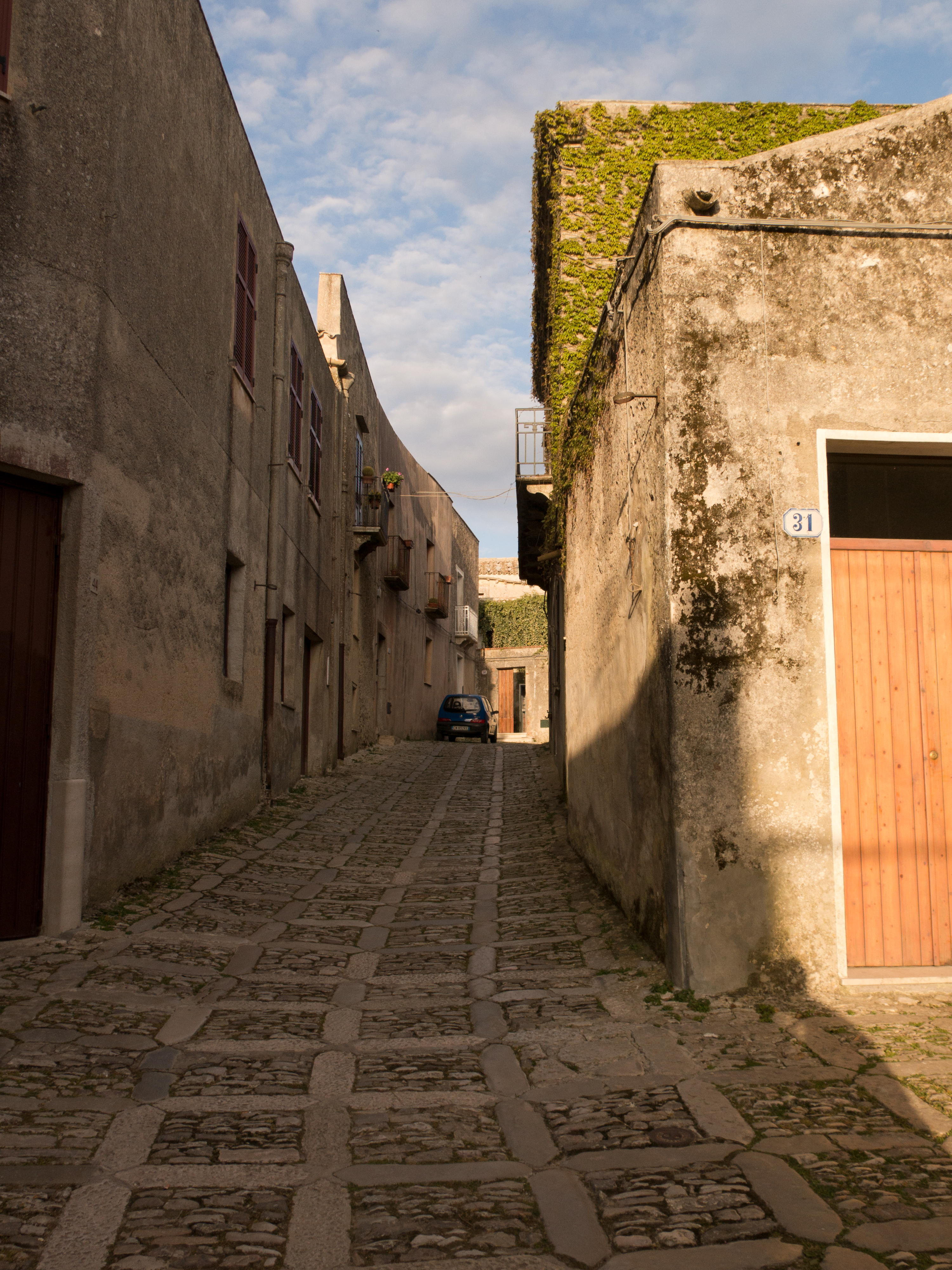 V záři zapadajícího slunce navíc kámen, z něhož je Erice vystavěno, dostává nádhernou barvu a všechny ulice se tiše zbarvují do růžových a fialových odstínů, než světlo zmizí úplně a město se zahalí do tmy, kterou čas od času prozáří lampa či osvětlené návěstí typické trattorie.
