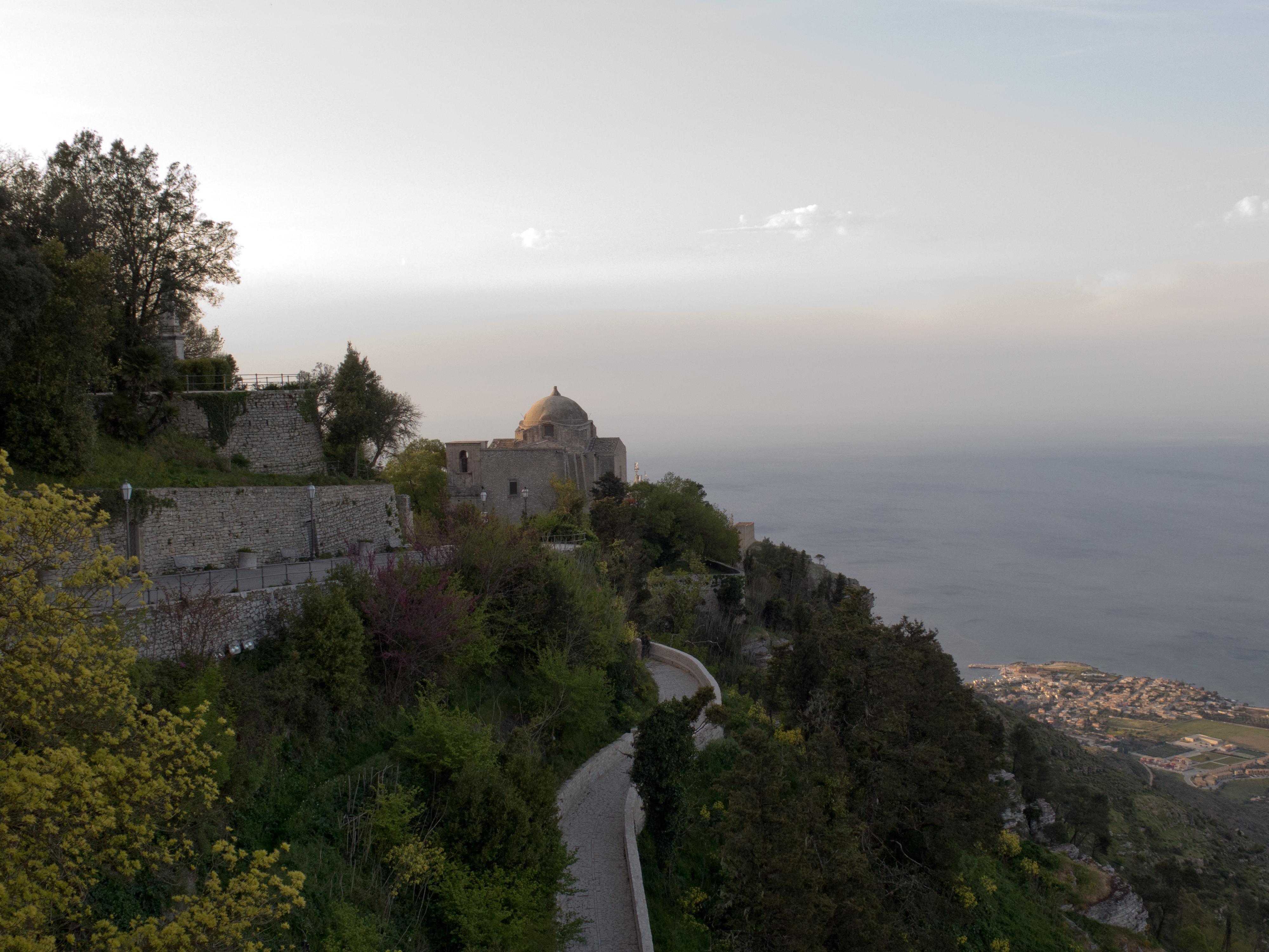 Jak je vidět z fotografie výše, ten „stín městečka Erice“ není nějaké obrazné vyjádření, ale prostý geograficko-fyzikální fakt. Erice se totiž vypíná 800 metrů nad okolní krajinu k sicilskému nebi jako koruna osamělé hory Eryx.