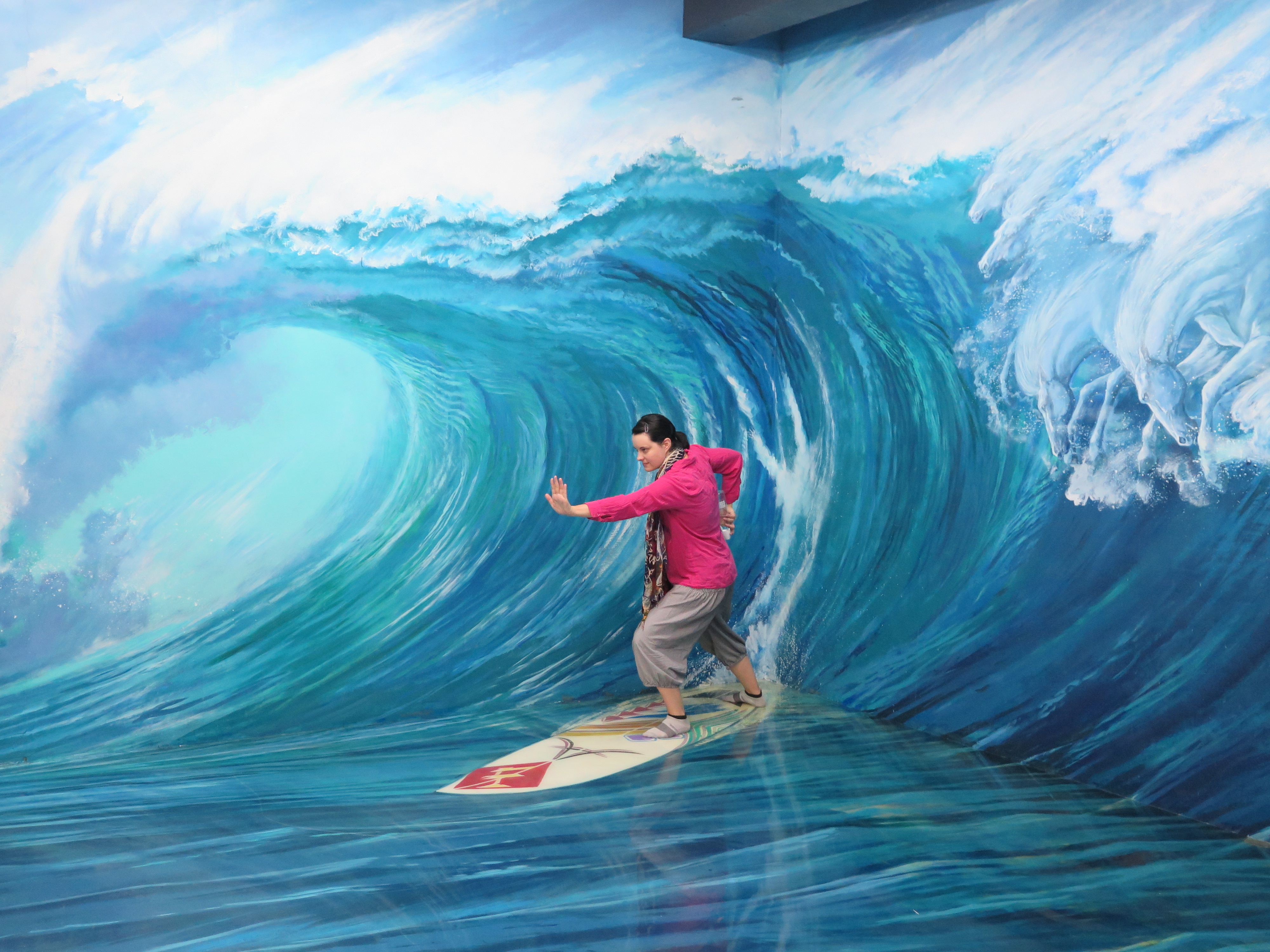 Asi hodinu jsme jeli taxíkem v největší dopravní špičce, kdy se kolona posouvala jen po metrech a nakonec jsme dojeli k relativně nově otevřenému muzeu 3D Artu podivně nazvanému – Art in island. Tam jsme se několik hodin bavili tu legračními, tu kýčovitými a tu chytře vymyšlenými obrazy obřích velikostí namalovaných na stěny a podlahu muzea. Jednou z podmínek vstupu do muzea je – sundat si boty a dotýkat se co nejvíce exponátů. Toho jsme samozřejmě bohatě využili, takže mám ve foťáku asi sto fotek, zobrazujících Kubu, jak se brodí řekou plnou krokodýlů, mě, vznášející se nad Grand Canyonem zavěšená pod balónky z nafouknutých zvířátek, Kubu závodícího se Santa Clausem v jízdě ze zasněženého kopce, a podobné laskominy. Když už jsme se dostatečně vyblbnuli, dojeli jsme na autobusový terminál, odkud vyrážel v deset hodin autobus na sever.