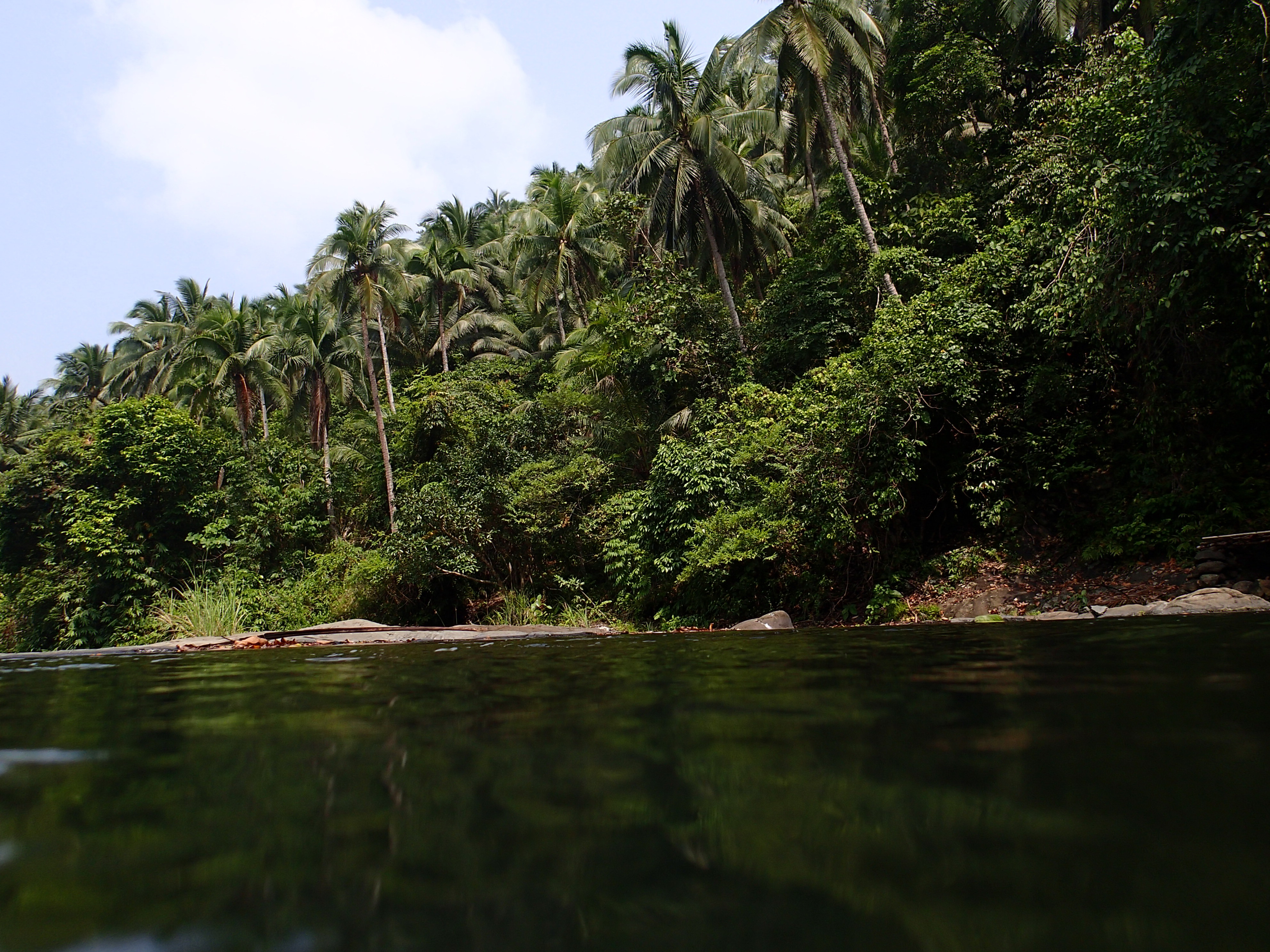 To už mám nacestováno celkem hodně, ale les kokosové monokulutry táhnoucí se široko daleko (a vysoko, protože pokrýval i celkem příkré horské srázy), to jsem ještě neviděla. Užívali jsme si téměř stoprocentní vlhkosti a pařícího slunce, vekých karmínově rudých vážek poletujících přes cestu, místních polonahých dětí, které nás pronásledovaly se smíchem a máváním, a bylo nám dobře. Po několika kilometrech jsme došli ke kamenným peřejím, pod nimiž byly malé tůně, jako stvořené na koupání. To jsme samozřejmě učinili a různě se pod vodopádky placatili, plavali a nechali na sebe dopadat vodu.