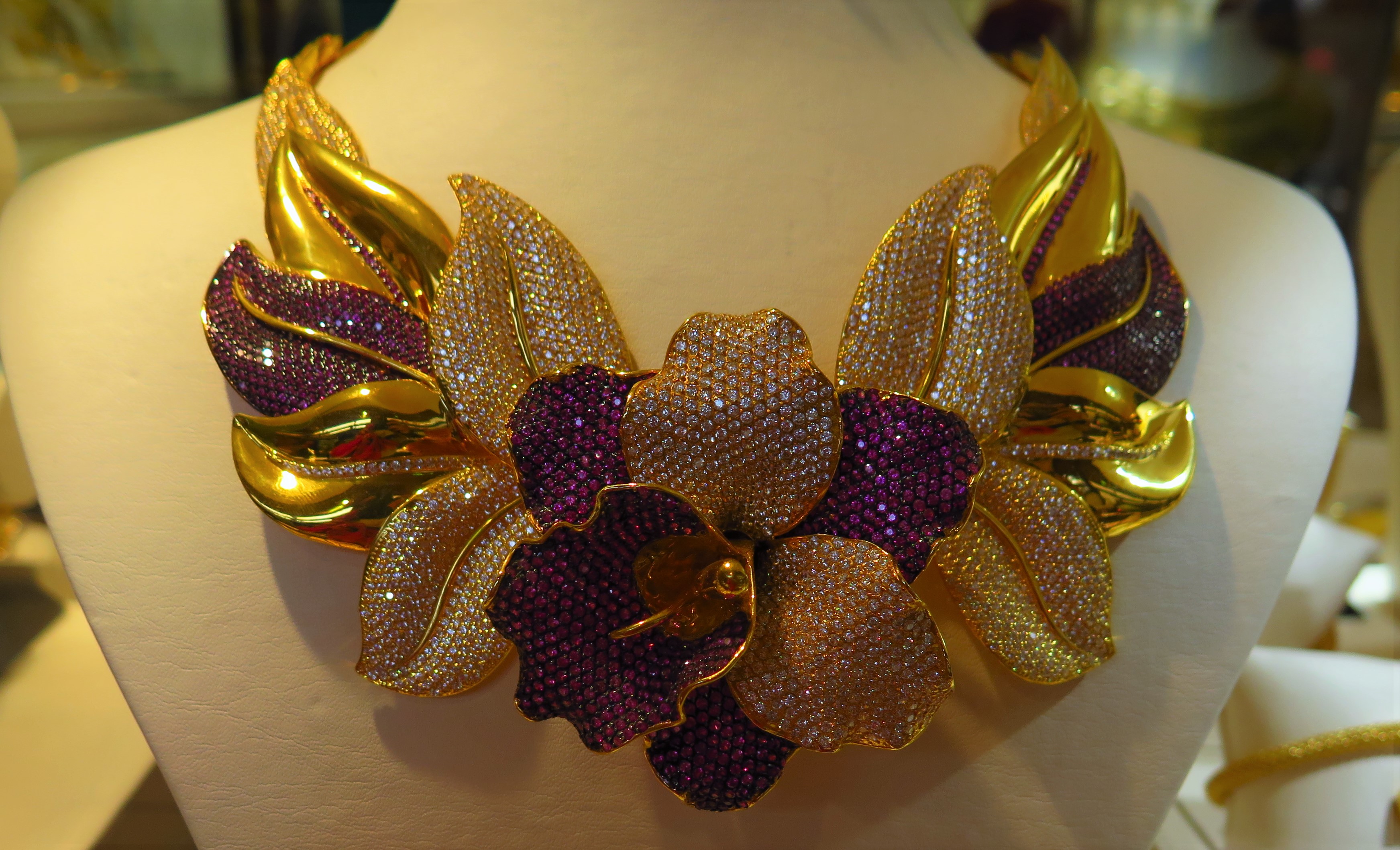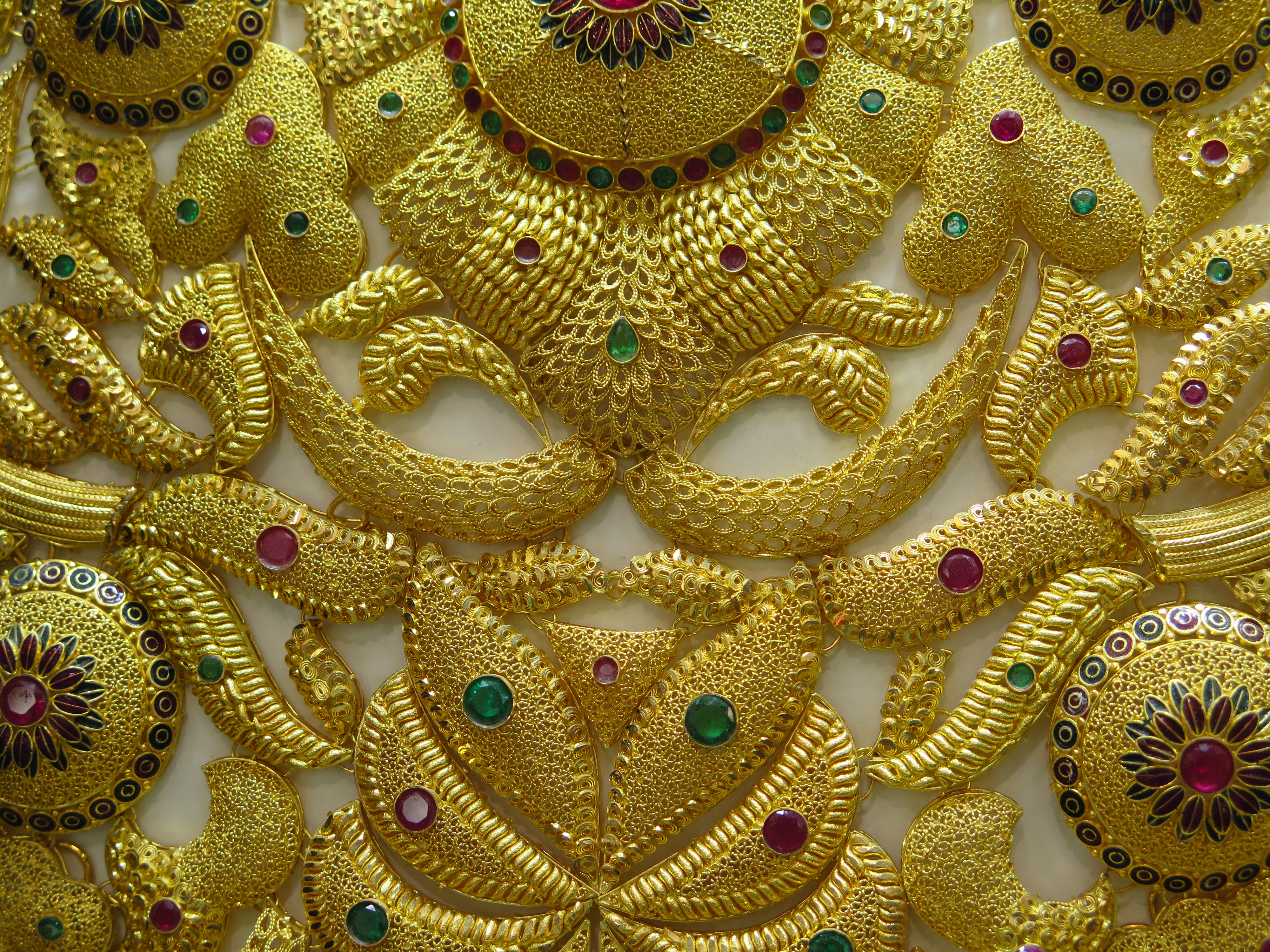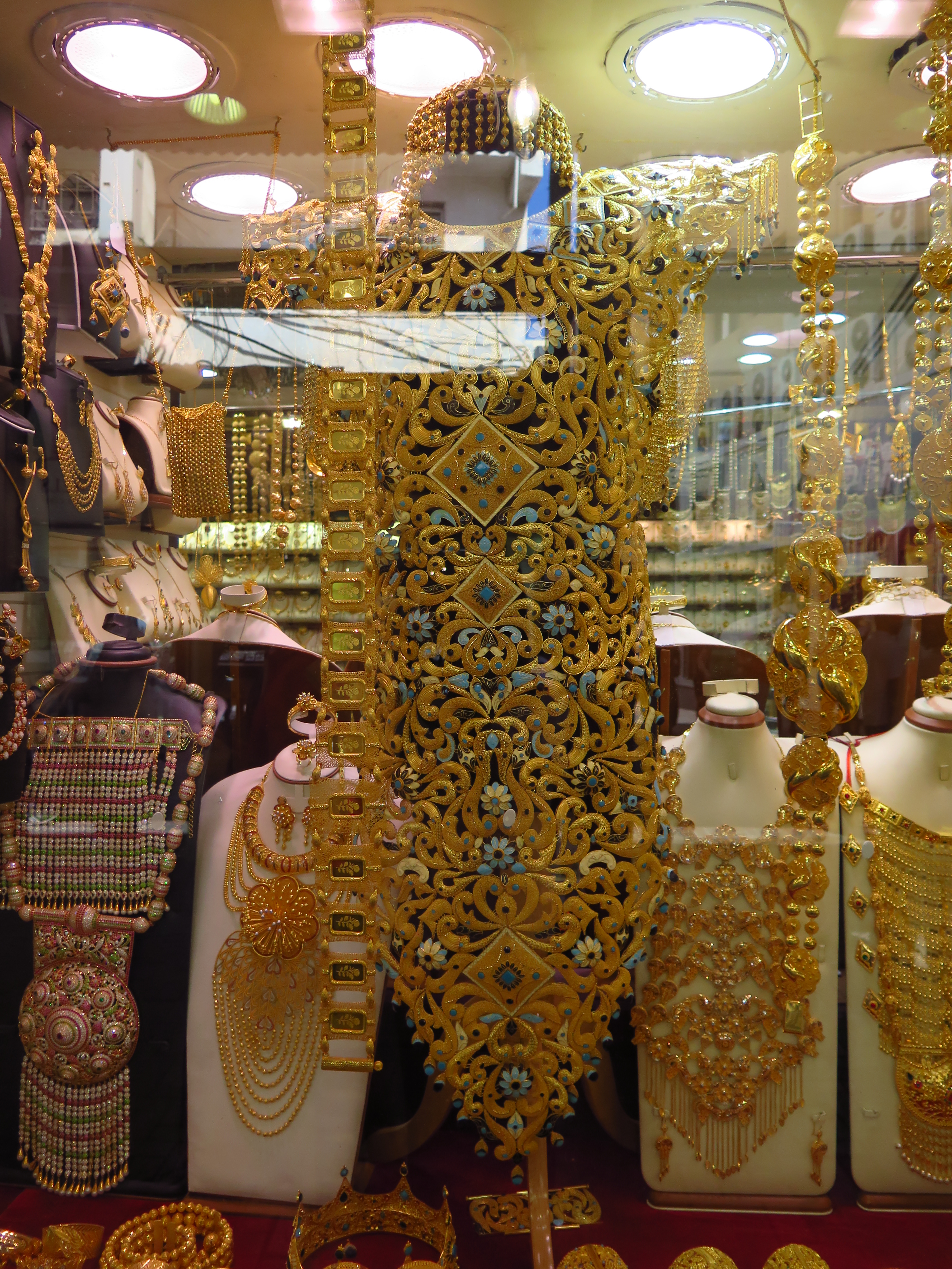 Přišli jsme brzo, takže většina krámků měla zavřeno, alepo chvíli se trh začal pomalu postupně probouzet k životu. V úžasu jsme hleděli na náhrdelníky obrovských rozměrů, které musely vážit několik kilo (a stály miliony), pokryté diamanty, mamutí náramky s masivními ozdobami z perel zvíci křepelčího vejce, i velikánské prsteny, mající na výšku třeba patnáct centimetrů.