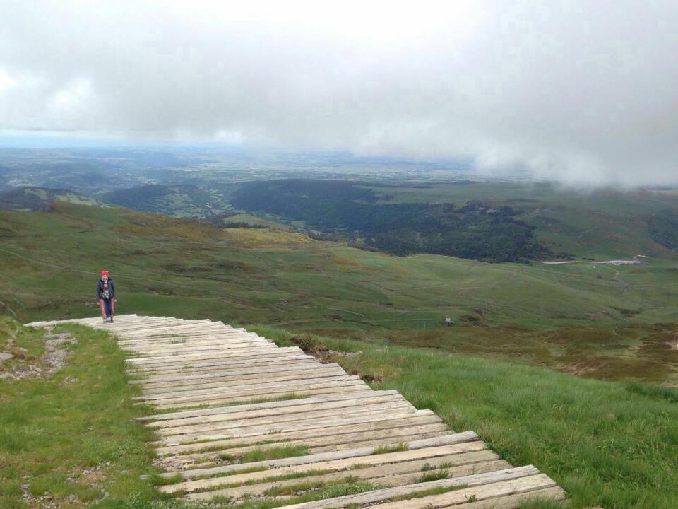 Po třech hodinách lezení do kopce jsme na hřebeni zmobilizovali své síly a rozhodli se vyšplhat na úplný vrcholek Plomb du Cantal (to je ta boule na obrázku výše). Vlekli jsme se chvíli po hřebeni a u úpatí onoho bobku jsme zjistili, že na něj vedou krásné dřevěné schody.