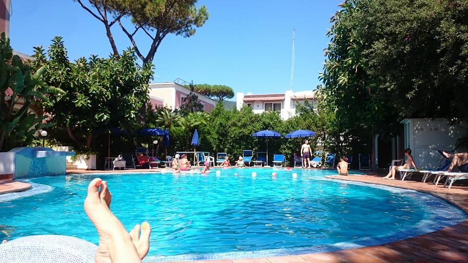 Termální lázně našeho hotelu jsme nakonec kvůli horku ani jednou nevyužili a ráchali se ve venkovním bazénu, kde bylo příjemně, nepřelidněno a s otevřeným barem. Je mi trošku záhadou, kam ty mraky lidí z hotelu mizely, když ne k bazénu – museli všichni jezdit transportním hotelovým autobusíkem na jednu takovou extra ošklivou šedou pláž hned vedle přístavu. Ty italské pláže, já vám nevim….to je tak hnusná věc, nechápu, jak si někdo může kazit dovolenou tím, že ji stráví deset centimetrů od nejbližšího pronajatého lehátka někoho zcela cizího… ale proti gustu, žejo…