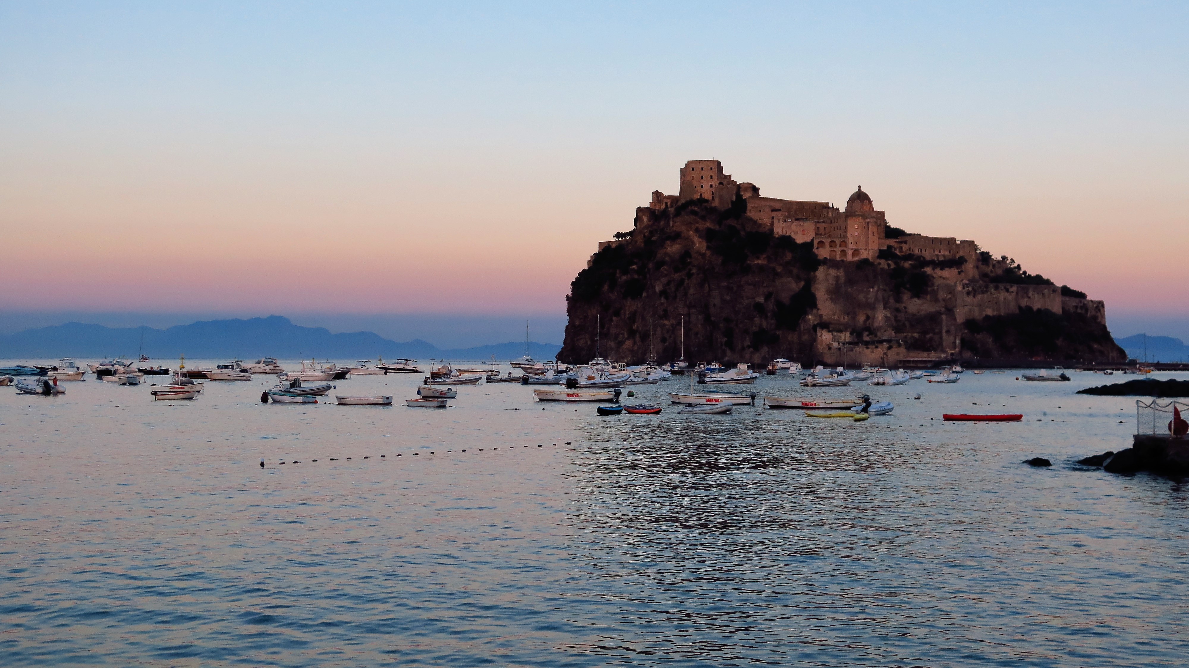 Nahoře v nejvyšší části hradu je luxusní restaurace, kam každý večer směřují vyšňoření hosté, aby pojedli něco od michellinských šéfkuchařů, zatímco se dojímají nad výhledy na rozsvícené ischijské pobřeží se siluetou Vesuvu na horizontu. Pokusili jsme se do ní proniknout, ale bohužel, bez dlouho dopředu udělané rezervace to bylo bez šance. Na druhou stranu, marná nebyla ani večeře na břehu mořském, odkud jsme mohli pozorovat rozsvěcující se Castello při západu slunce.