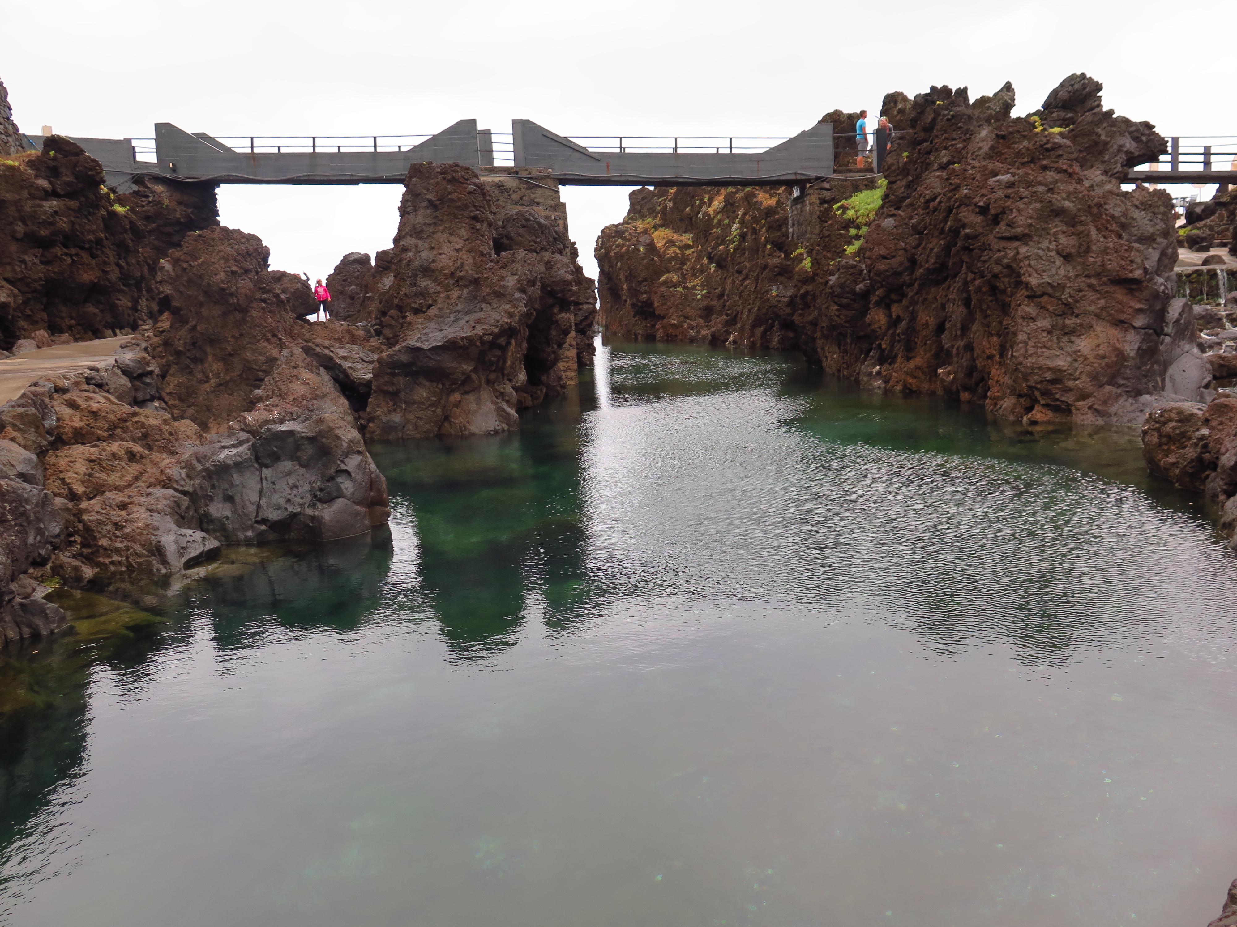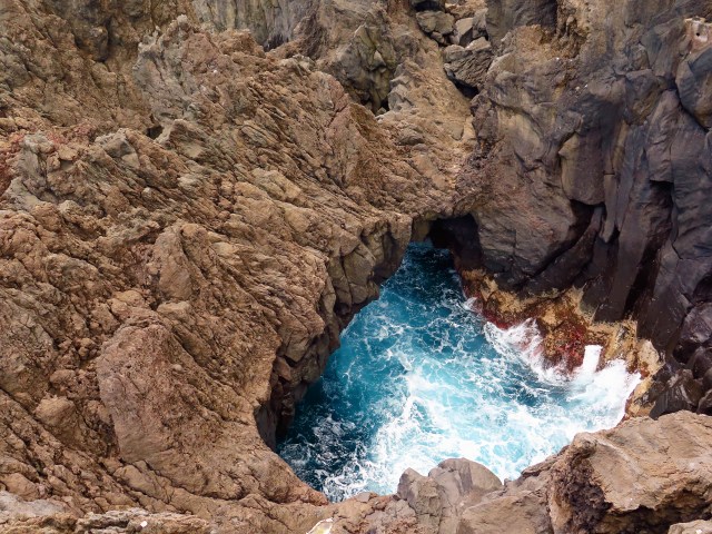 Na fotce níže není přírodní bazének, ale průrva prohlodaná mořským příbojem hluboko do skály. Voda proniká do oné obří studny podmořským tunelem a vydává při tom řev jako uvězněná pravěká obluda. Vodní tříšť stříká desítky metrů vysoko a nebesky modrá barva zpěněné hladiny vytváří krásný kontrast se hnědo červenou barvou sopečného kamene. Zájemci si mohou soustavou tunelů seběhnout na vyhlídku zhruba do poloviny skály a nechat se promáčet vodní pěnou při pohledu pěkně zblízka, ale opět, s tankem to nešlo. Navíc, Jarmily sladce usnuly, takže jsme využili příležitosti a rychle se naobědvali.