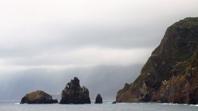 Tahle část Madeiry mi připomněla Island. Sice na něm nebyly palmy a sedmnáct stupňů byla světlá výjimka jednoho obzvlášť teplého letního dne, ale ony strmé holé skály prudce spadající do moře ocelově šedé barvy, oblaka válející se po hladině a prudký vítr, to všechno mělo pravou islandskou atmosféru. Třeba vidět tuhle fotku jen tak, bez kontextu, klidně si budu myslet, že jsem ji fotila na Islandu, a ne na Madeiře.