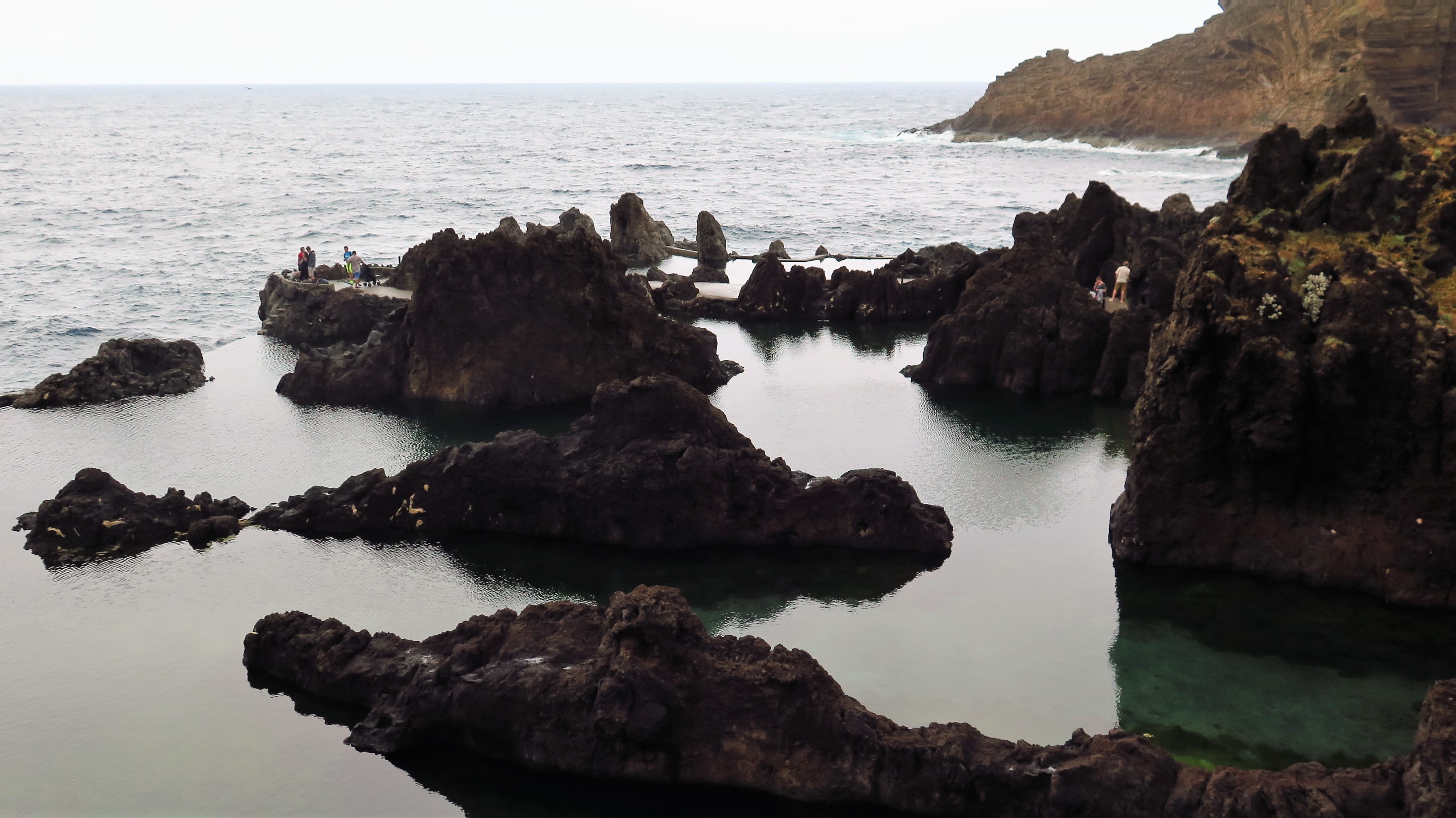 Naštěstí, než jsme je v autě stačili nakrmit, známé proměnlivé madeirské počasí nezklamalo – přestalo pršet a udělalo se celkem přijatelně pro procházku a oběd ve venkovní restauraci s výhledem na vodní bazénky.