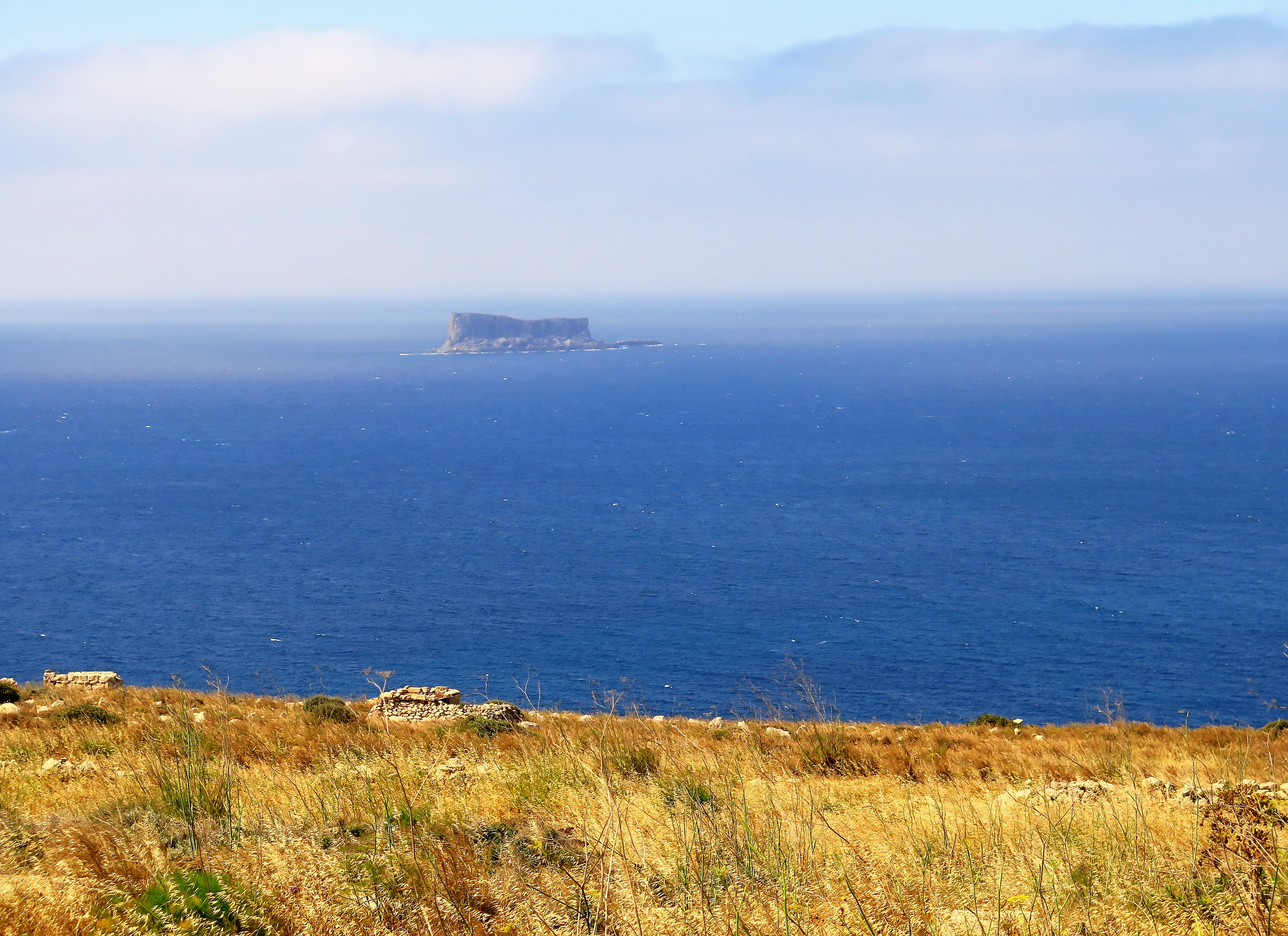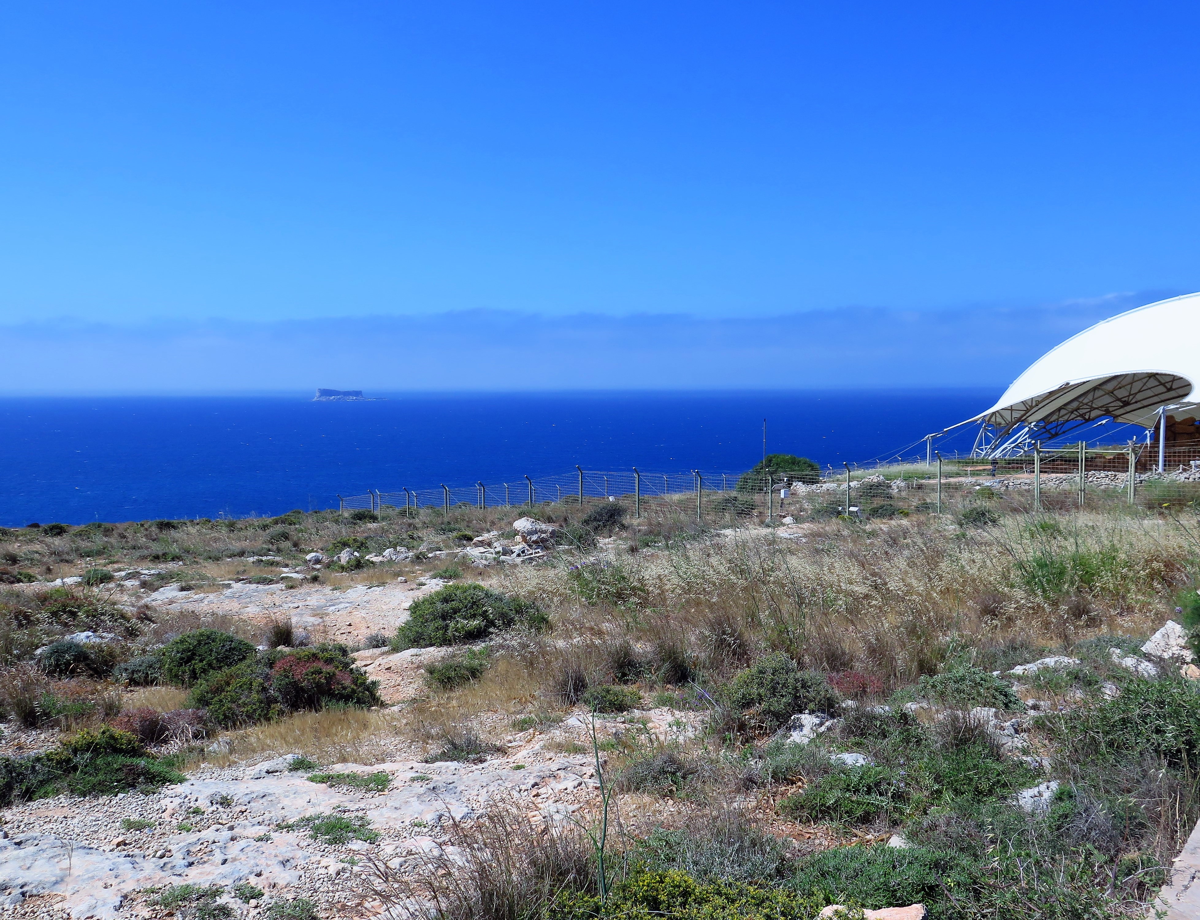 Od Hagar Qimu se do Mnajdry sejde po dnes vydlážděném chodníčku, protože Mnajdra narozdíl od prvního chrámu neleží na kopci, ale těsně na hranici mořského útesu. Ostrůvek Filfla (dnes ptačí rezervace, za druhé světové války místo pro zkoušení leteckých pum) pak v dálce vypadá jako majestátní loď plující v oparu poledního mořského obzoru.