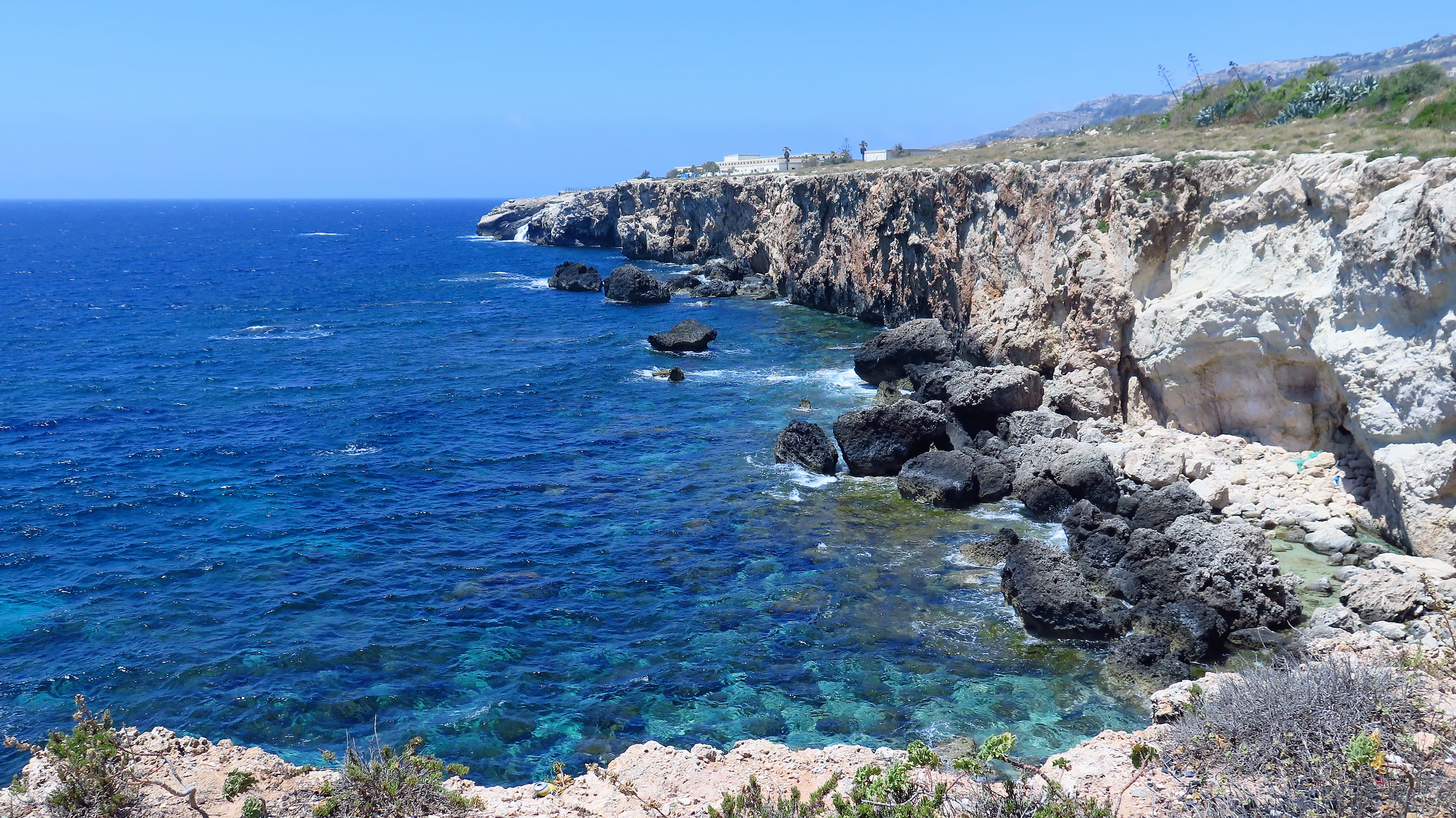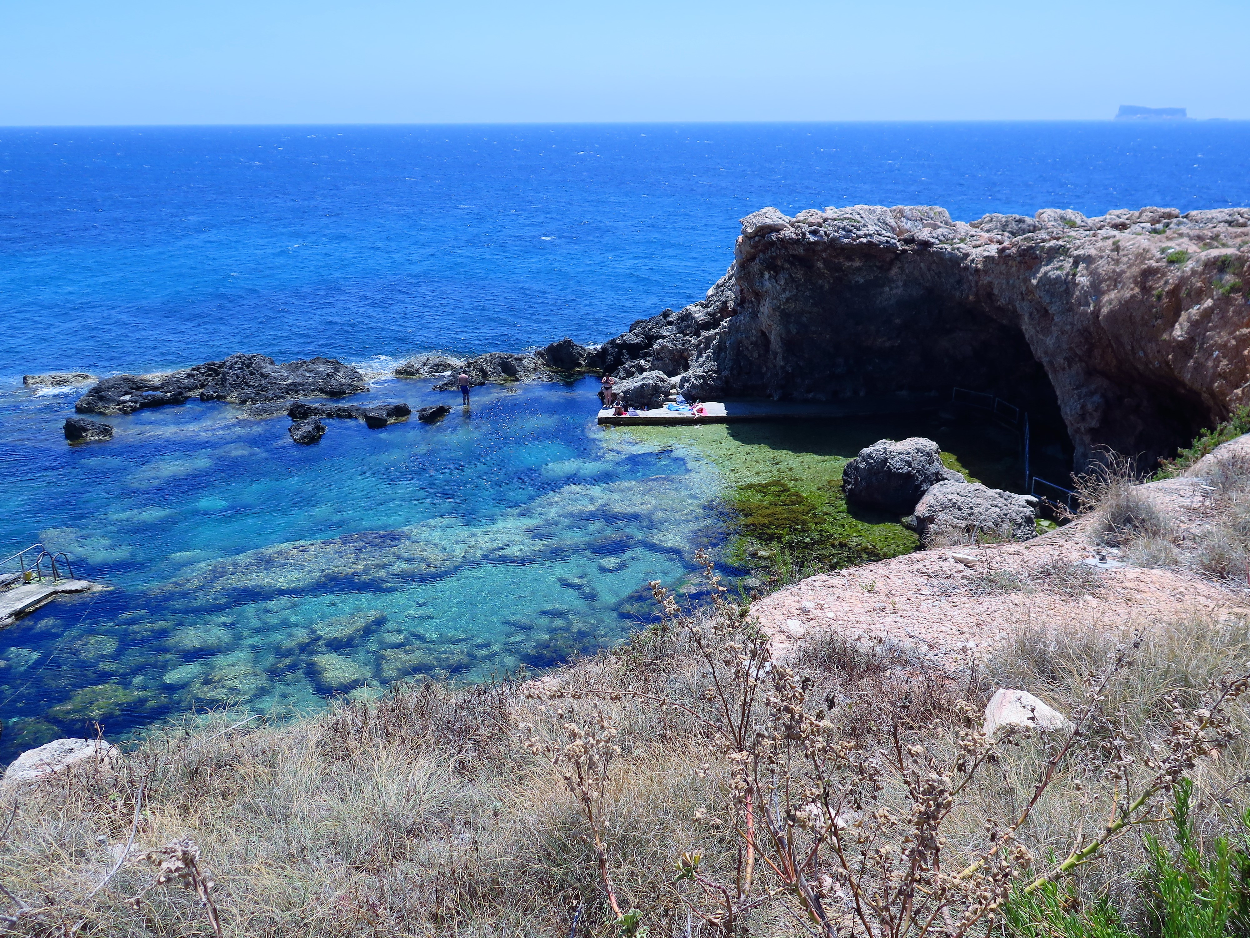 Východním směrem stále po pobřeží se nachází krásné scenérie bílých, vysokých a strmých útesů, tyrkysově modrého moře a barevného jarního porostu břehů. My jsme zakotvili v Ghar Lapsi, místě, kde se vlny s pevninou setkávají soustavě jakýchsi přírodních koupacích bazénků. Napřed jsme se na to najedli v krásné restauraci s výhledem na moře (jupí, DVĚ dětské židle), načež jsme se jali seznamovat Jarmily s mořem. Jelikož se však v něm pravděpodobně chtěly utopit, omezili jsme moře zatím na minimum, zato jsme je vysadili do houpaček na vrcholu útesu, kde nastala spokojená půlhodinka. Lítaly si vysoko nad zemí, s magickou Filfou v zádech. Jak jsem říkala dřív, na Maltě jsou houpačky všude, pro děti ideál.
